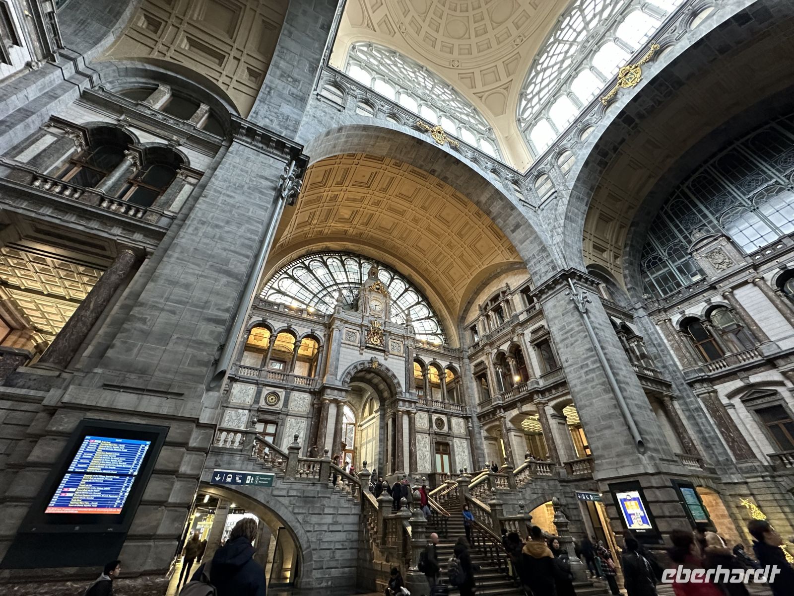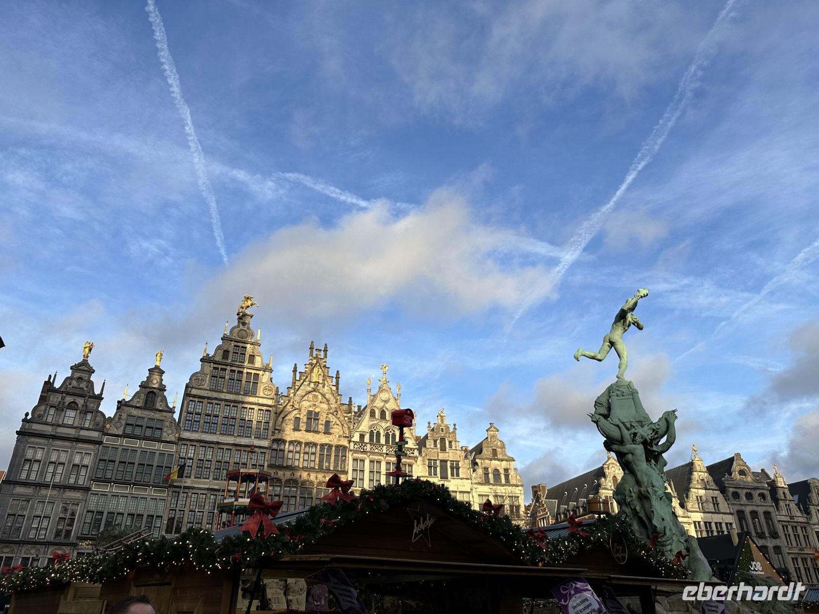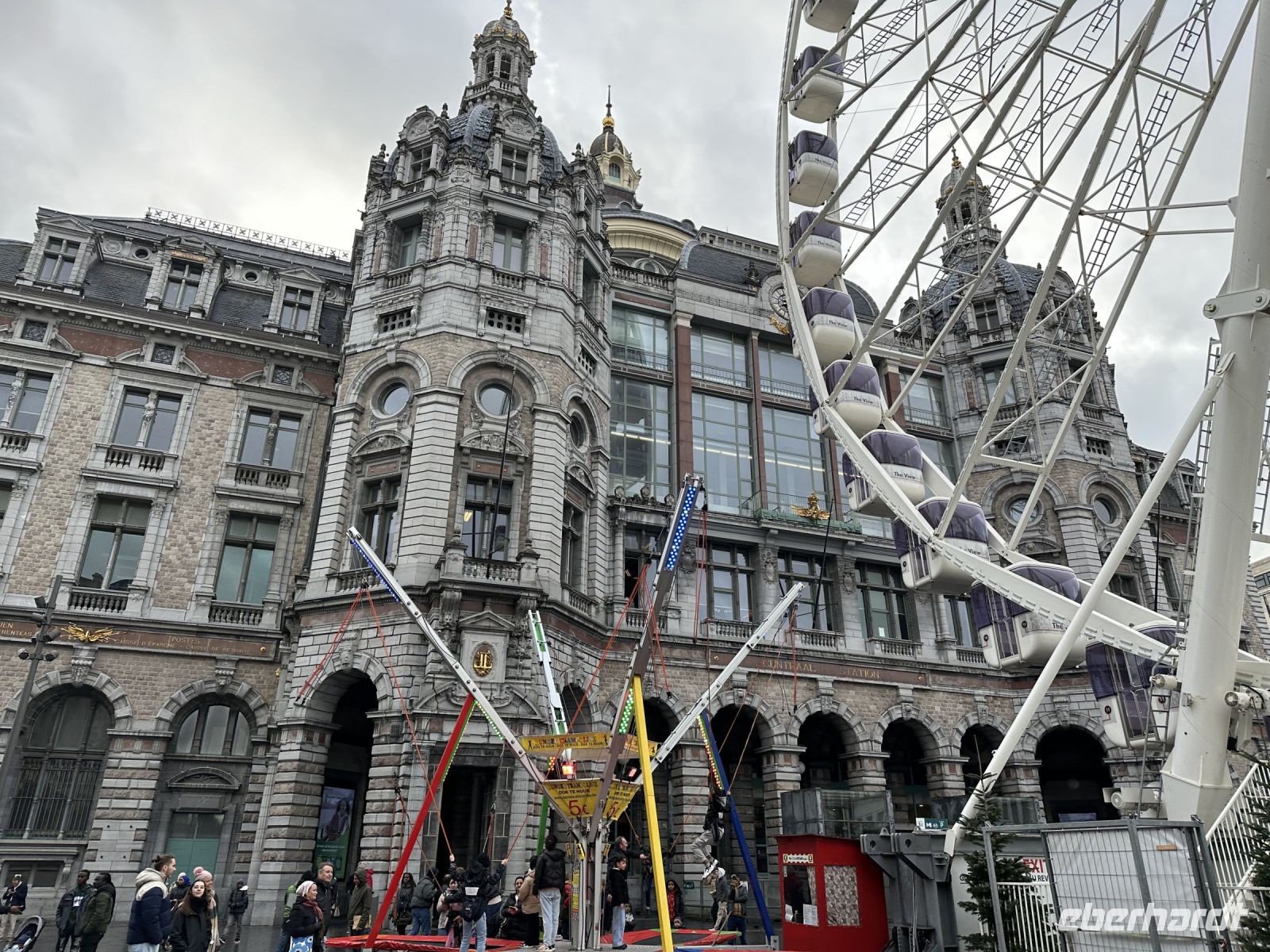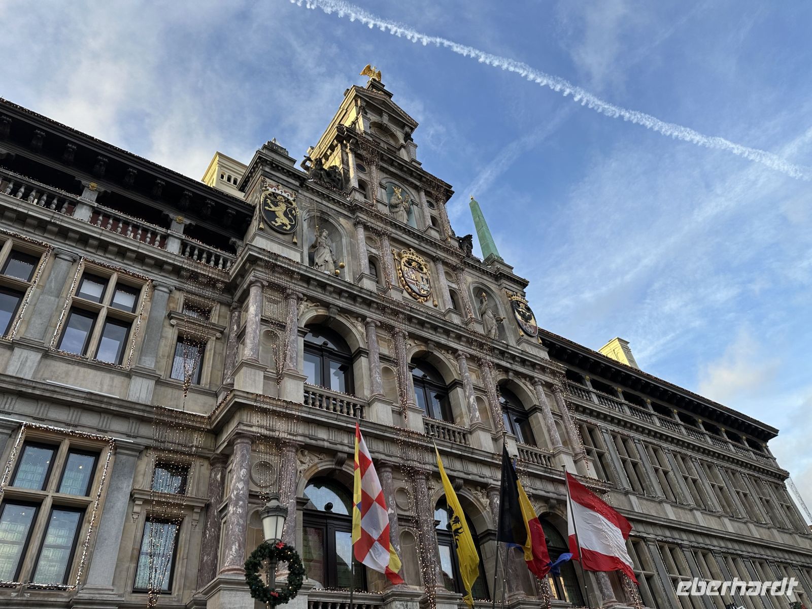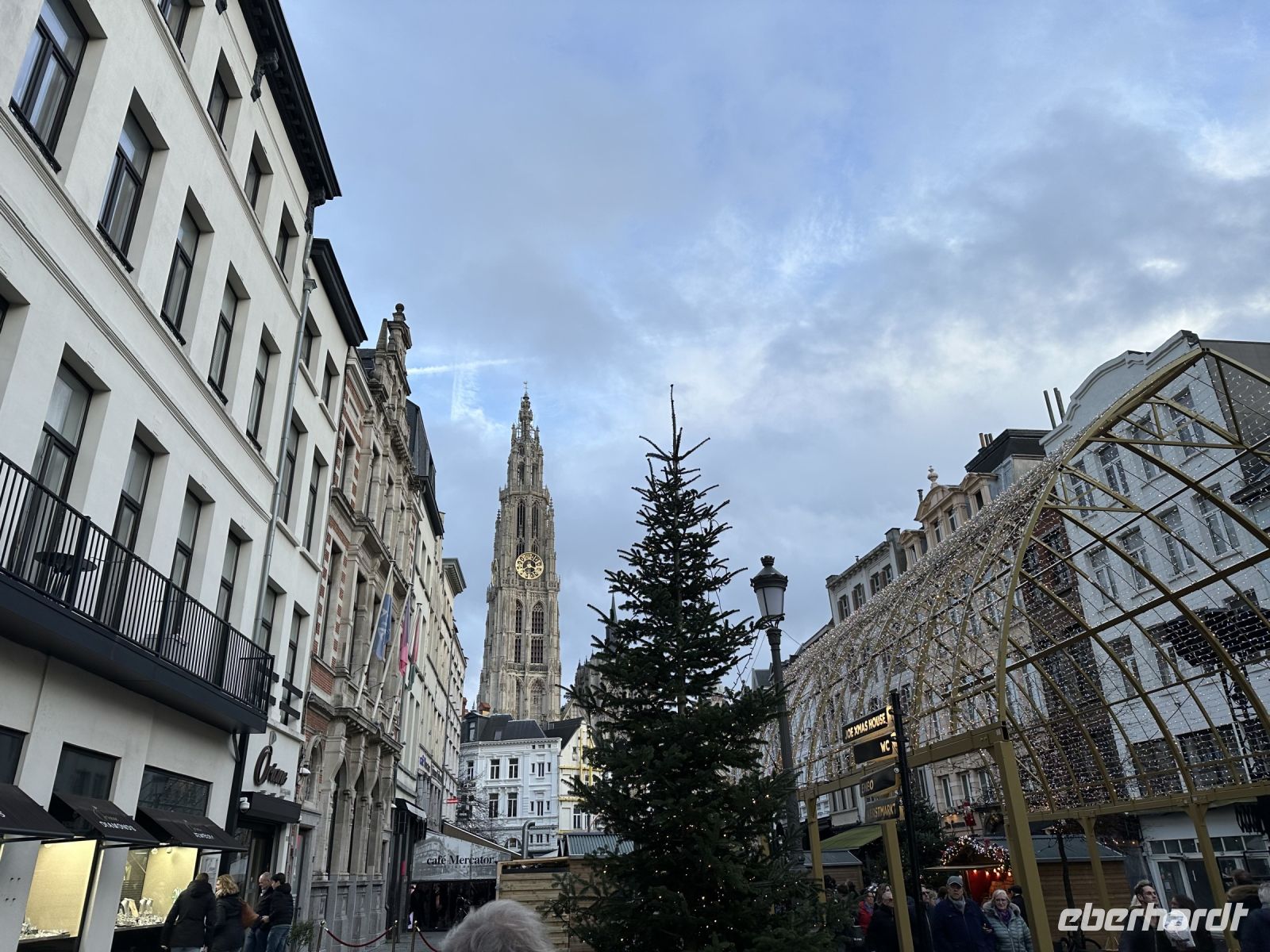 Heute ist Ausschlafen angesagt. Frühstück gibt es bis 09.30 Uhr. Das Vormittagsprogramm erfolgt in Eigenregie. Hafenmeistergebäude und MAS laden zur Besichtigung ein, alternativ kann man es sich im Salon gemütlich machen. Ein gutes Buch, ein Kartenspiel oder einfach nur aus dem Fenster schauen und träumen, so vergeht die Zeit. Zum Mittagessen gibt es Karottensuppe, Hackbraten mit Senfkartoffelpüree und Julienne-Gemüse und Vanillepudding. Am Nachmittag unternehmen wir einen Ausflug in die Stadt. Es herrscht Feiertagsverkehr und wir müssen so manchen Stau bewältigen. Wir besichtigen den Bahnhof von Antwerpen. Antwerpen-Centraal ist der wichtigste Bahnhof in Antwerpen, Belgien, und zählt zu den schönsten Bahnhöfen der Welt. Der Bahnhof wurde im Jahr 1905 eröffnet und verbindet die Stadt Antwerpen mit verschiedenen nationalen und internationalen Bahnstrecken. Antwerpen-Centraal ist bekannt für seine beeindruckende Architektur, die eine Mischung aus verschiedenen Baustilen ist. Die Fassade des Bahnhofsgebäudes ist im Stil der Renaissance gestaltet, während die Kuppel und der Hauptbahnhof im Stil des Eklektizismus erbaut wurden. Das markante Merkmal des Bahnhofs ist die große Kuppel, die das Dach krönt. Das Glasdach erstreckt sich über die Bahnsteige und sorgt für eine helle und offene Atmosphäre im Inneren. Der Innenraum des Bahnhofs ist geräumig und beeindruckend. Die hohen Bögen und die Verwendung von Glas schaffen eine luftige und einladende Umgebung. Die aufwändige Gestaltung der Wände und Decken trägt zur historischen Atmosphäre bei. Nachdem wir den Bahnhof ausgiebig bewundert haben, setzen wir unseren Rundgang fort und spazieren nun durch eine der vielen Diamantstraßen. Juwelier grenzt an Juwelier und überall glitzert und funkelt es teuer. Im Zentrum von , dem Grote Markt, ist noch der Weihnachtsmarkt aufgebaut. Hier ist heute ordentlich was los. Musik klingt über den Platz und mischt sich mit dem Duft nach frischen Waffeln und anderen Leckereien. Am Brabo-Brunnen erfahren wir, woher der Name Antwerpen stammt, bestaunen die umliegenden Handelshäuser und das schöne Rathaus, dann spazieren wir weiter zur Skulptur von Nello und Patrasche, deren Geschichte wir auf der Busanreise erfahren haben.