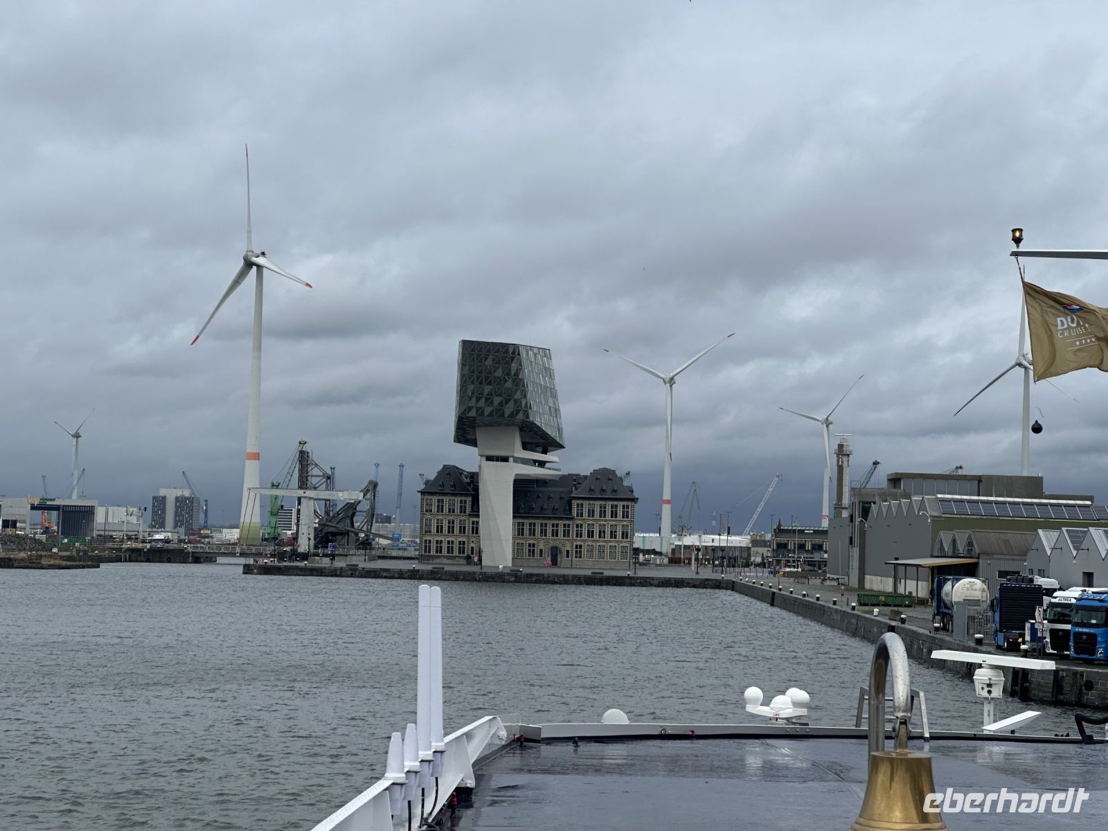 Der Rundgang beginnt am Eisenbahnmuseum, an dem später die Busse auch wieder abfahren. Vorbei am ehemaligen Krankenhaus, das heute eine Event-Location ist, flanieren wir Richtung Altastadt. Die Altstadt von Utrecht ist eine charmante und geschichtsträchtige Gegend, die von einem Netzwerk von Grachten durchzogen wird. Die Grachten verleihen der Altstadt eine malerische Atmosphäre. Entlang dieser Wasserwege erstrecken sich reizvolle Uferpromenaden, Cafés und Restaurants. Weit über die Grenzen Utrechts bekannt, ist das Petit Restaurant Héron. Wenn man hier edel speisen möchte, muss man lange im Voraus einen Tisch bestellen. Wir kommen zum Domplatz. Das dominierende Wahrzeichen ist der Domtoren, der den Domplein überragt. Der Domtoren ist der höchste Kirchturm der Niederlande und bietet einen beeindruckenden Blick über die Stadt, wenn man sich die Zeit nimmt, ihn zu erklimmen. Im Anschluss an den geführten Rundgang bleibt ein wenig Zeit für einen Schaufensterbummel oder andere Unternehmungen auf eigene Faust. Pünktlich zum Mittagessen sind wir zurück an Bord. Währenddessen, heißt es „Leinen los“ und die MS Dutch Grace fährt in Richtung Antwerpen. Der Nachmittag steht zur freien Verfügung. Vor dem Kaffeetrinken gibt es eine Informationsveranstaltung, wo uns Kreuzfahrtleiterin Regina über das Leben an Bord und das geplante Programm informiert. Draußen stürmt es kräftig und wer sich traut, die Nase in den Wind zu halten, kommt recht zerzaust zurück in den Salon. Und schon ist es Zeit für das Abendessen. Verwöhnt werden wir mit Ceasars Salat, cremiger Maissuppe, einem Hauptgericht mit Fisch, Fleisch oder vegetarisch und einer süßen oder herzhaften Nachspeise. Im Salon erklingt Musik zum Tagesausklang.
