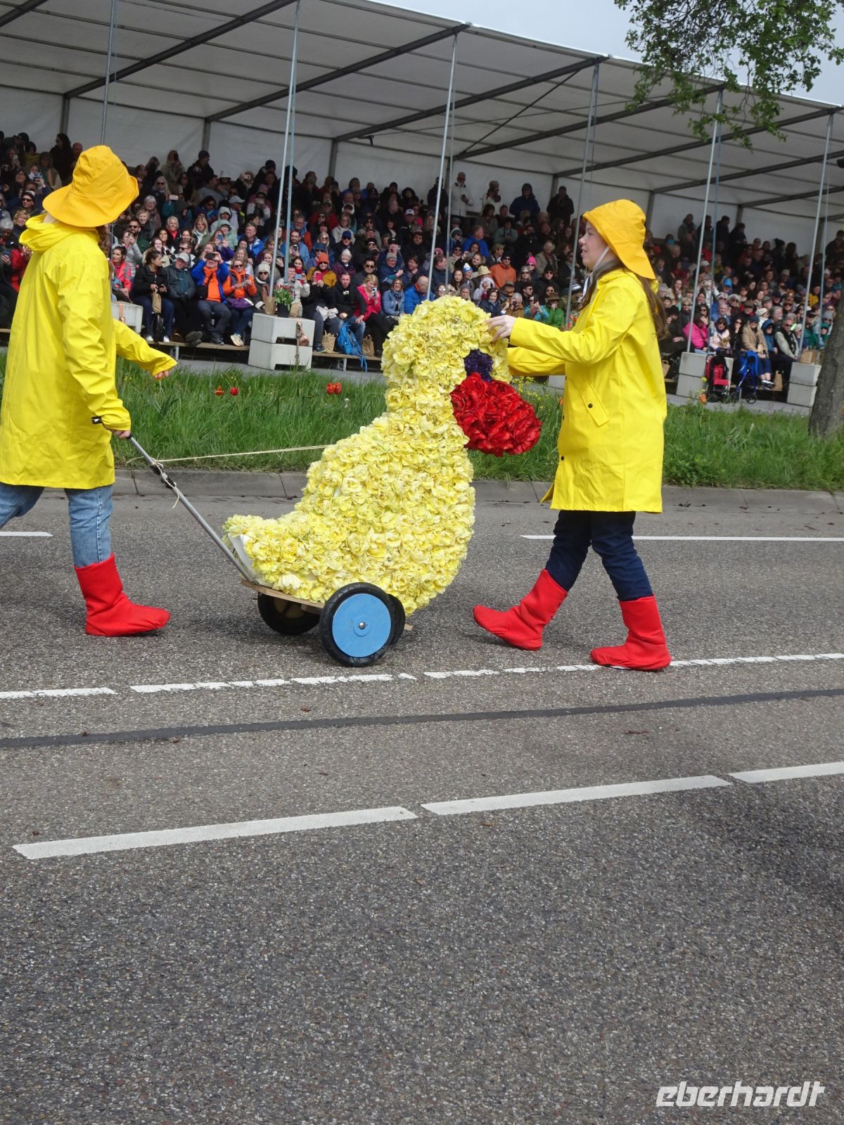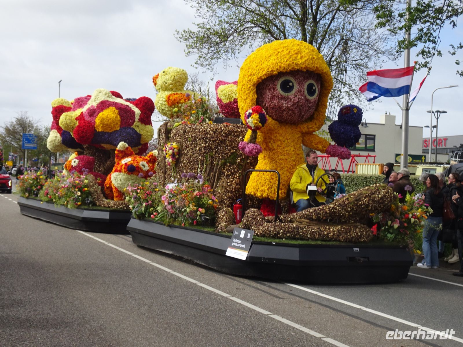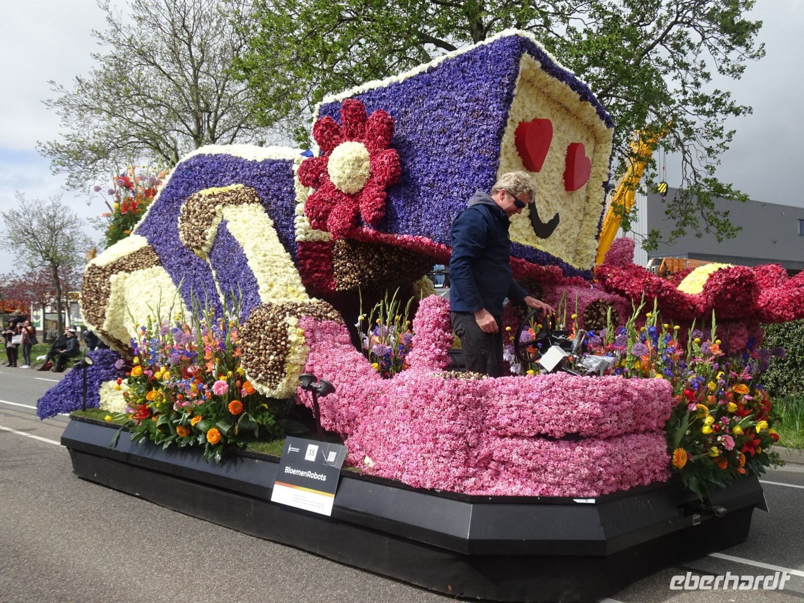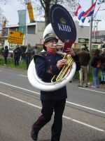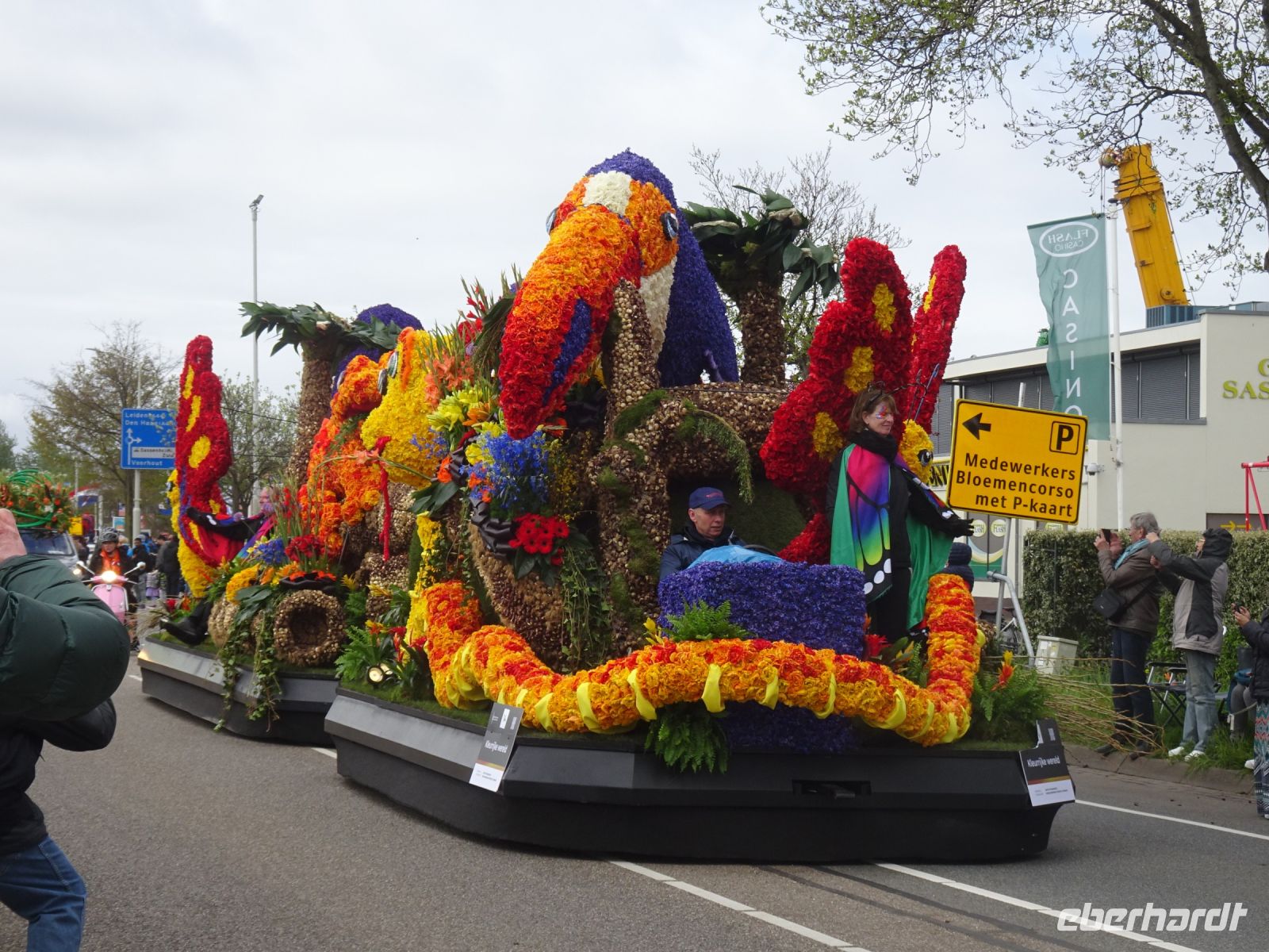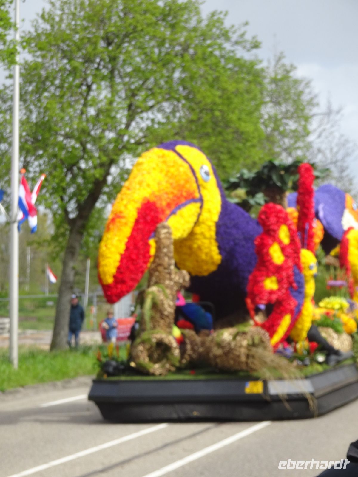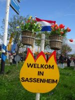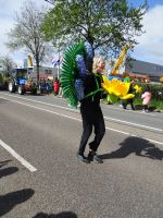 Nach einenm guten Frühstück vom Buffet starteten wir gegen 8:30 Uhr in Richtung Sassenheim, dem Ort, wo der Blumenkorso gegen 12 Uhr eintreffen sollte. Den Busparkplatz des Keukenhof nutzten wir für einen kurzen Toilettenhalt. Und dort war heute bereits gegen 9:30 Uhr der Busparkplatz deutlich stärker belegt als am Mittwoch. Schnell ging es weiter nach Sassenheim, wo wir nahe der Korsostrecke unseren Bus abstellen wollten. Und wir hatten großes Glück. Auf einem Gewerbegrundstück unmittelbar gegenüber einer Tribüne hatten wir einen idealen Platz für die Beobachtung gefunden. Mit vielen froh gelaunten Besuchern aus den Niederlanden und aus dem Ausland vertraten wir uns die Füße. Pünktlich um 12 Uhr erreichte der Korsozug - inoffiziell angeführt von einer Drehorgel auf einem Anhänger - die Tribüne. Geschmückte Fahrräder und Scooter begleiteten den Zug. Fröhliche Korsoteilnehmer mit Schiebeenten führten zu einem Extrabeifall von der Tribüne. Und nach dem schon bekannten Motto "Mit Musik geht alles besser" begleitetem mehrere Kapellen den Zug. Selbstverständlich wurde von allen vor der Tribüne das nächste Lied intoniert. Anerkennung deshalb besonders, da auf dem etwa 40 km langen Weg von früh um 9 Uhr bis abends gegen 22 Uhr gute Kondition gefragt war.