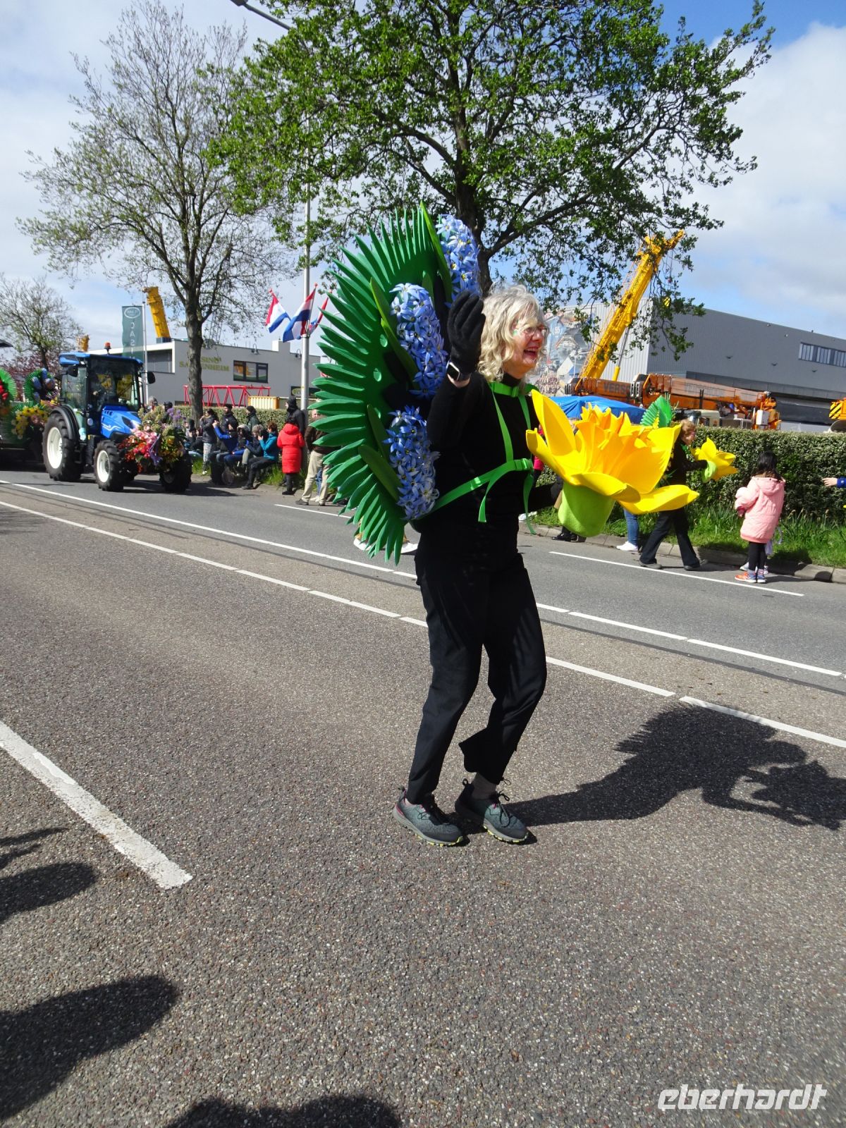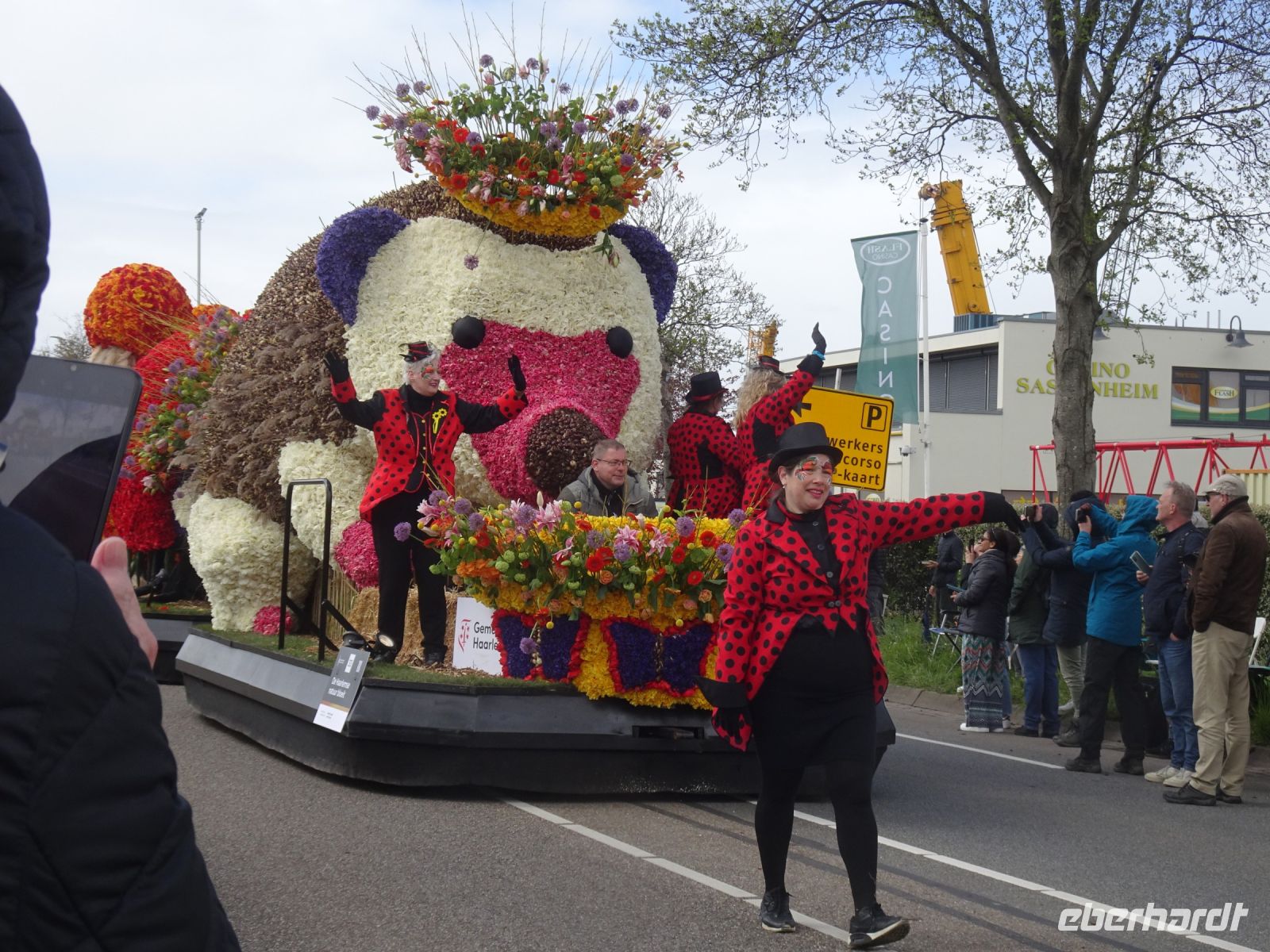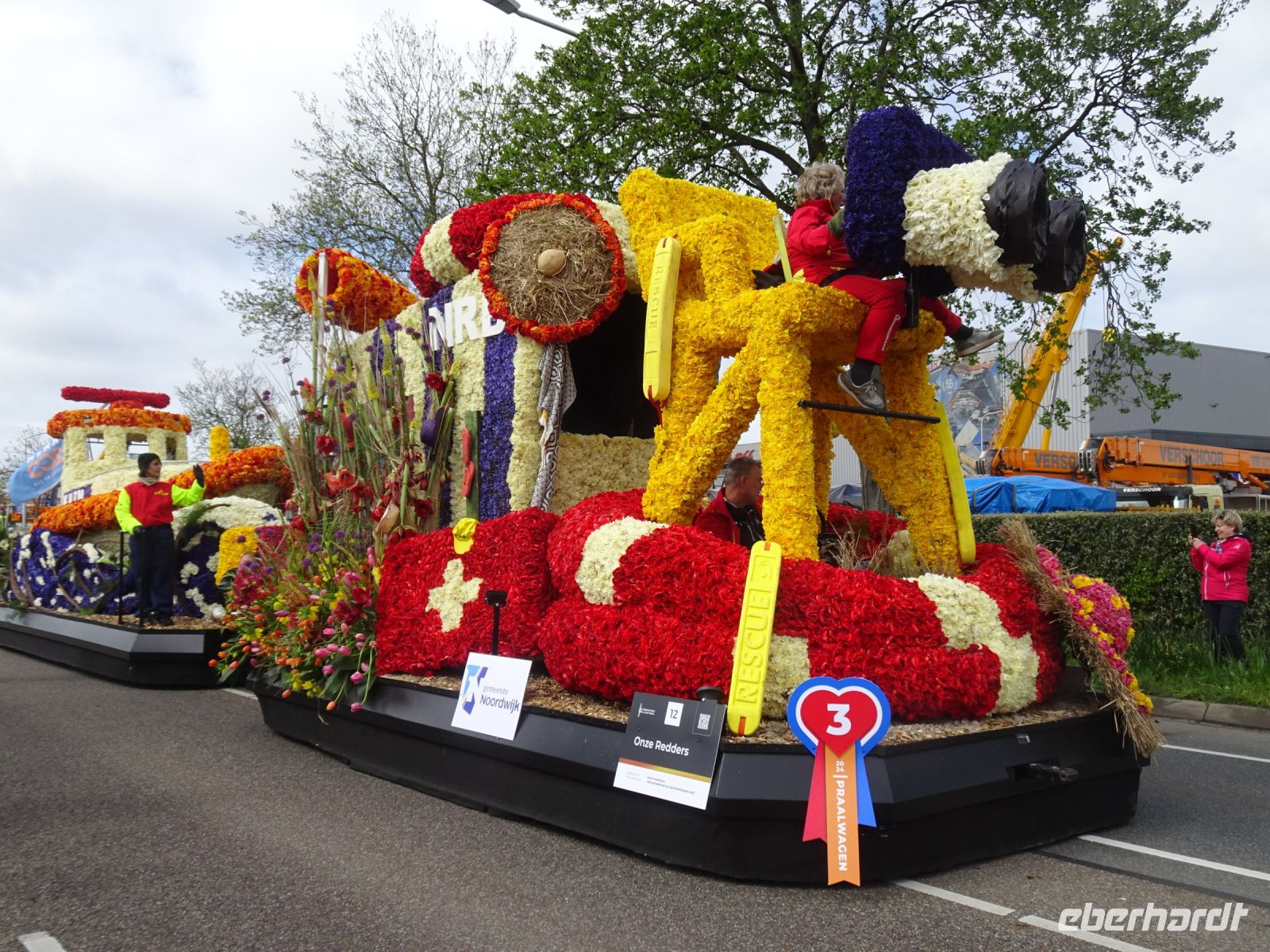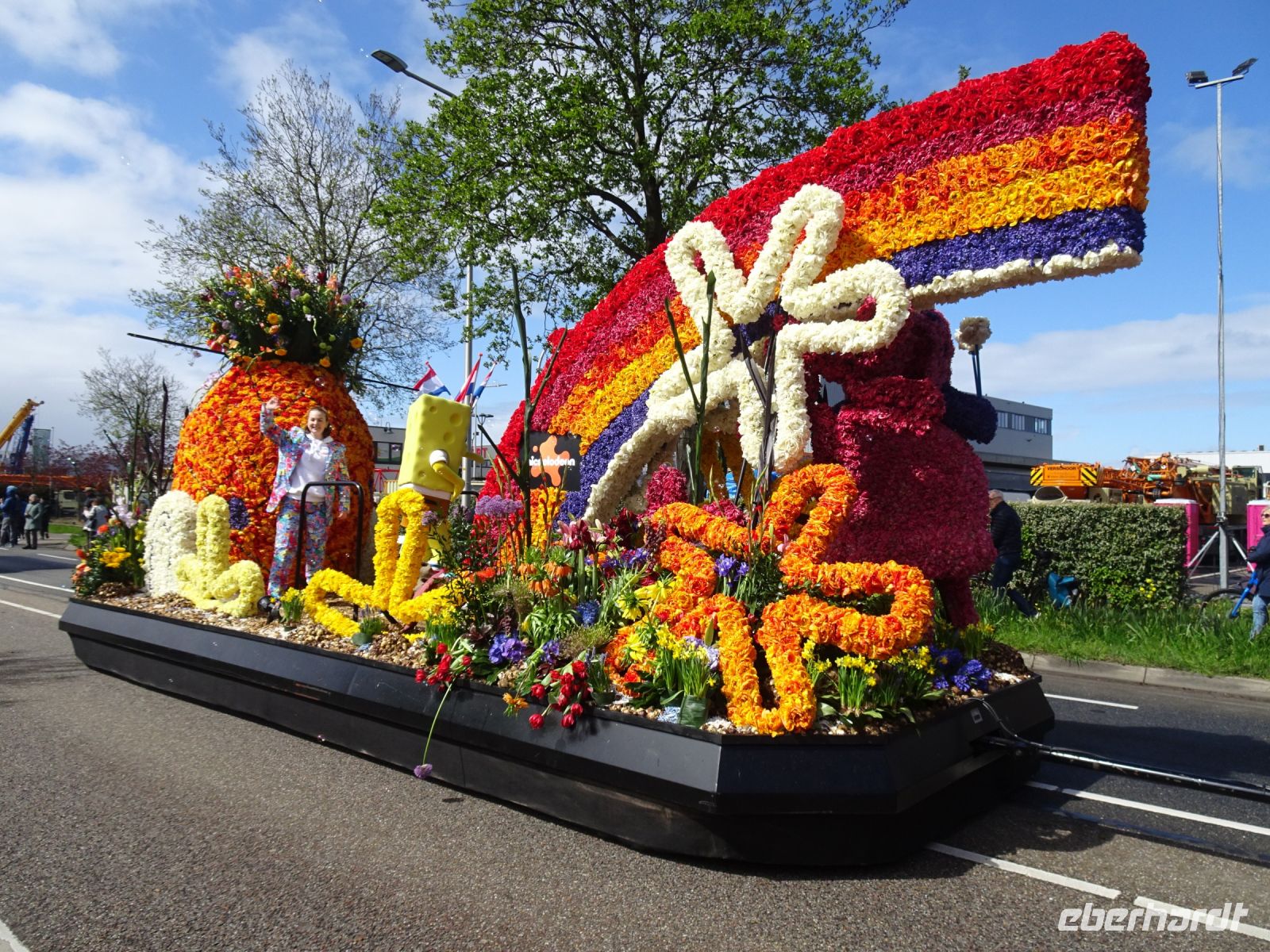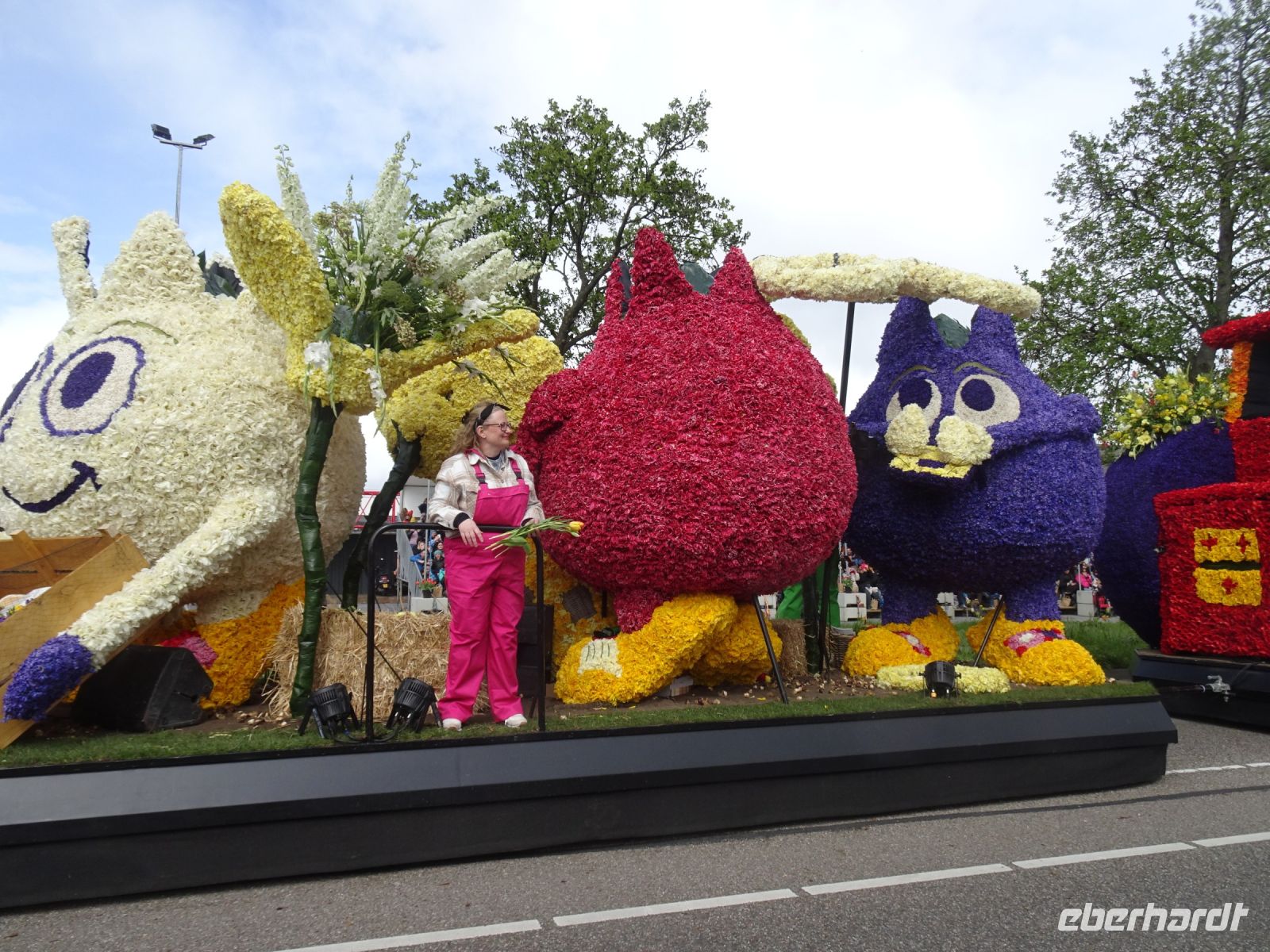 Nach einenm guten Frühstück vom Buffet starteten wir gegen 8:30 Uhr in Richtung Sassenheim, dem Ort, wo der Blumenkorso gegen 12 Uhr eintreffen sollte. Den Busparkplatz des Keukenhof nutzten wir für einen kurzen Toilettenhalt. Und dort war heute bereits gegen 9:30 Uhr der Busparkplatz deutlich stärker belegt als am Mittwoch. Schnell ging es weiter nach Sassenheim, wo wir nahe der Korsostrecke unseren Bus abstellen wollten. Und wir hatten großes Glück. Auf einem Gewerbegrundstück unmittelbar gegenüber einer Tribüne hatten wir einen idealen Platz für die Beobachtung gefunden. Mit vielen froh gelaunten Besuchern aus den Niederlanden und aus dem Ausland vertraten wir uns die Füße. Pünktlich um 12 Uhr erreichte der Korsozug - inoffiziell angeführt von einer Drehorgel auf einem Anhänger - die Tribüne. Geschmückte Fahrräder und Scooter begleiteten den Zug. Fröhliche Korsoteilnehmer mit Schiebeenten führten zu einem Extrabeifall von der Tribüne. Und nach dem schon bekannten Motto "Mit Musik geht alles besser" begleitetem mehrere Kapellen den Zug. Selbstverständlich wurde von allen vor der Tribüne das nächste Lied intoniert. Anerkennung deshalb besonders, da auf dem etwa 40 km langen Weg von früh um 9 Uhr bis abends gegen 22 Uhr gute Kondition gefragt war.