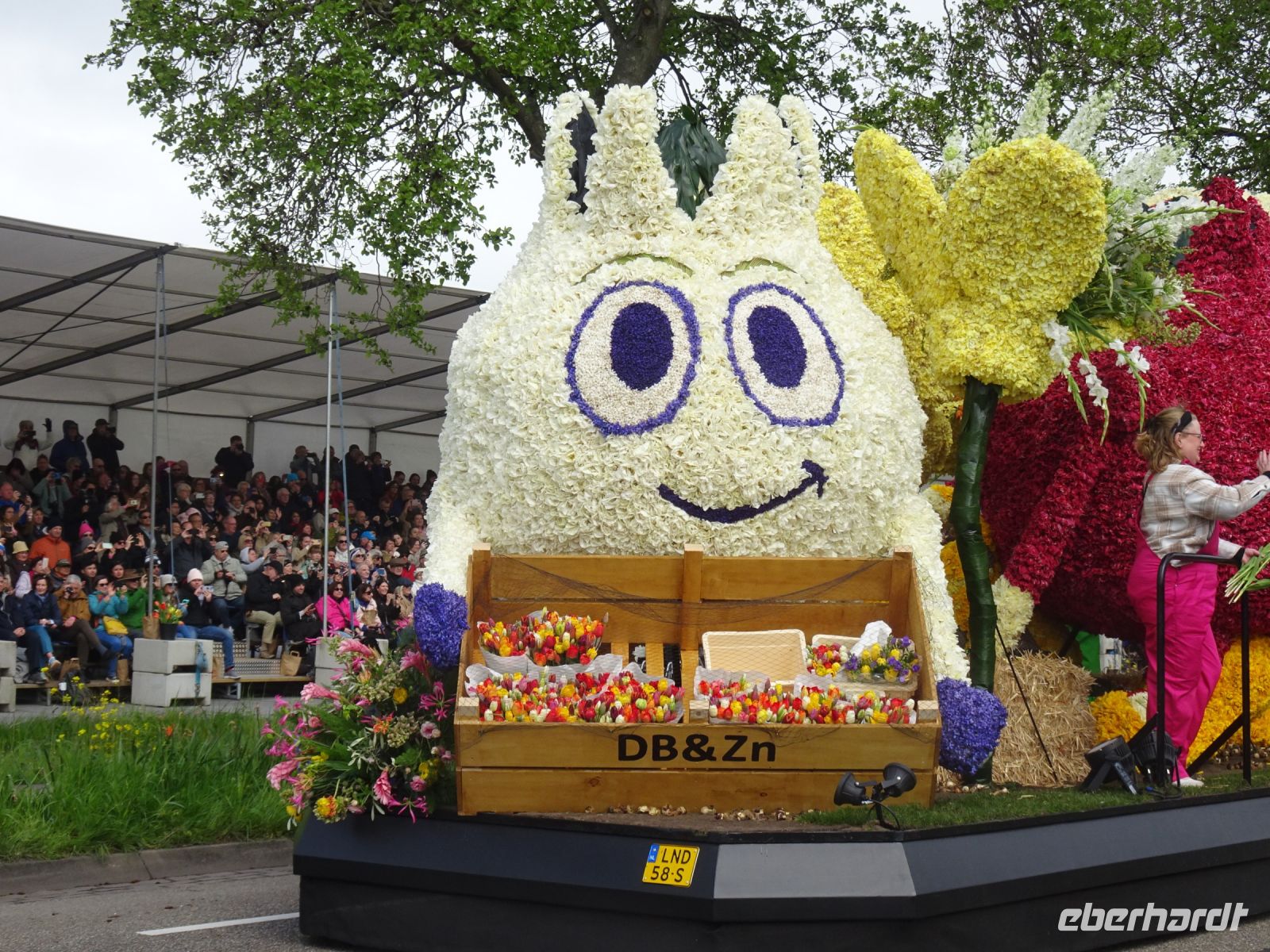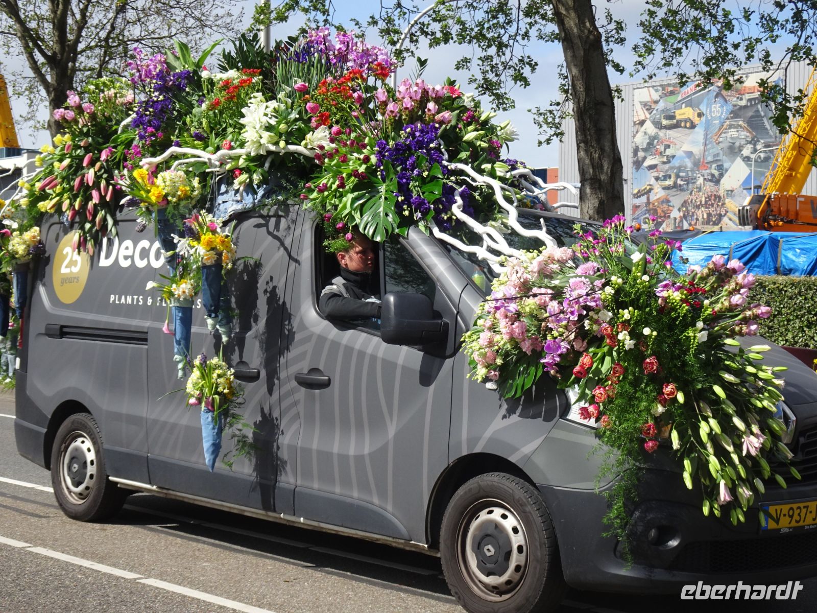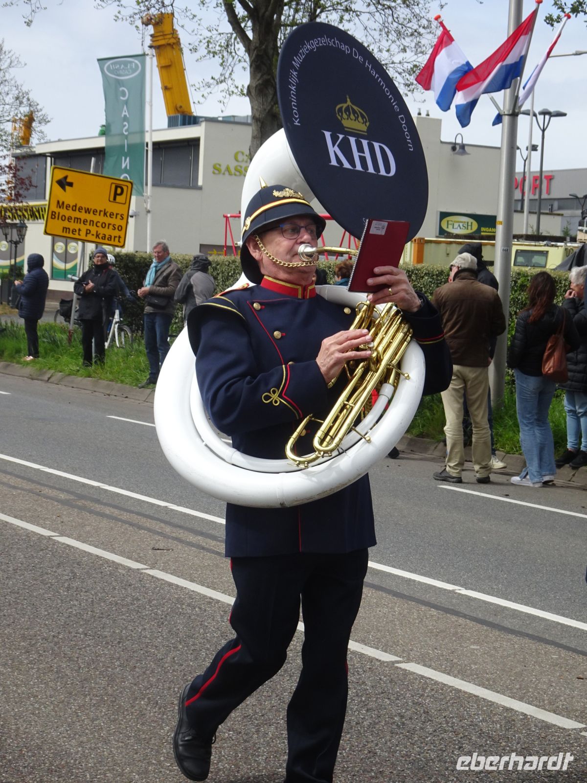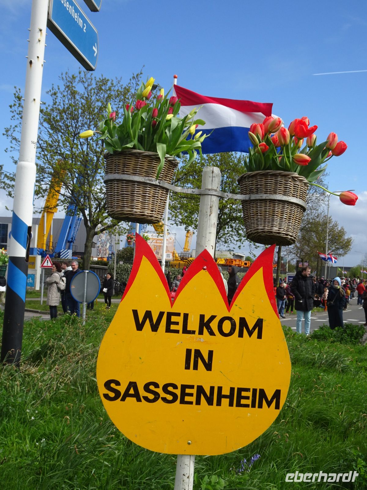 Nach einenm guten Frühstück vom Buffet starteten wir gegen 8:30 Uhr in Richtung Sassenheim, dem Ort, wo der Blumenkorso gegen 12 Uhr eintreffen sollte. Den Busparkplatz des Keukenhof nutzten wir für einen kurzen Toilettenhalt. Und dort war heute bereits gegen 9:30 Uhr der Busparkplatz deutlich stärker belegt als am Mittwoch. Schnell ging es weiter nach Sassenheim, wo wir nahe der Korsostrecke unseren Bus abstellen wollten. Und wir hatten großes Glück. Auf einem Gewerbegrundstück unmittelbar gegenüber einer Tribüne hatten wir einen idealen Platz für die Beobachtung gefunden. Mit vielen froh gelaunten Besuchern aus den Niederlanden und aus dem Ausland vertraten wir uns die Füße. Pünktlich um 12 Uhr erreichte der Korsozug - inoffiziell angeführt von einer Drehorgel auf einem Anhänger - die Tribüne. Geschmückte Fahrräder und Scooter begleiteten den Zug. Fröhliche Korsoteilnehmer mit Schiebeenten führten zu einem Extrabeifall von der Tribüne. Und nach dem schon bekannten Motto "Mit Musik geht alles besser" begleitetem mehrere Kapellen den Zug. Selbstverständlich wurde von allen vor der Tribüne das nächste Lied intoniert. Anerkennung deshalb besonders, da auf dem etwa 40 km langen Weg von früh um 9 Uhr bis abends gegen 22 Uhr gute Kondition gefragt war.