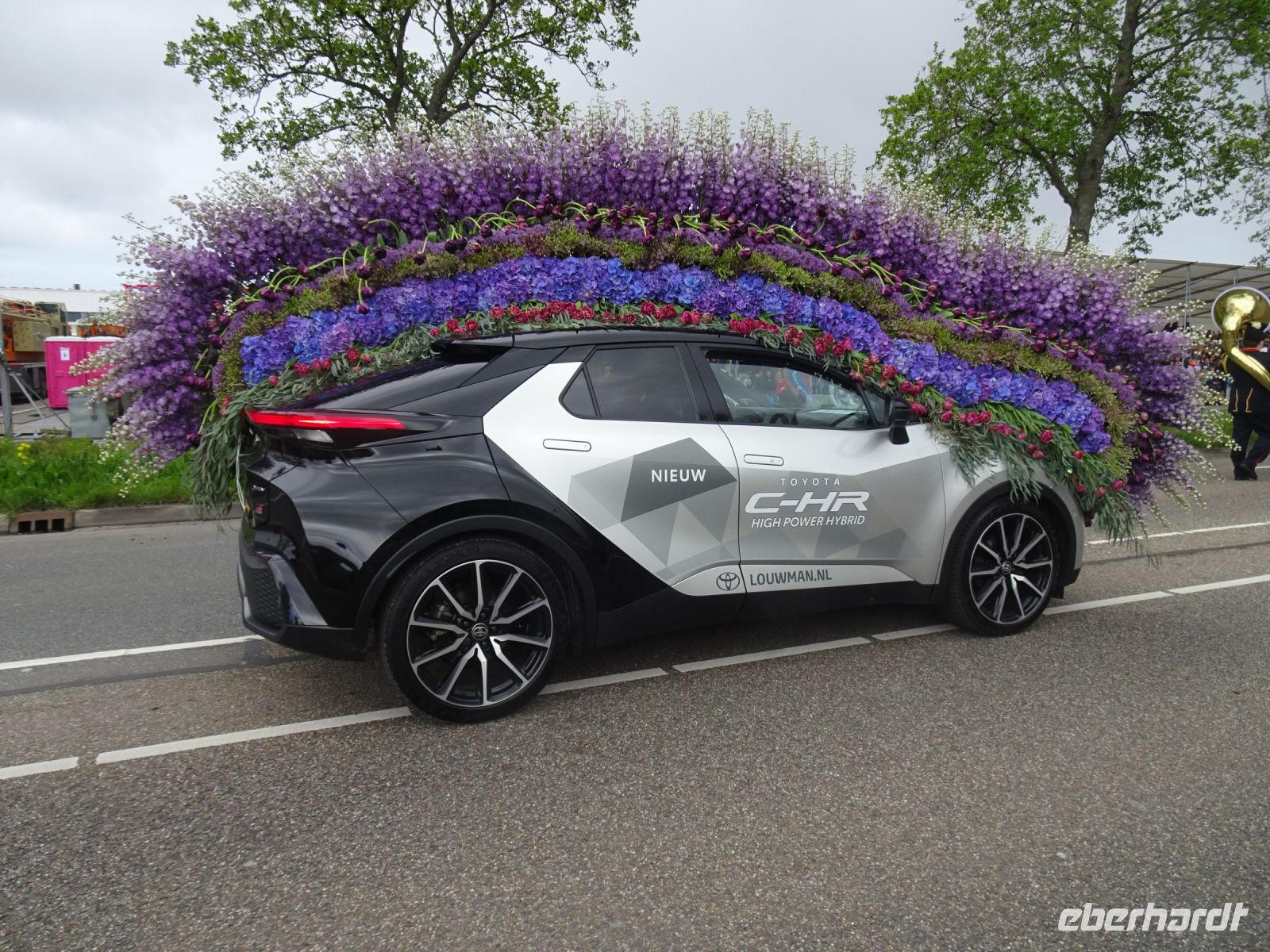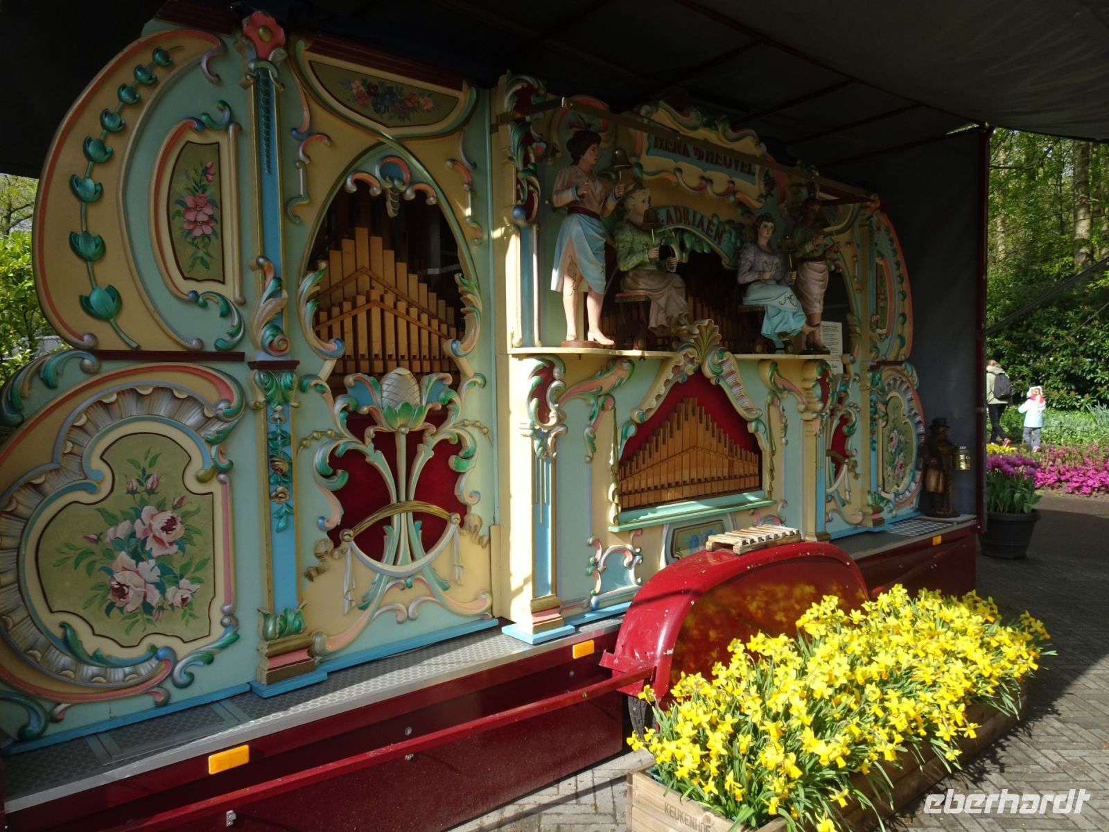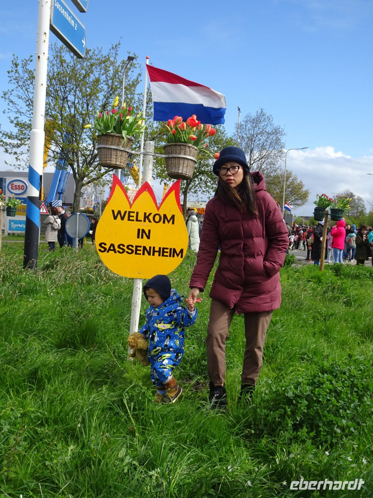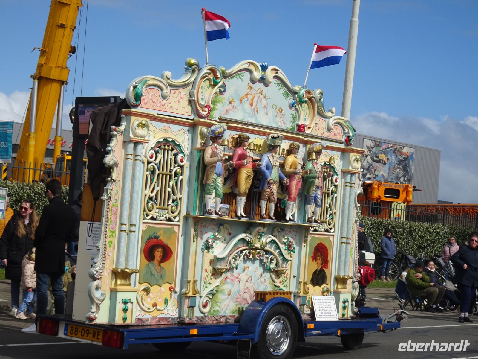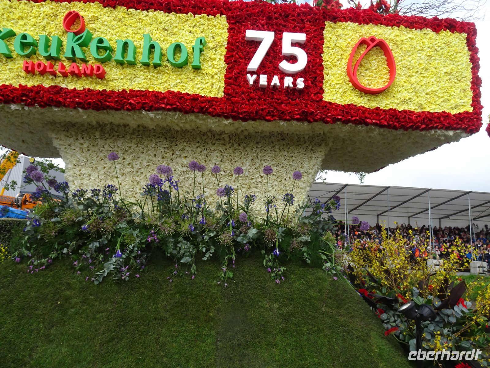 Nach einenm guten Frühstück vom Buffet starteten wir gegen 8:30 Uhr in Richtung Sassenheim, dem Ort, wo der Blumenkorso gegen 12 Uhr eintreffen sollte. Den Busparkplatz des Keukenhof nutzten wir für einen kurzen Toilettenhalt. Und dort war heute bereits gegen 9:30 Uhr der Busparkplatz deutlich stärker belegt als am Mittwoch. Schnell ging es weiter nach Sassenheim, wo wir nahe der Korsostrecke unseren Bus abstellen wollten. Und wir hatten großes Glück. Auf einem Gewerbegrundstück unmittelbar gegenüber einer Tribüne hatten wir einen idealen Platz für die Beobachtung gefunden. Mit vielen froh gelaunten Besuchern aus den Niederlanden und aus dem Ausland vertraten wir uns die Füße. Pünktlich um 12 Uhr erreichte der Korsozug - inoffiziell angeführt von einer Drehorgel auf einem Anhänger - die Tribüne. Geschmückte Fahrräder und Scooter begleiteten den Zug. Fröhliche Korsoteilnehmer mit Schiebeenten führten zu einem Extrabeifall von der Tribüne. Und nach dem schon bekannten Motto "Mit Musik geht alles besser" begleitetem mehrere Kapellen den Zug. Selbstverständlich wurde von allen vor der Tribüne das nächste Lied intoniert. Anerkennung deshalb besonders, da auf dem etwa 40 km langen Weg von früh um 9 Uhr bis abends gegen 22 Uhr gute Kondition gefragt war.