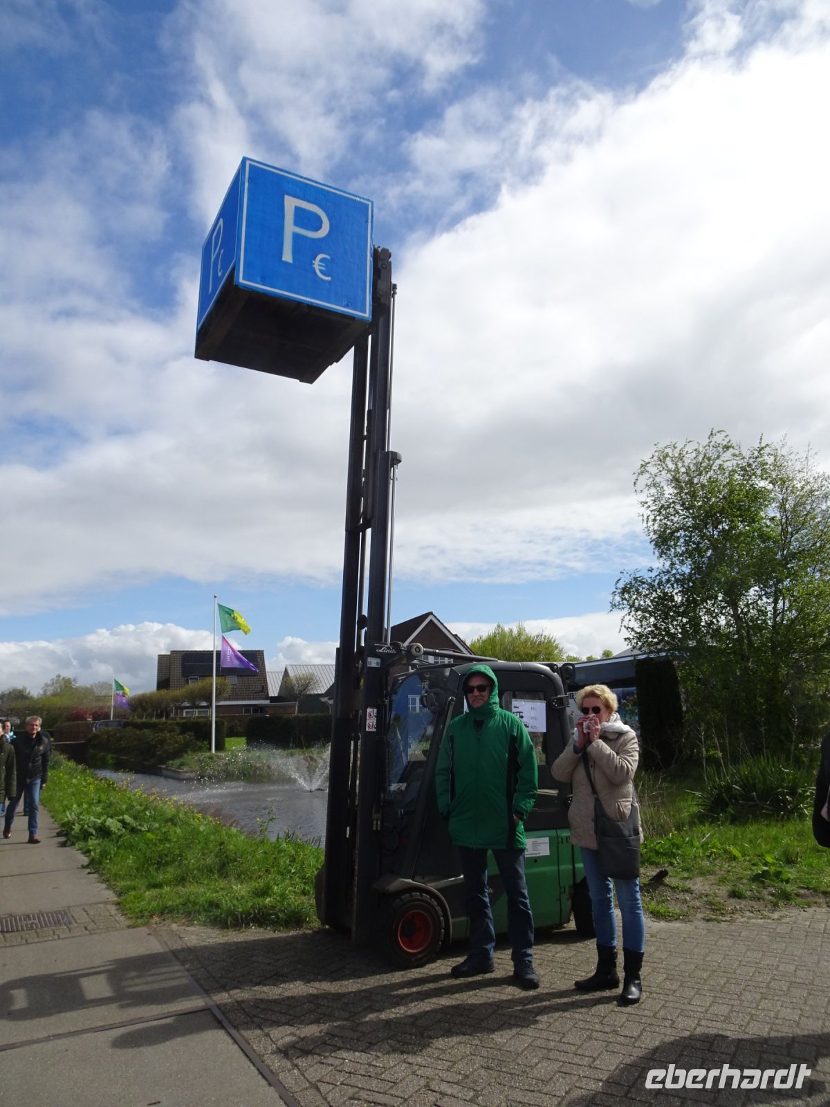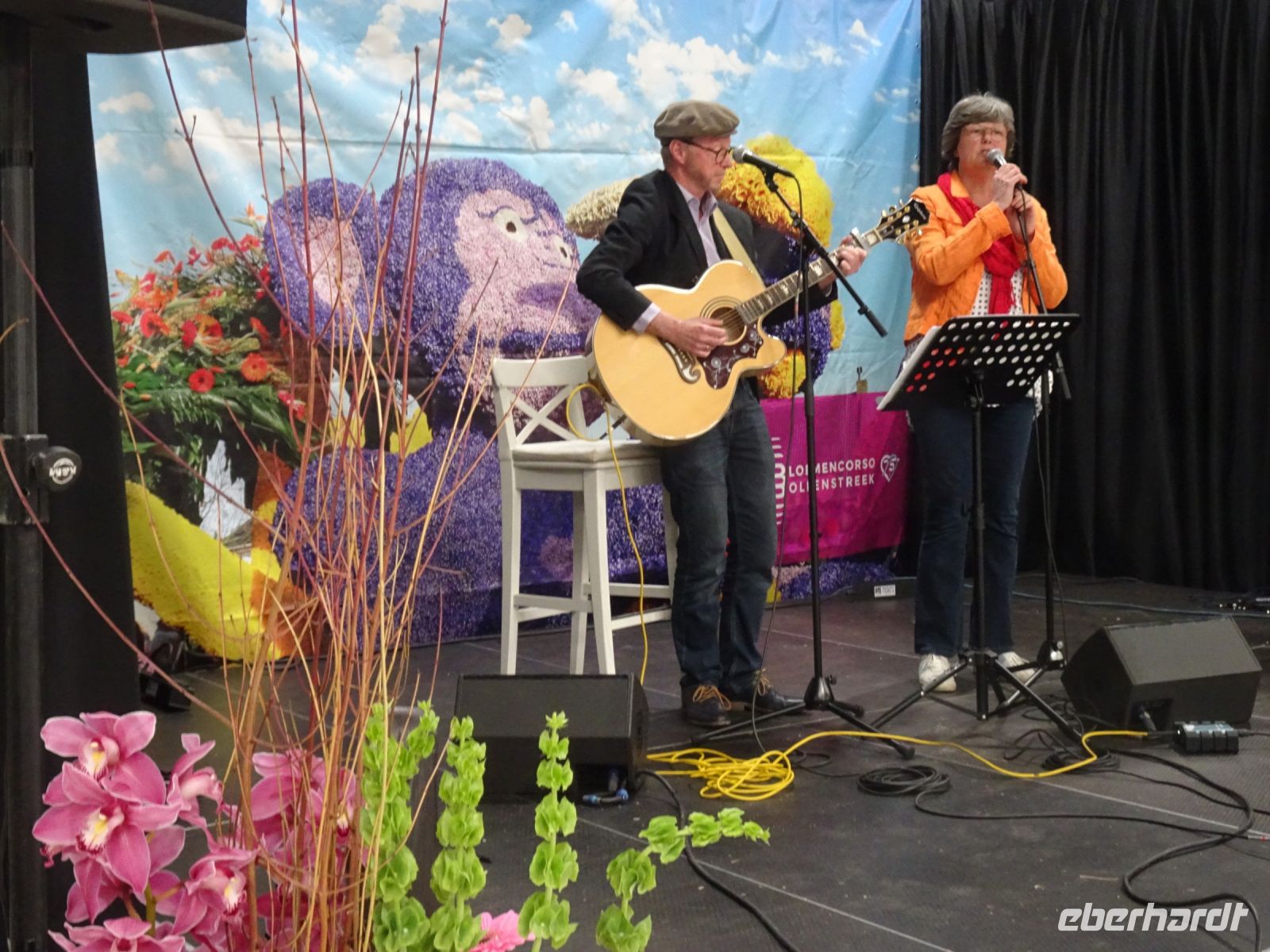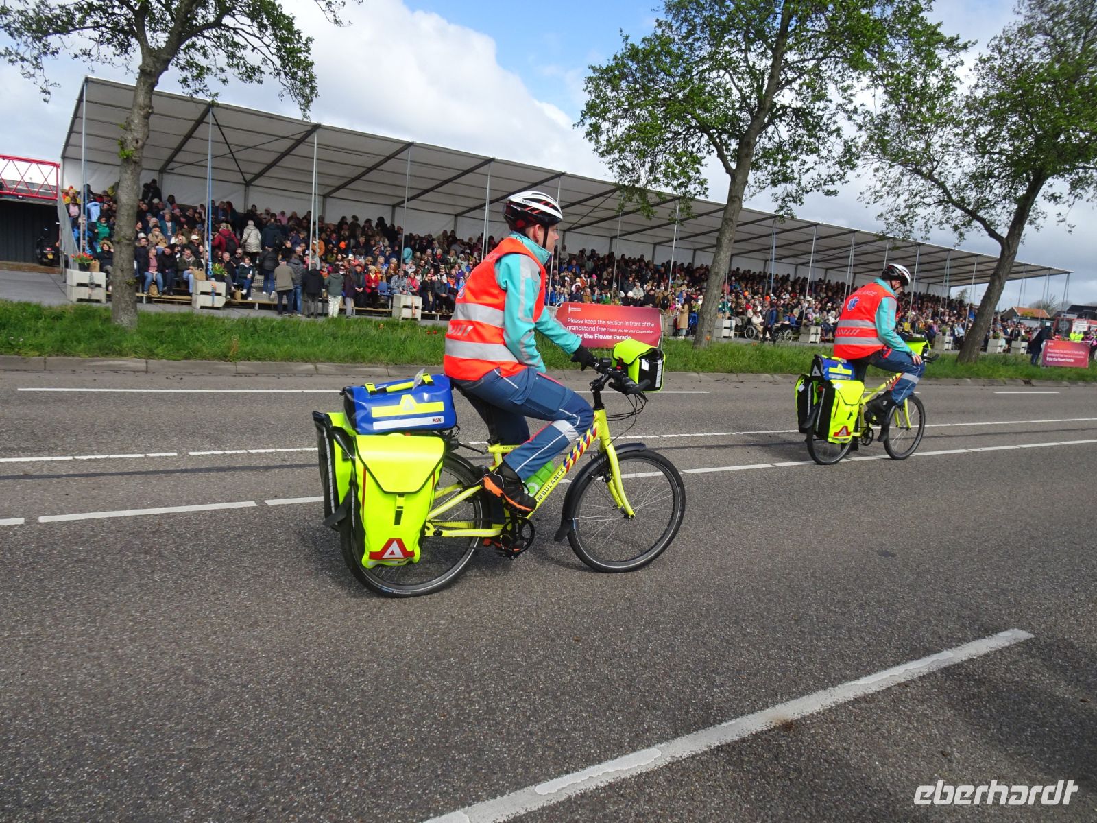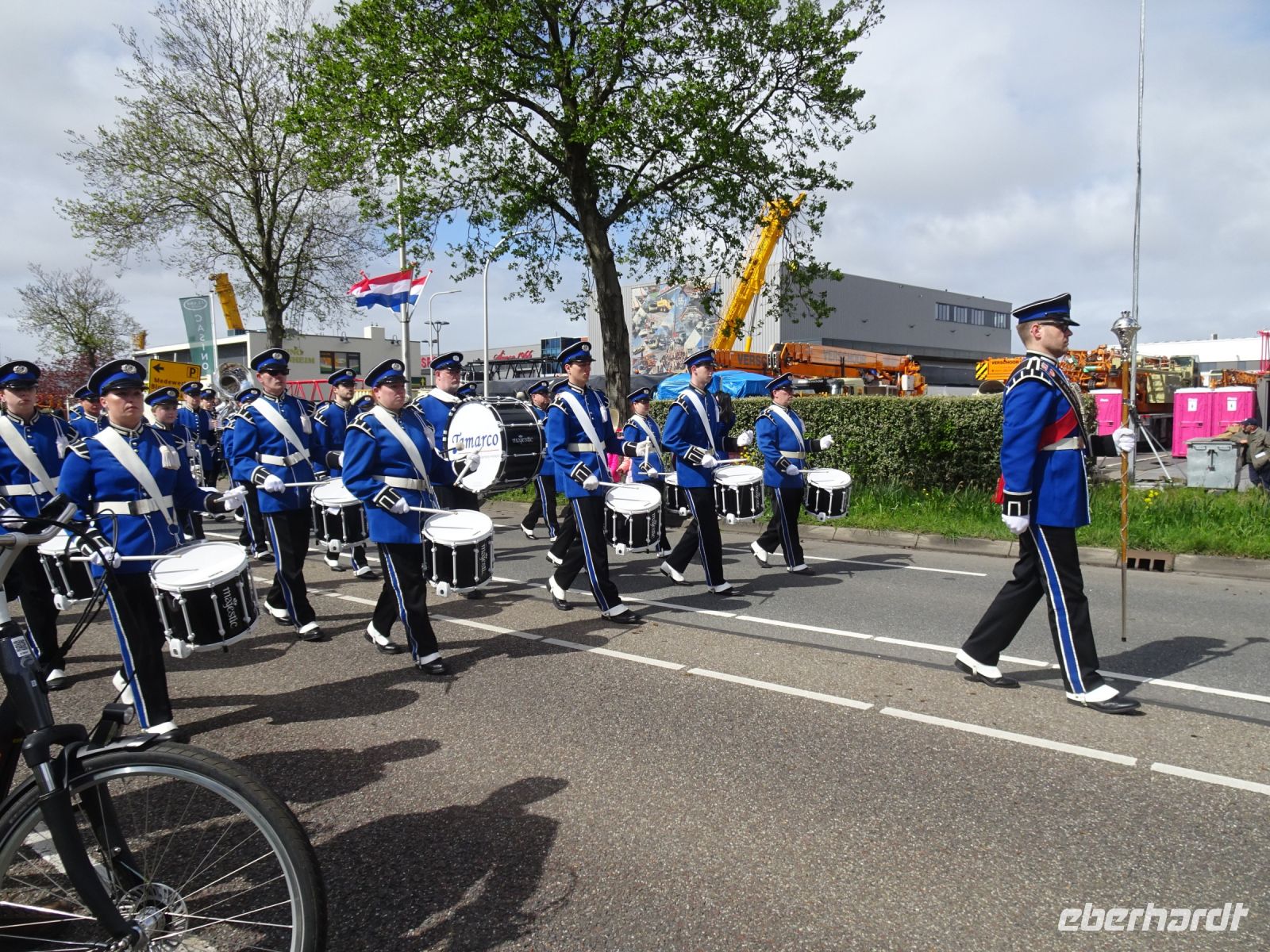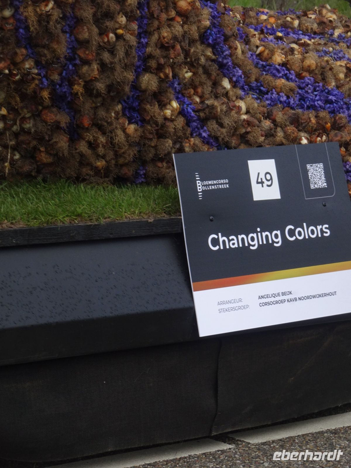 Nach einenm guten Frühstück vom Buffet starteten wir gegen 8:30 Uhr in Richtung Sassenheim, dem Ort, wo der Blumenkorso gegen 12 Uhr eintreffen sollte. Den Busparkplatz des Keukenhof nutzten wir für einen kurzen Toilettenhalt. Und dort war heute bereits gegen 9:30 Uhr der Busparkplatz deutlich stärker belegt als am Mittwoch. Schnell ging es weiter nach Sassenheim, wo wir nahe der Korsostrecke unseren Bus abstellen wollten. Und wir hatten großes Glück. Auf einem Gewerbegrundstück unmittelbar gegenüber einer Tribüne hatten wir einen idealen Platz für die Beobachtung gefunden. Mit vielen froh gelaunten Besuchern aus den Niederlanden und aus dem Ausland vertraten wir uns die Füße. Pünktlich um 12 Uhr erreichte der Korsozug - inoffiziell angeführt von einer Drehorgel auf einem Anhänger - die Tribüne. Geschmückte Fahrräder und Scooter begleiteten den Zug. Fröhliche Korsoteilnehmer mit Schiebeenten führten zu einem Extrabeifall von der Tribüne. Und nach dem schon bekannten Motto "Mit Musik geht alles besser" begleitetem mehrere Kapellen den Zug. Selbstverständlich wurde von allen vor der Tribüne das nächste Lied intoniert. Anerkennung deshalb besonders, da auf dem etwa 40 km langen Weg von früh um 9 Uhr bis abends gegen 22 Uhr gute Kondition gefragt war.