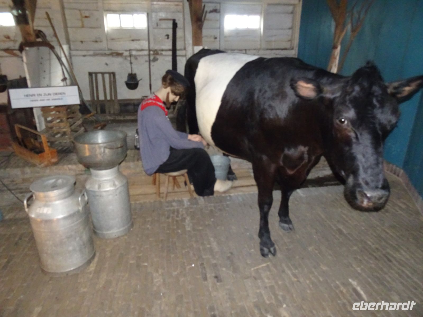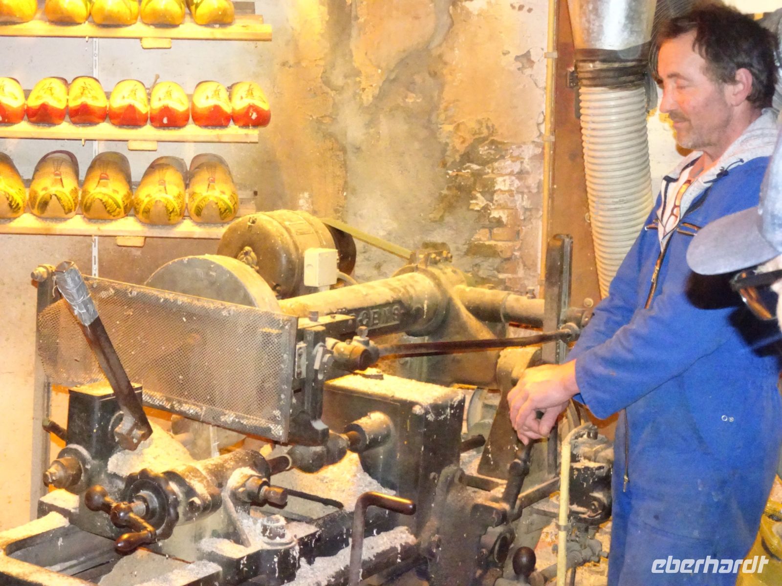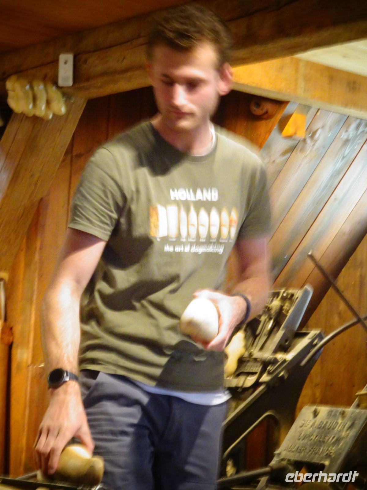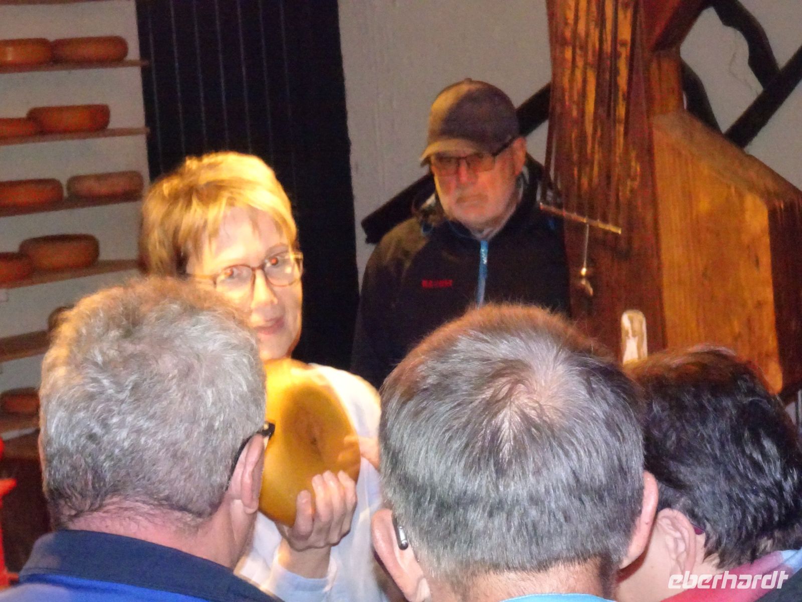 Durch unseren Busstandort in Sassenheim konnten wir auch nach dem Korso problemlos zu unserem nächsten Reiseziel starten: den Rembrandt Hoeven bei Amsterdam. Im Gegensatz zu den Catharina Hoeven in Zaanse Schans sind die Rembrandt Hoeve ein aktiver Bauerhof. Die Kühe auf dem Hof begrüßten uns arttypisch. Eine kurze Darstellung der Käseherstellung mit dem Verweis auf den für eine bäuerliche Hofproduktion kennzeichnenden Erzeugerstempel machten Appetit auf den anschließenden Verkauf. Schon bekannt war mit den historischen Maschinen die Holzschuhferigung. Säcke voll Holzschuhen zeigten uns, dass hier nicht nur museal sondern wirtschftlich gearbeitet wird. Der anschließende Hofladen verzeichnete dann sehr gute Umsätze, da ja am Sonntag bereits der Heimreisetag anstand.
