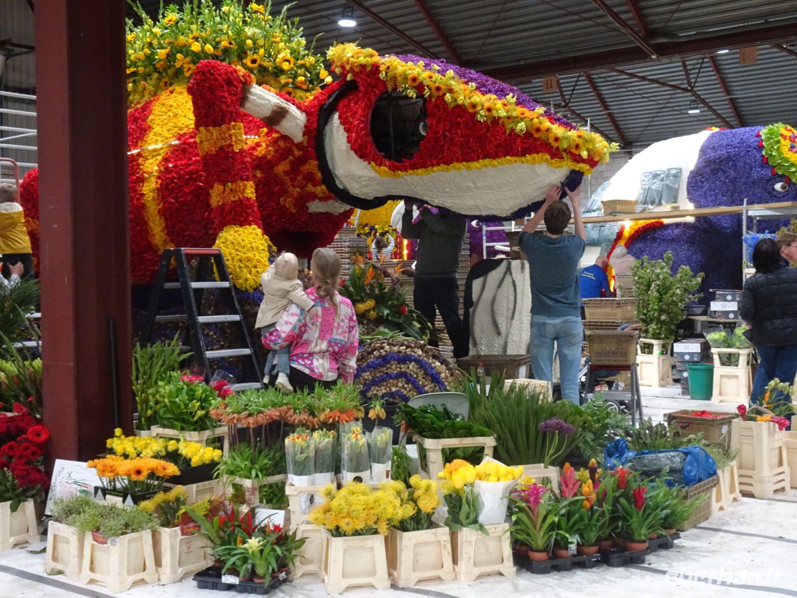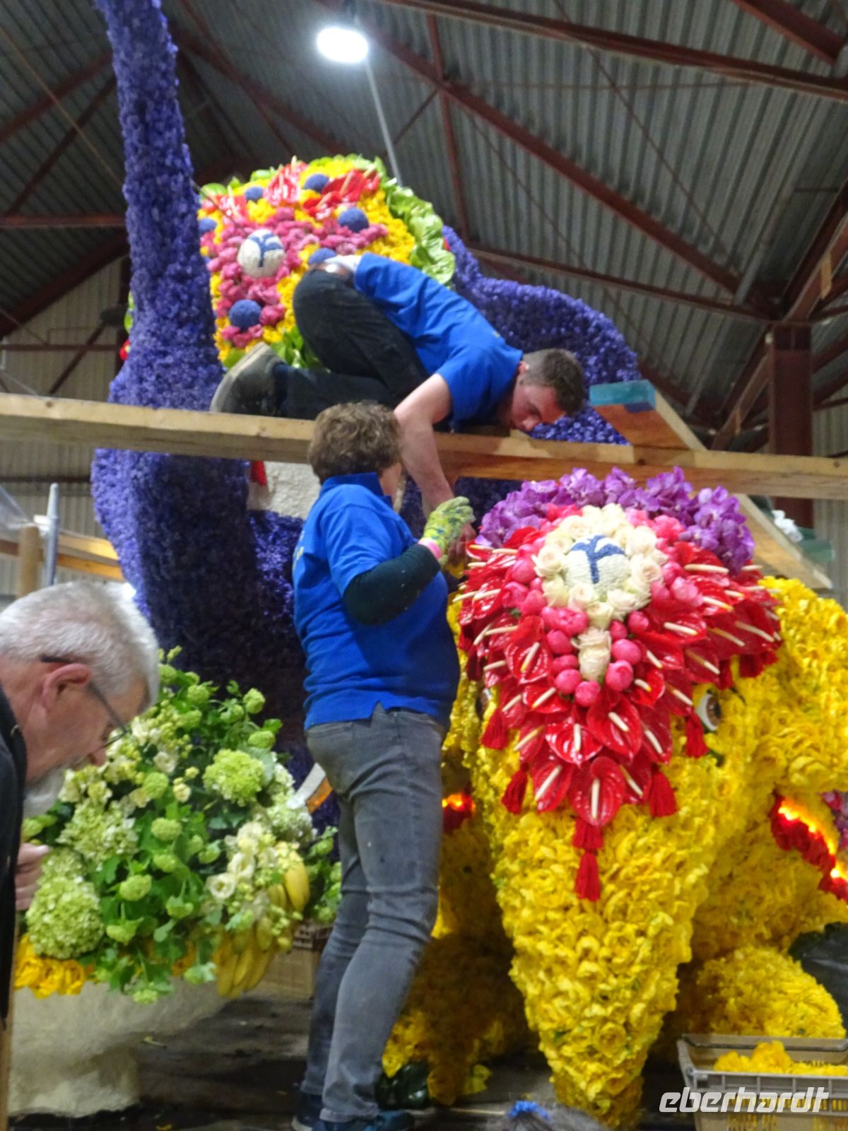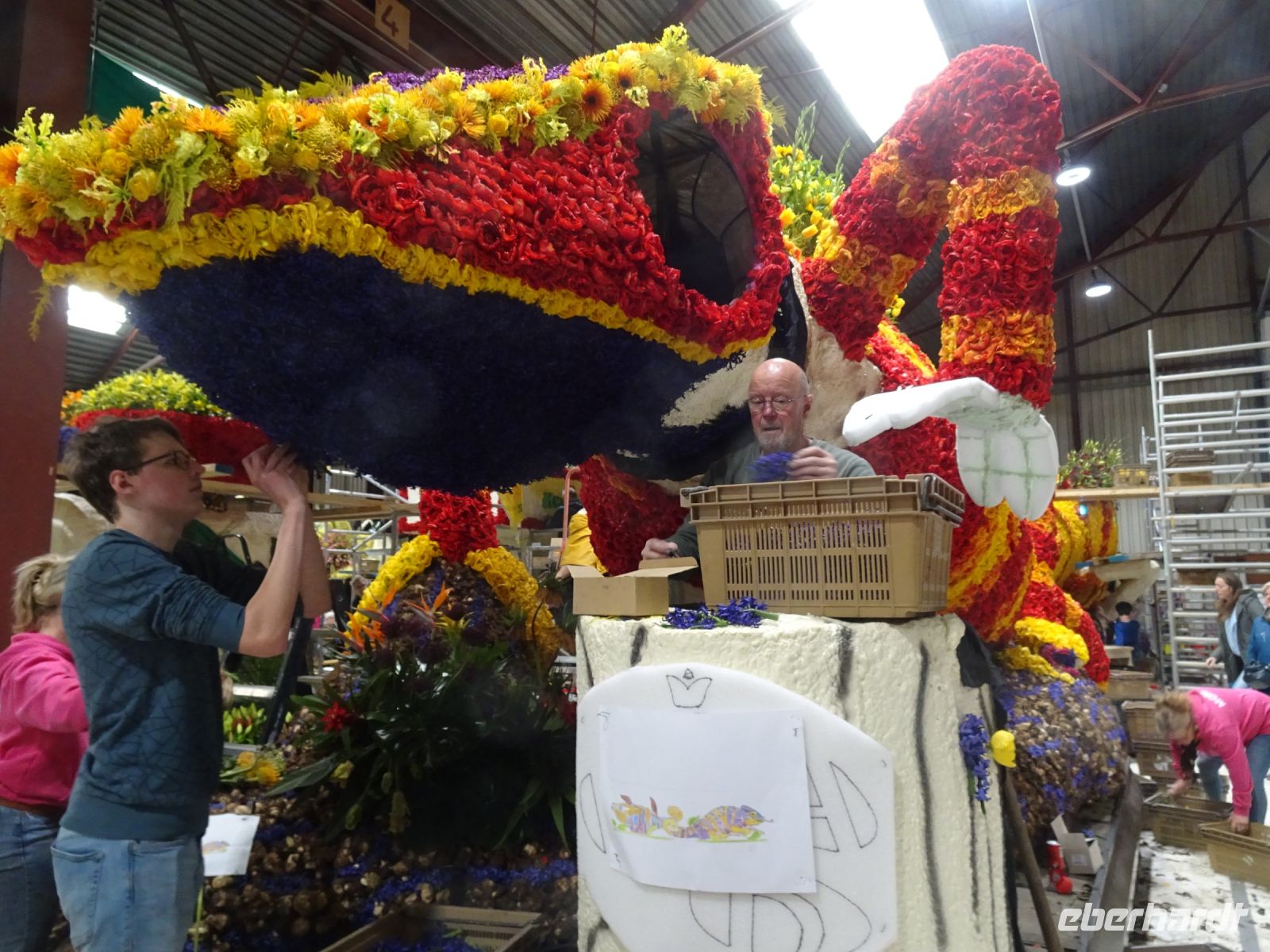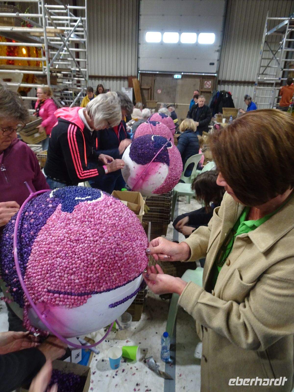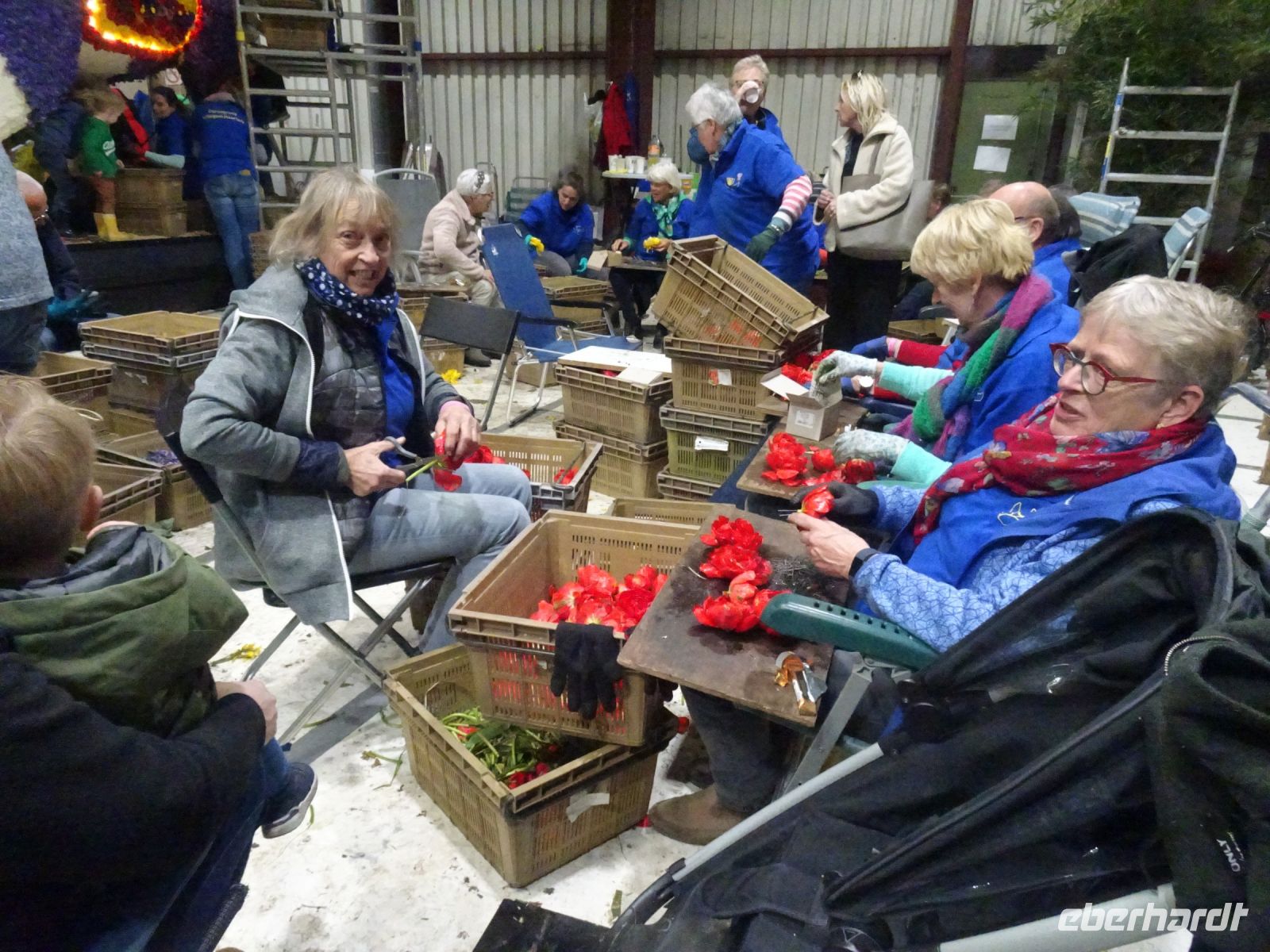 In zwei riesigen Hallen standen die Anhänger und Fahrzeuge für den Blumenkorso. Dazu Massen von vielfältigen Blumen zur Dekoration der Fahrzeuge. Und alles wie in einem Ameisenhaufen umgeben von ganz vielen Menschen - jung und alt. Wir hatten zwei Gruppen, um mit Sachkundigen durch die Hallen geführt zu werden. Ein beeindruckendes Erlebnis, wie die angelieferten Blumen für die Staffage der Fahrzeuge vorbereitet wurden. Neben langstieligen Drappierungen mussten besonders für die flächige Dekoration die kleinen Blumen alle vorbereitet werden: Stiel kurzschneiden, mit spziellen Nadeln vorbereiten und dann in den Blumenteppich einarbeiten. So sind die oft anzutreffenden Farbflächen der Beweis für die fleißige Arbeit der Helfer. Ganze Dorfgemeinschaften schienen hier tätig zu sein. Und dies bei motivierender Musik in der gesamten Halle. Ein einmaliges Erlebnis. Besonders wenn man dann im Korso erlebt, welche Mühe dahintersteckt, um nach Ende des Korso vollständig entsorgt zu werden. Wir zollten den Helfern höchste Anerkennung. Und bei vielen Wagen im Korso am Sonnabend erkannten wir die hier noch in Arbeit befindlichen Dekorationen wieder.