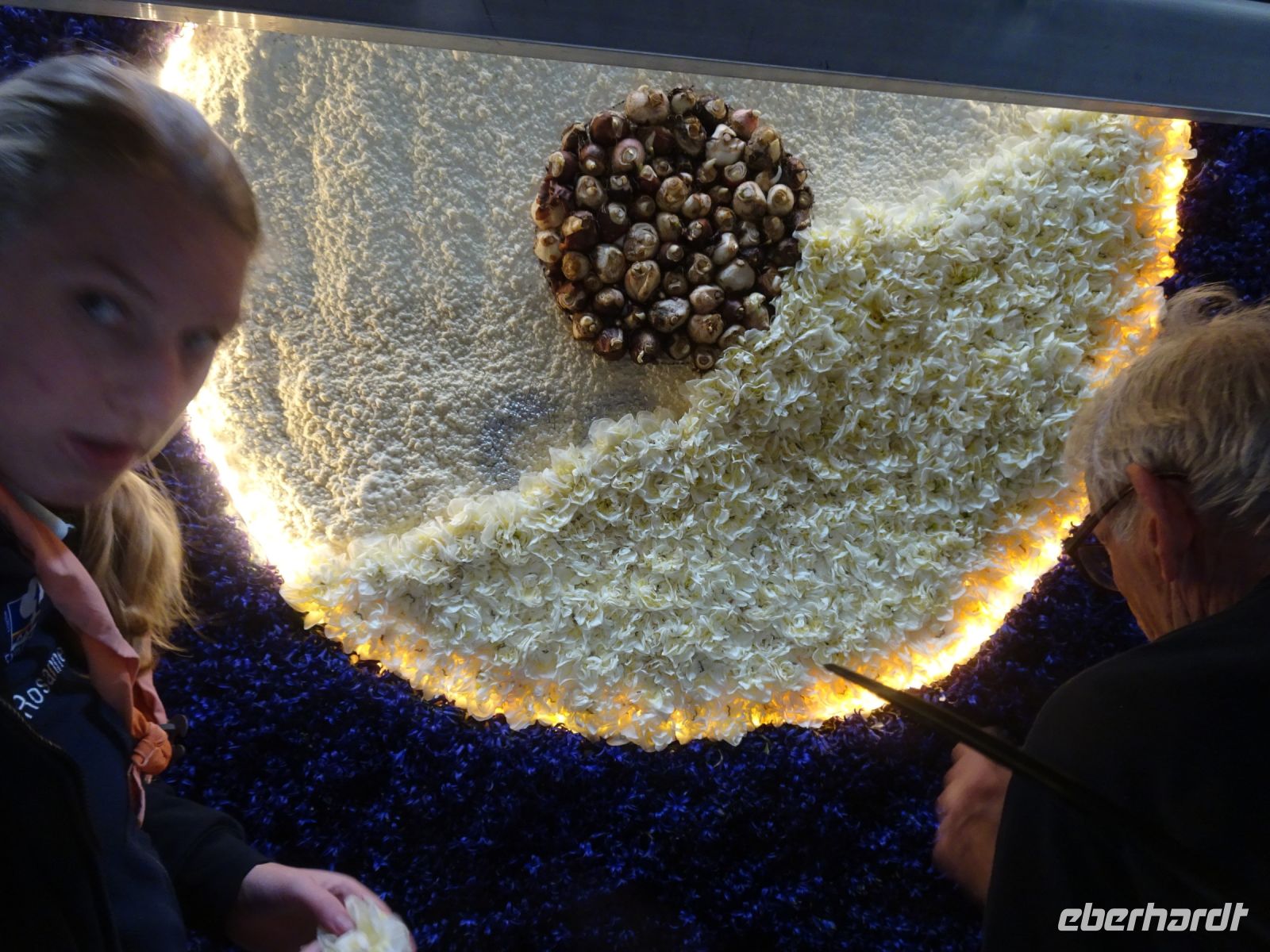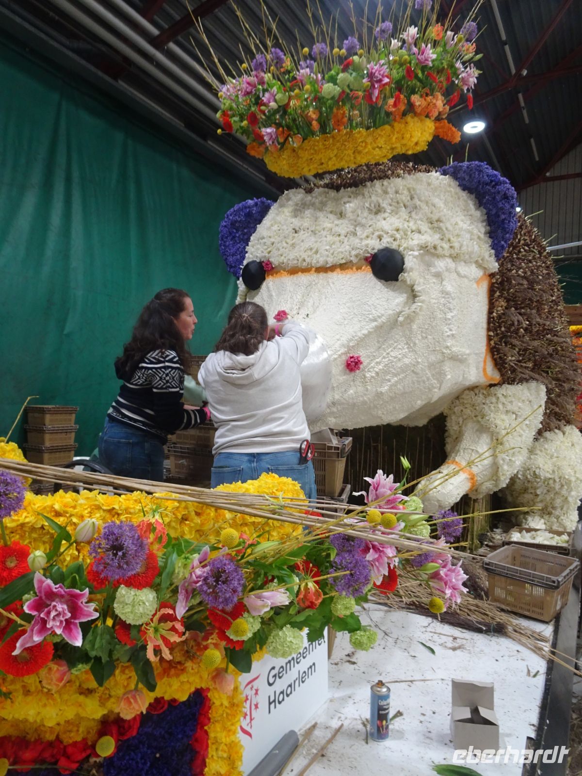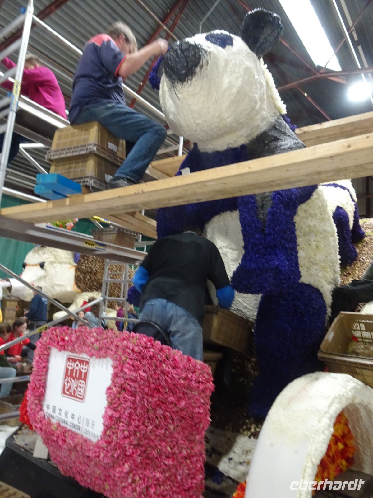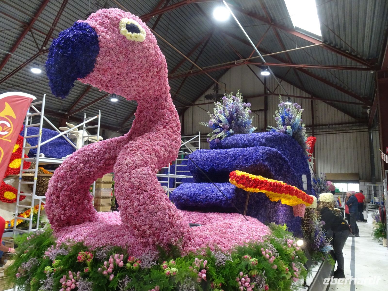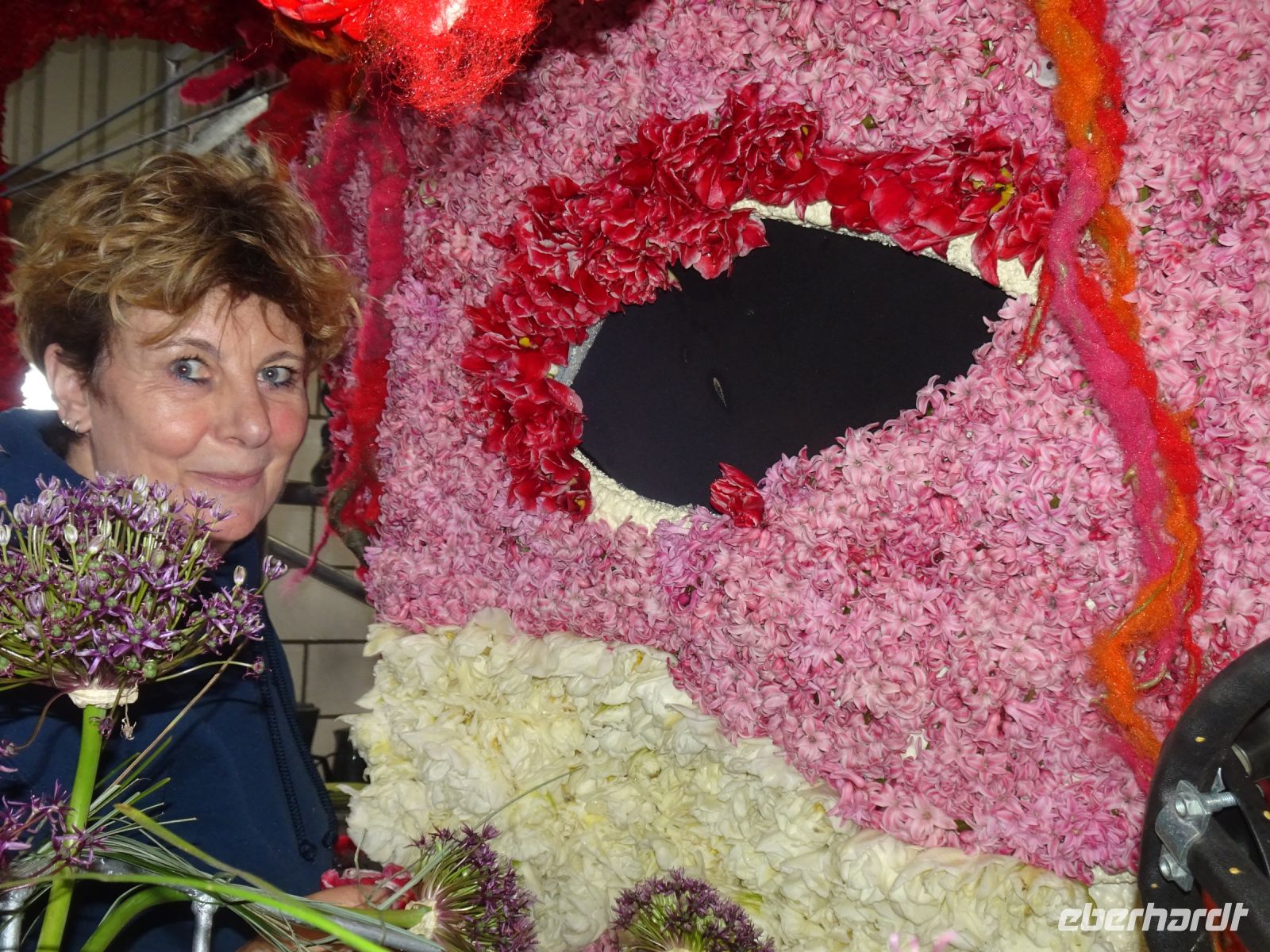 In zwei riesigen Hallen standen die Anhänger und Fahrzeuge für den Blumenkorso. Dazu Massen von vielfältigen Blumen zur Dekoration der Fahrzeuge. Und alles wie in einem Ameisenhaufen umgeben von ganz vielen Menschen - jung und alt. Wir hatten zwei Gruppen, um mit Sachkundigen durch die Hallen geführt zu werden. Ein beeindruckendes Erlebnis, wie die angelieferten Blumen für die Staffage der Fahrzeuge vorbereitet wurden. Neben langstieligen Drappierungen mussten besonders für die flächige Dekoration die kleinen Blumen alle vorbereitet werden: Stiel kurzschneiden, mit spziellen Nadeln vorbereiten und dann in den Blumenteppich einarbeiten. So sind die oft anzutreffenden Farbflächen der Beweis für die fleißige Arbeit der Helfer. Ganze Dorfgemeinschaften schienen hier tätig zu sein. Und dies bei motivierender Musik in der gesamten Halle. Ein einmaliges Erlebnis. Besonders wenn man dann im Korso erlebt, welche Mühe dahintersteckt, um nach Ende des Korso vollständig entsorgt zu werden. Wir zollten den Helfern höchste Anerkennung. Und bei vielen Wagen im Korso am Sonnabend erkannten wir die hier noch in Arbeit befindlichen Dekorationen wieder.