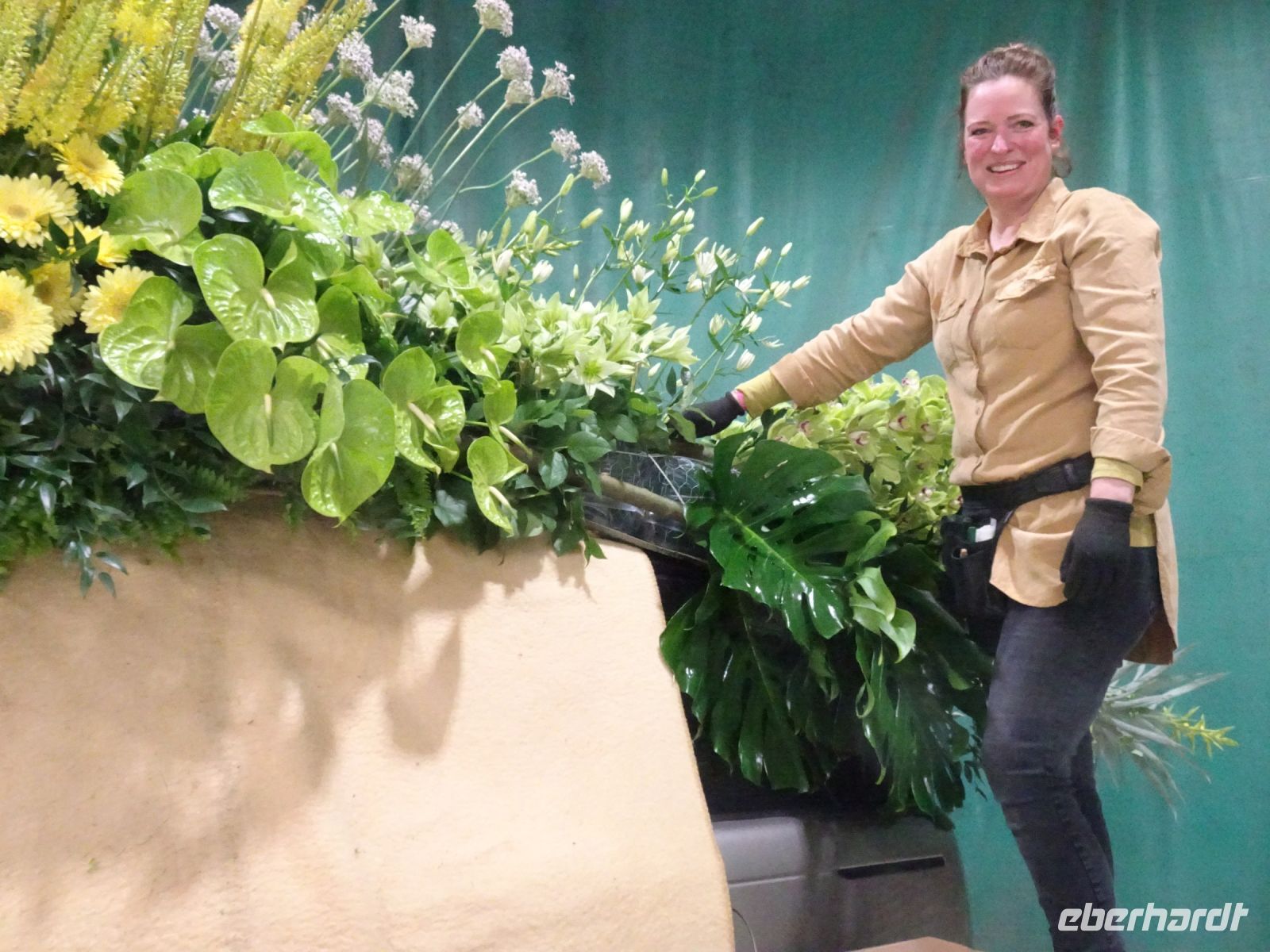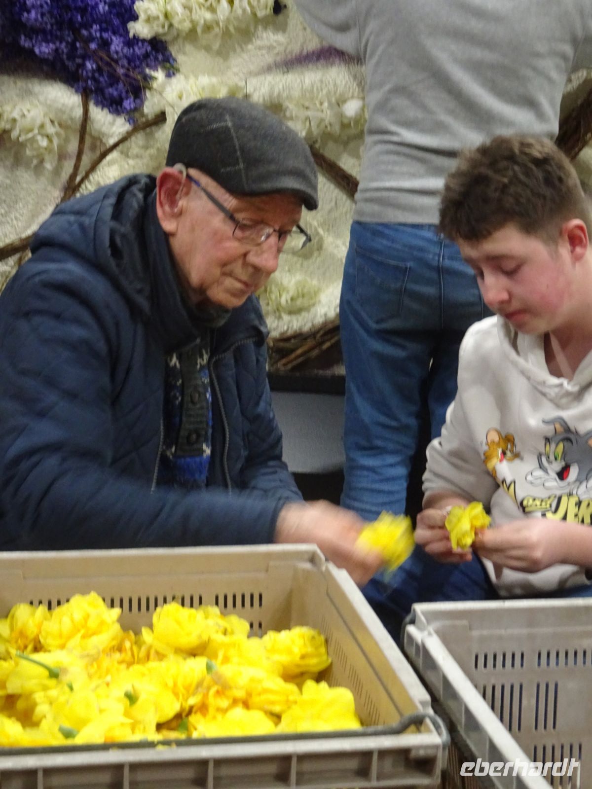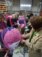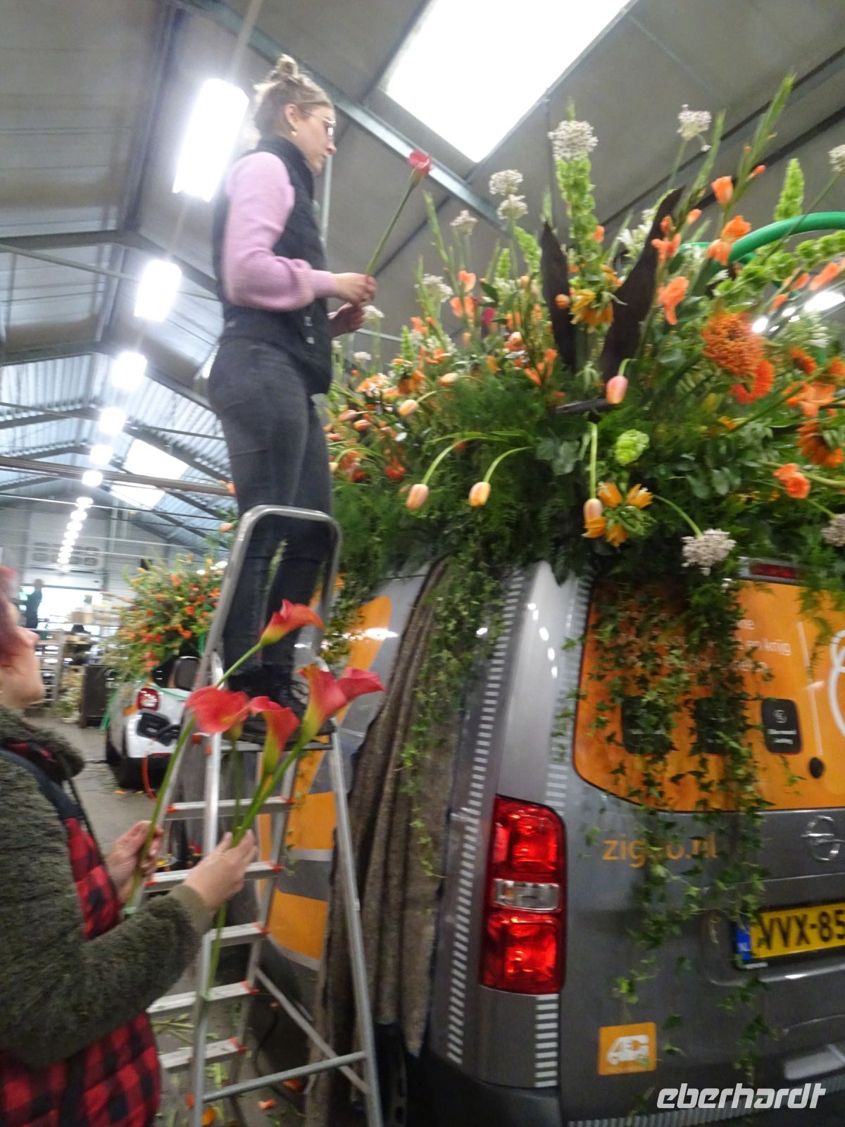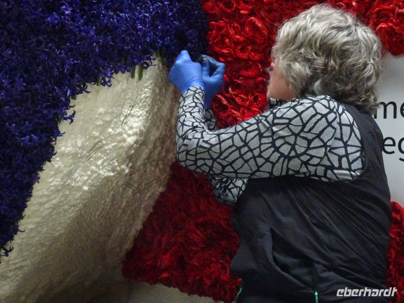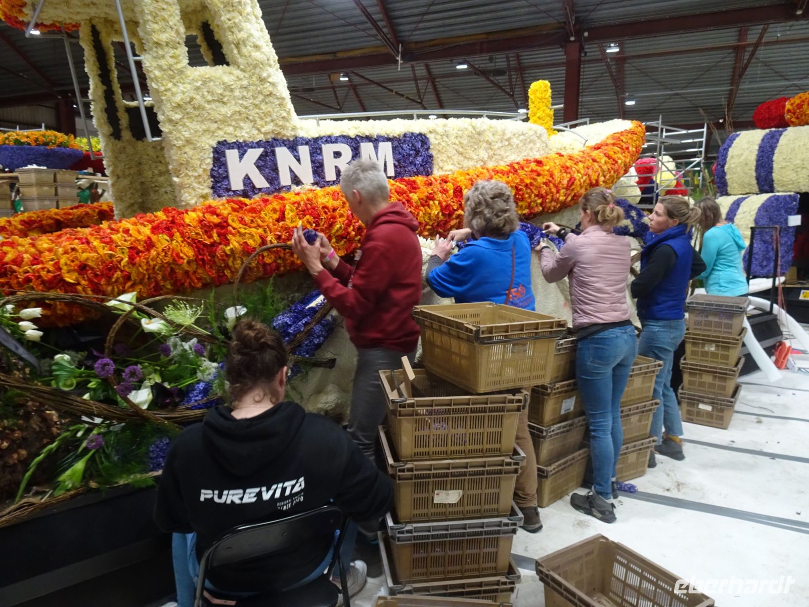 In zwei riesigen Hallen standen die Anhänger und Fahrzeuge für den Blumenkorso. Dazu Massen von vielfältigen Blumen zur Dekoration der Fahrzeuge. Und alles wie in einem Ameisenhaufen umgeben von ganz vielen Menschen - jung und alt. Wir hatten zwei Gruppen, um mit Sachkundigen durch die Hallen geführt zu werden. Ein beeindruckendes Erlebnis, wie die angelieferten Blumen für die Staffage der Fahrzeuge vorbereitet wurden. Neben langstieligen Drappierungen mussten besonders für die flächige Dekoration die kleinen Blumen alle vorbereitet werden: Stiel kurzschneiden, mit spziellen Nadeln vorbereiten und dann in den Blumenteppich einarbeiten. So sind die oft anzutreffenden Farbflächen der Beweis für die fleißige Arbeit der Helfer. Ganze Dorfgemeinschaften schienen hier tätig zu sein. Und dies bei motivierender Musik in der gesamten Halle. Ein einmaliges Erlebnis. Besonders wenn man dann im Korso erlebt, welche Mühe dahintersteckt, um nach Ende des Korso vollständig entsorgt zu werden. Wir zollten den Helfern höchste Anerkennung. Und bei vielen Wagen im Korso am Sonnabend erkannten wir die hier noch in Arbeit befindlichen Dekorationen wieder.