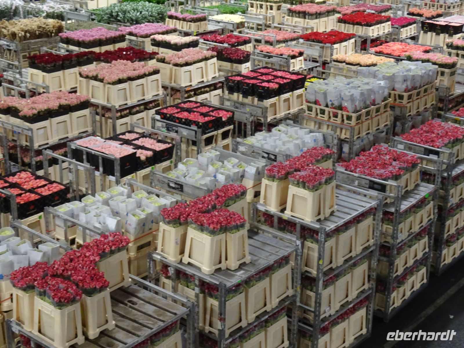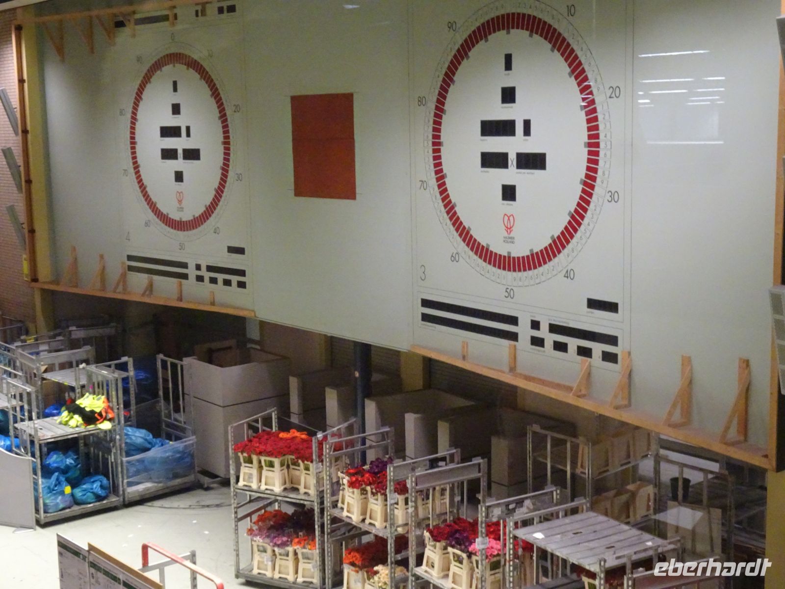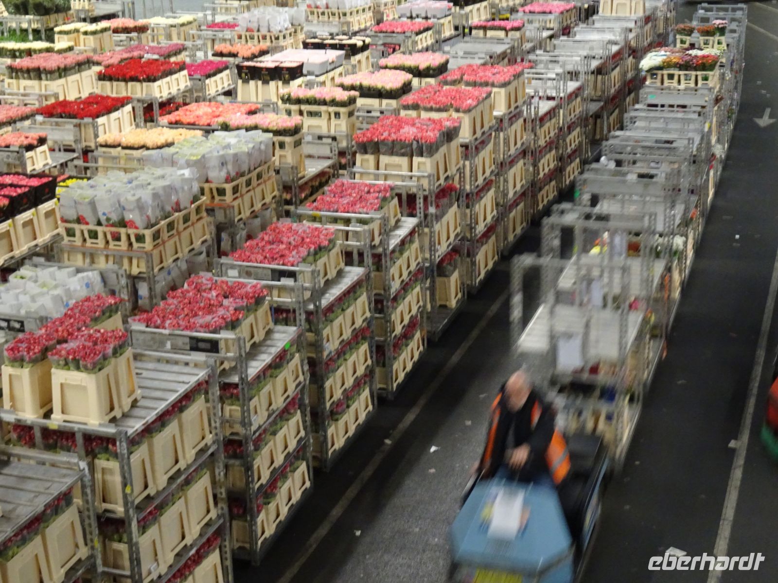 Von einer Galerie von je fast 1000 m hin und zurück über dem Marktgeschehen erlebten wir ein Meer von Schnittblumen aller Art in Transportbehältnissen und mehretagigen Regalwagen, die für die Kaufer mit einer Armada an Elektroscootern zusammengestellt und zu den Transportfahrzeugen gefahren wurden. Denn wir als Käufer in fast ganz Europa wollen ja am kommenden Tag bereits die Blumen für das Wochenende im Geschäft haben. Die eigentliche Auktion findet heute nicht mehr in dem historischen Versteigerungssaal statt, sondern per Internet. Erläuterungstafeln gaben uns einen Einblick, wie diese Genossenschafft zwischen Erzeugern und uns als Kunden funktioniert. Und wer wollte konnte auch mit sich einen Videoclip erstellen, wie man gewissermaßen selbst auf einem Elektroscooter durch die Hallen düst. Toll!