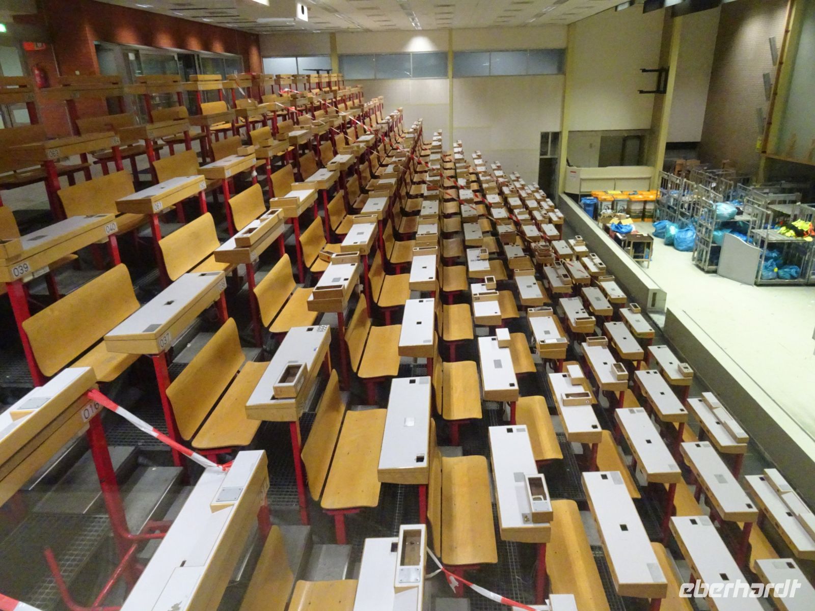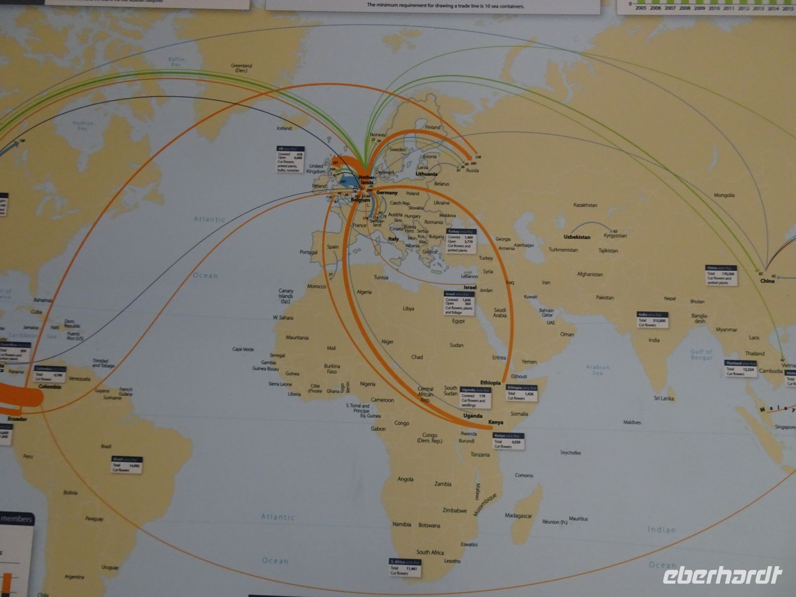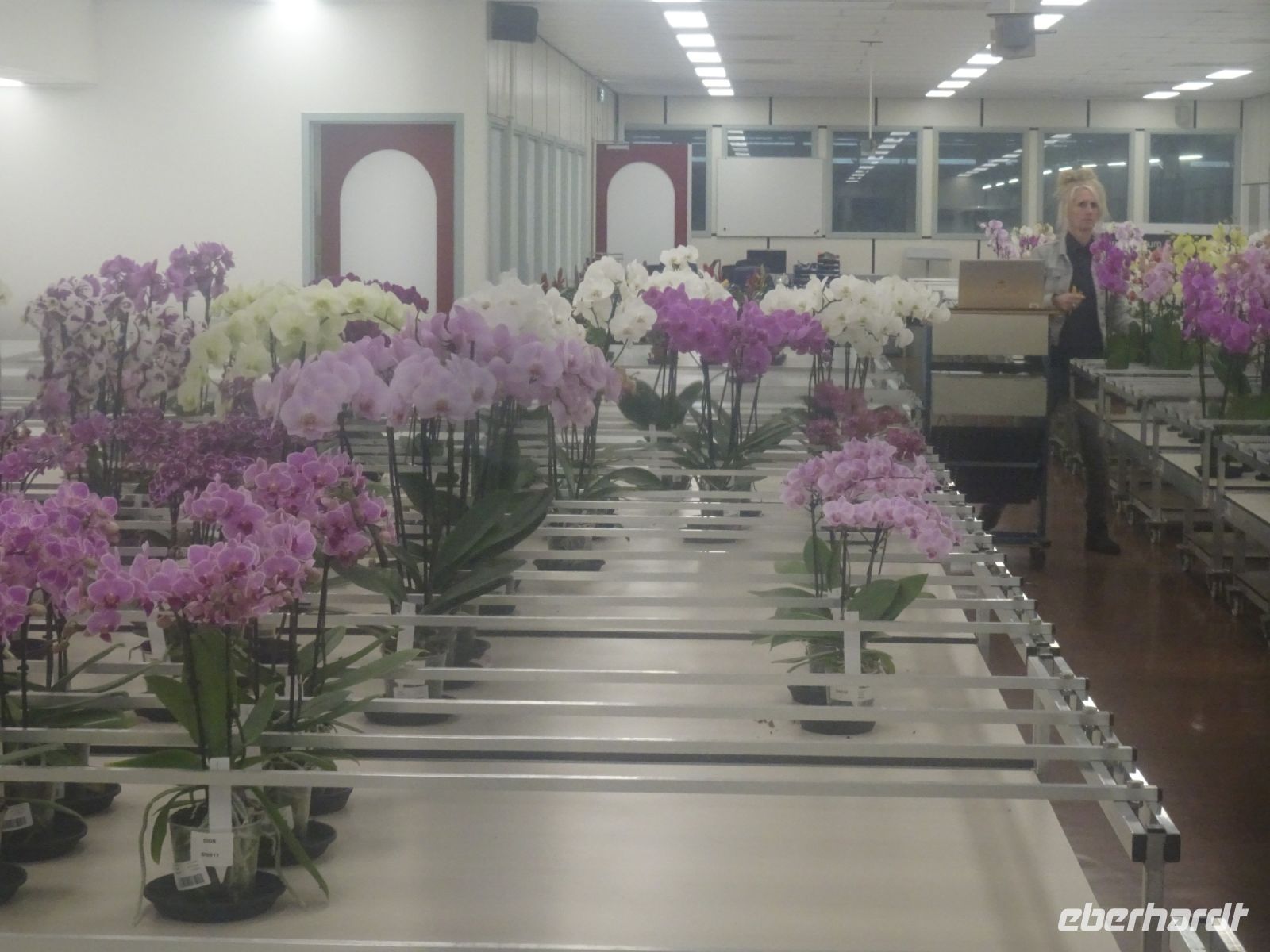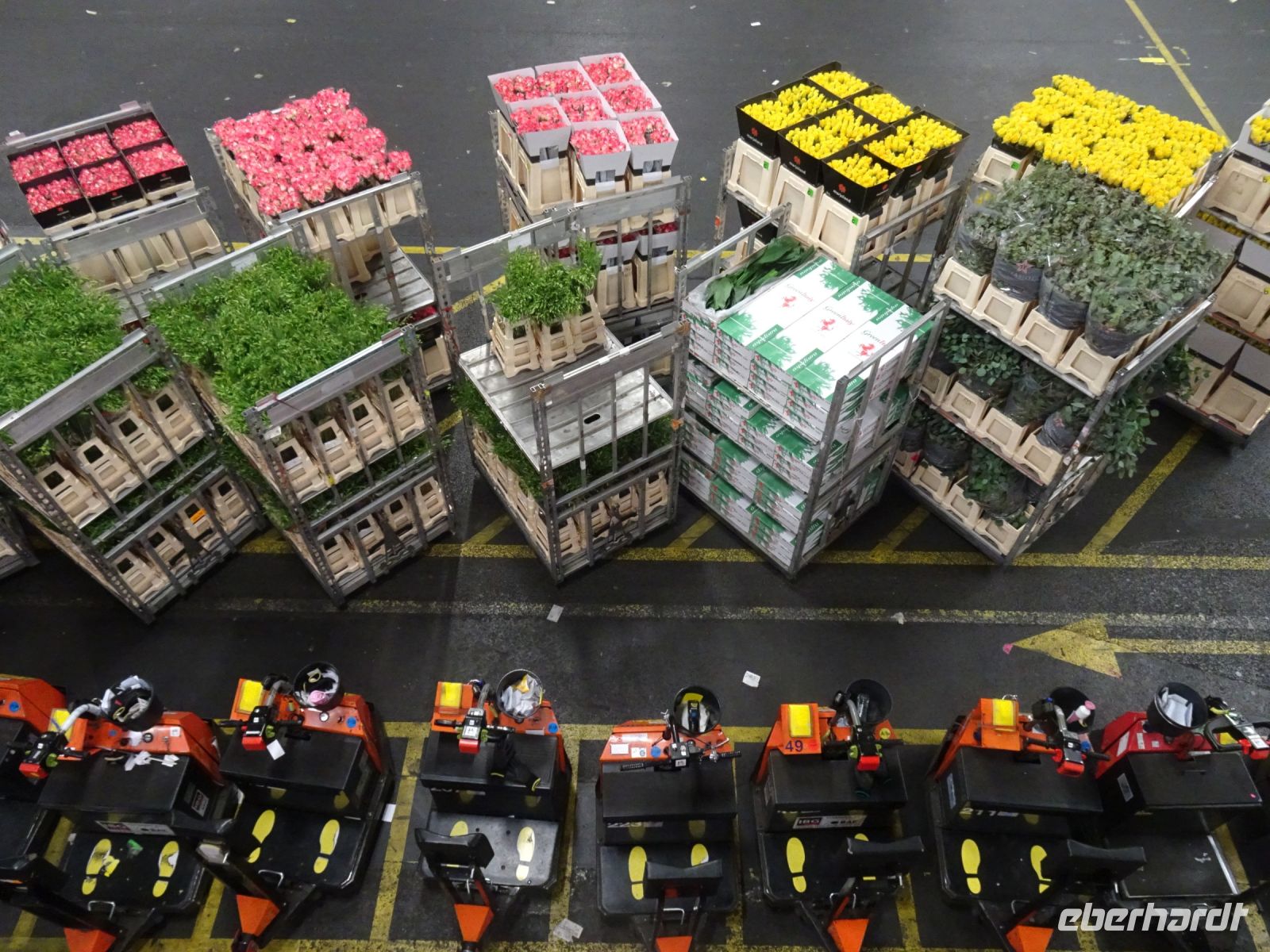 Von einer Galerie von je fast 1000 m hin und zurück über dem Marktgeschehen erlebten wir ein Meer von Schnittblumen aller Art in Transportbehältnissen und mehretagigen Regalwagen, die für die Kaufer mit einer Armada an Elektroscootern zusammengestellt und zu den Transportfahrzeugen gefahren wurden. Denn wir als Käufer in fast ganz Europa wollen ja am kommenden Tag bereits die Blumen für das Wochenende im Geschäft haben. Die eigentliche Auktion findet heute nicht mehr in dem historischen Versteigerungssaal statt, sondern per Internet. Erläuterungstafeln gaben uns einen Einblick, wie diese Genossenschafft zwischen Erzeugern und uns als Kunden funktioniert. Und wer wollte konnte auch mit sich einen Videoclip erstellen, wie man gewissermaßen selbst auf einem Elektroscooter durch die Hallen düst. Toll!