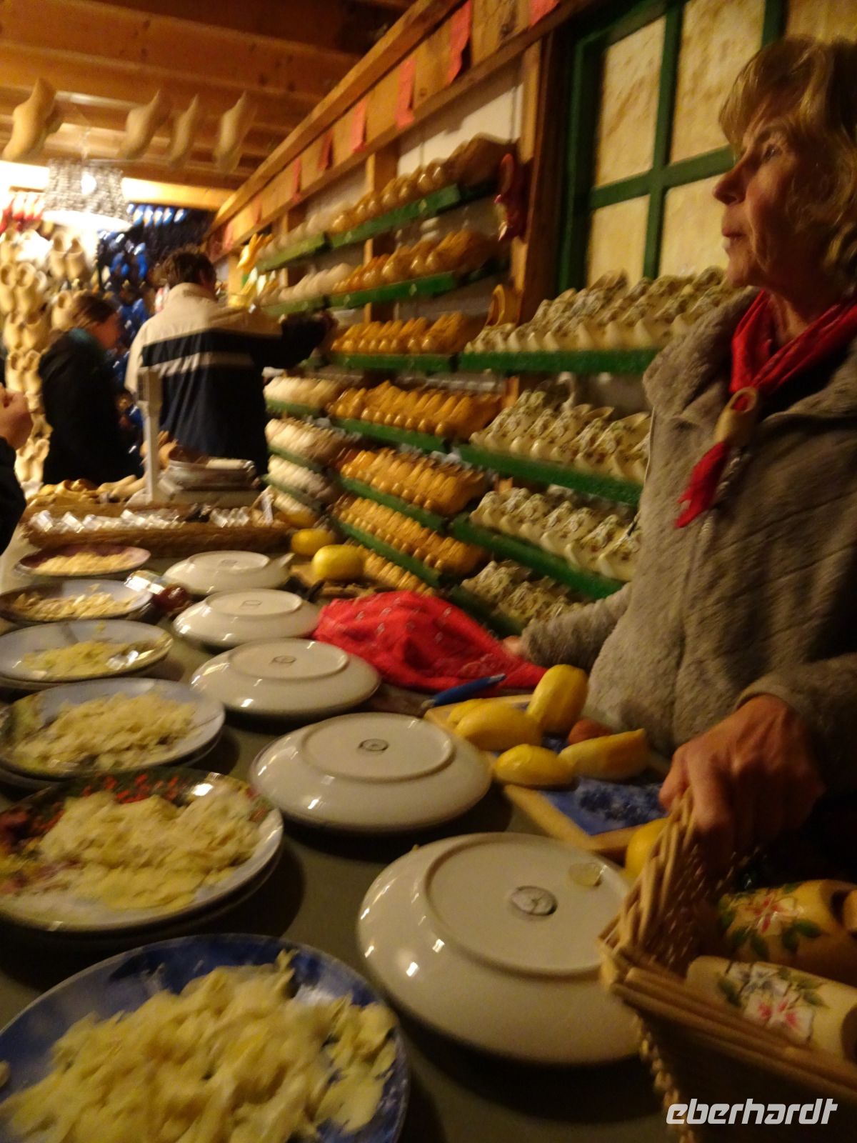 Am Nachmittag stand dann der Besuch des typischen Hollanddorfes Zaanse Schans auf dem Programm. Ein typischer Bauernhof, die Catharina Hoeve mit der Käserei von Henri Willig, die Vorführung der Holzschuhfertigung mit Ausstellung vielfältiger Holzschuhe von praktisch bis edel, eine große Zahl an Verkaufsständen von Diamanten bis Süßigkeiten und natürlich mehrere Mühlen waren zu bsichtigen.