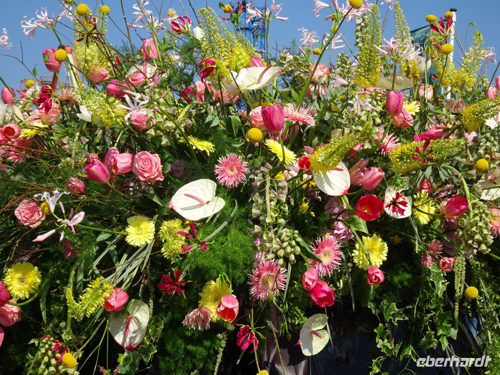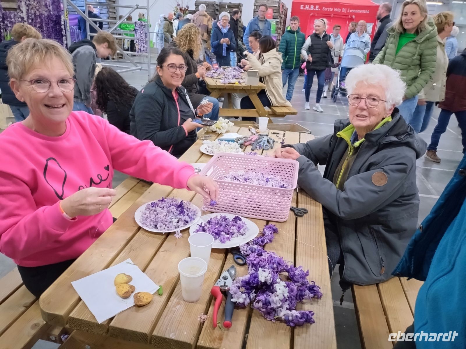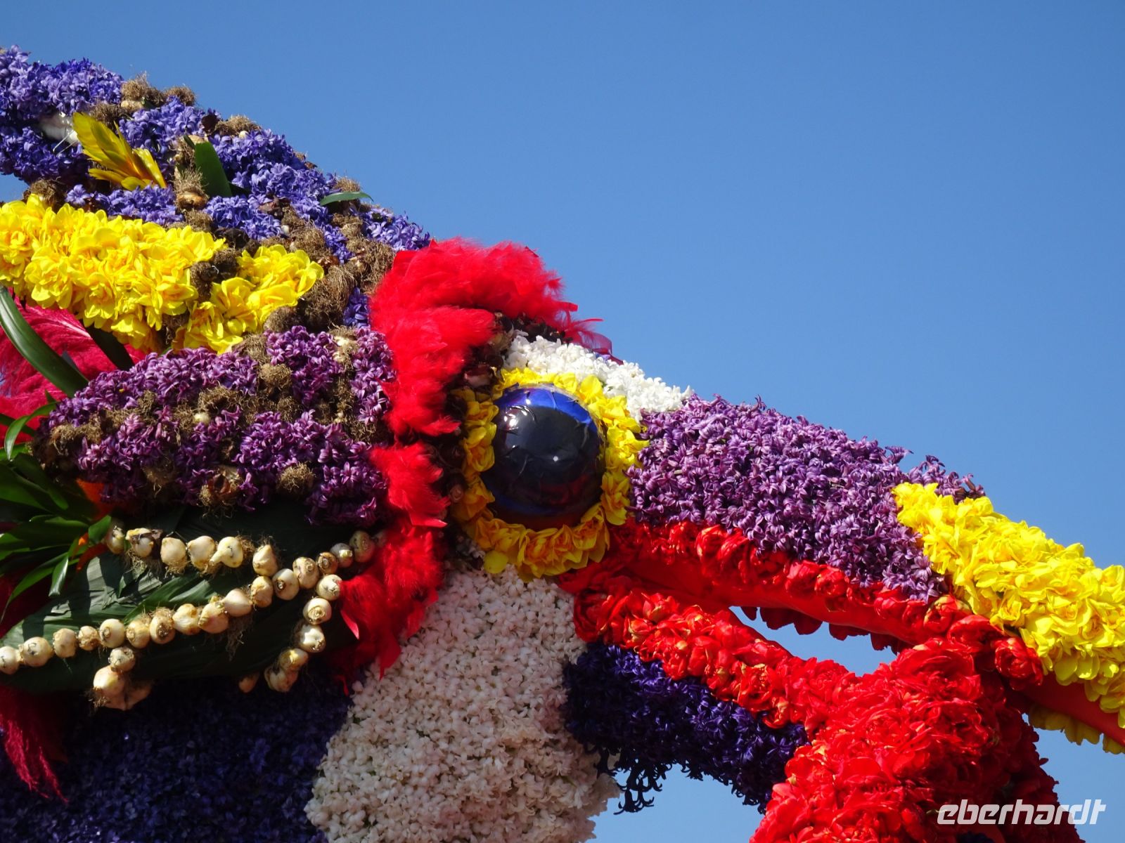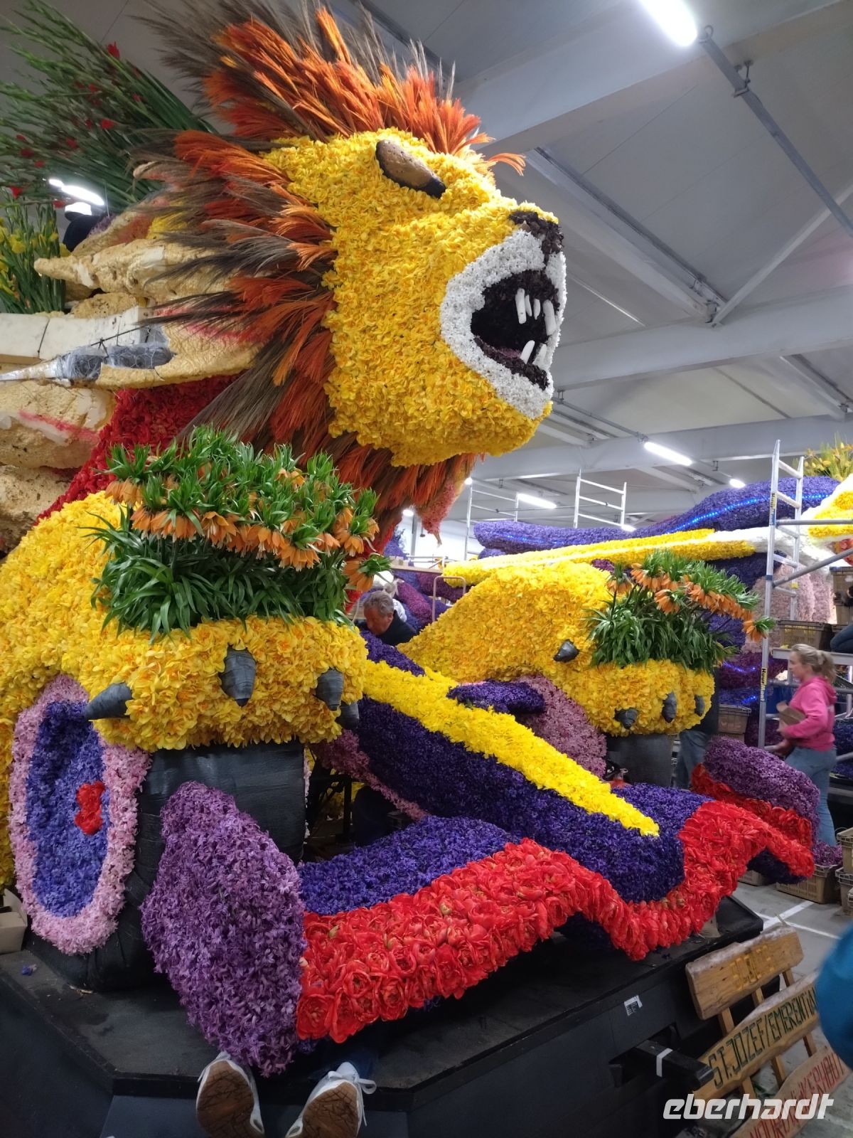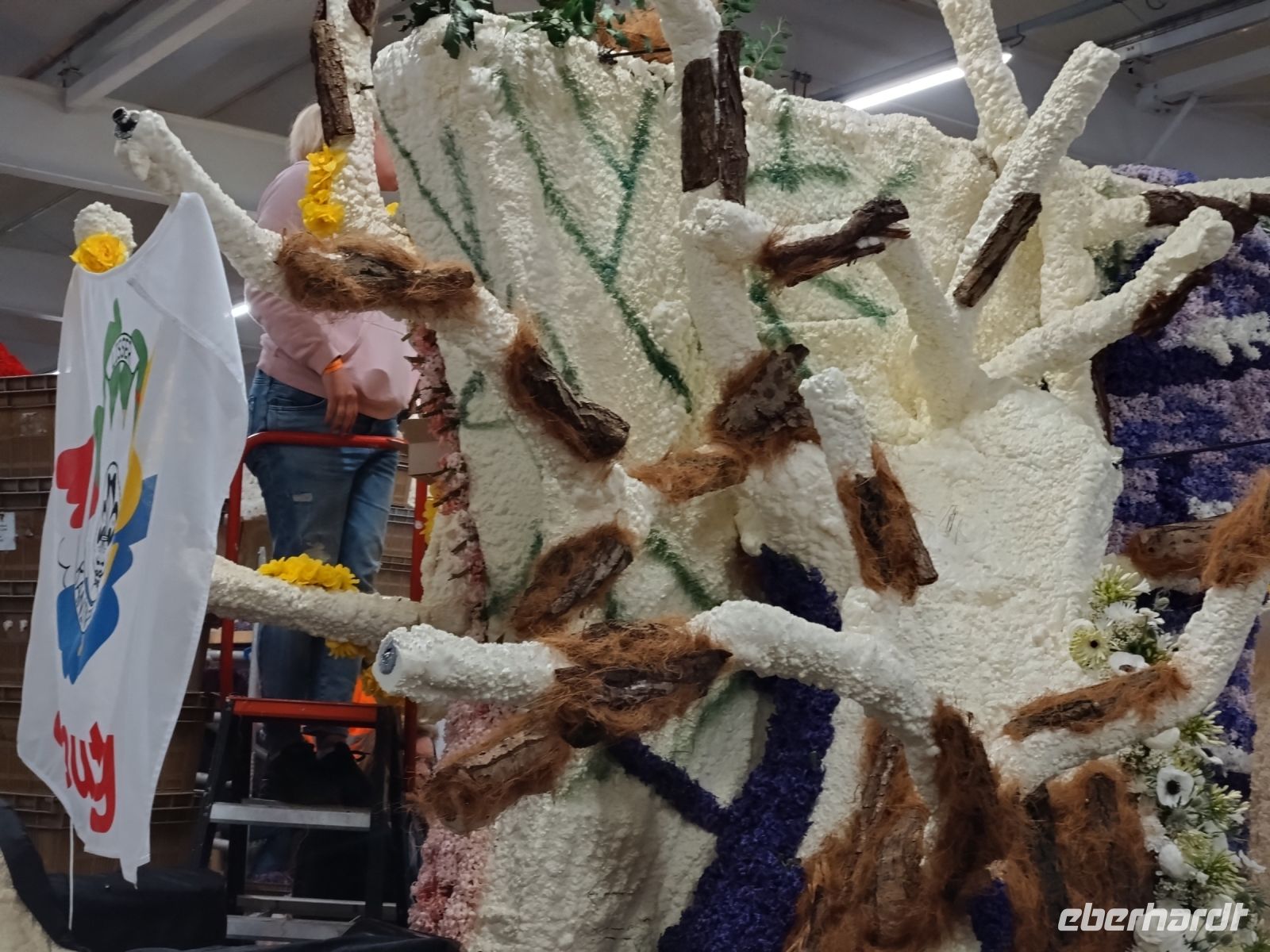 In zwei riesigen Hallen standen die Anhänger und Fahrzeuge für den Blumenkorso. Dazu Massen von vielfältigen Blumen zur Dekoration der Wagen und Fahrzeuge. Und alles wie in einem Ameisenhaufen umgeben von ganz vielen Menschen - jung und alt. Wir bildeten zwei Gruppen, um von Sachkundigen durch die Hallen geführt zu werden. Ein beeindruckendes Erlebnis, wie die angelieferten Blumen für die Staffage der Fahrzeuge vorbereitet wurden. Neben langstieligen Drappierungen mussten besonders für die flächige Dekoration die kleinen Blumen alle vorbereitet werden: Stiel kurzschneiden, mit speziellen Nadeln vorbereiten und dann in den Blumenteppich einarbeiten. So sind die oft anzutreffenden Farbflächen der Beweis für die fleißige Arbeit der Helfer. Ganze Dorfgemeinschaften waren hier tätig. Und dies bei motivierender Musik in der gesamten Halle. Ein einmaliges Erlebnis. Besonders, wenn man dann im Korso erlebt, welche Mühe dahintersteckt, um nach Ende des Korso vollständig entsorgt zu werden. Wir zollten den Helfern höchste Anerkennung. Und bei vielen Wagen im Korso am Sonnabend erkannten wir die hier noch in Arbeit befindlichen Dekorationen wieder.