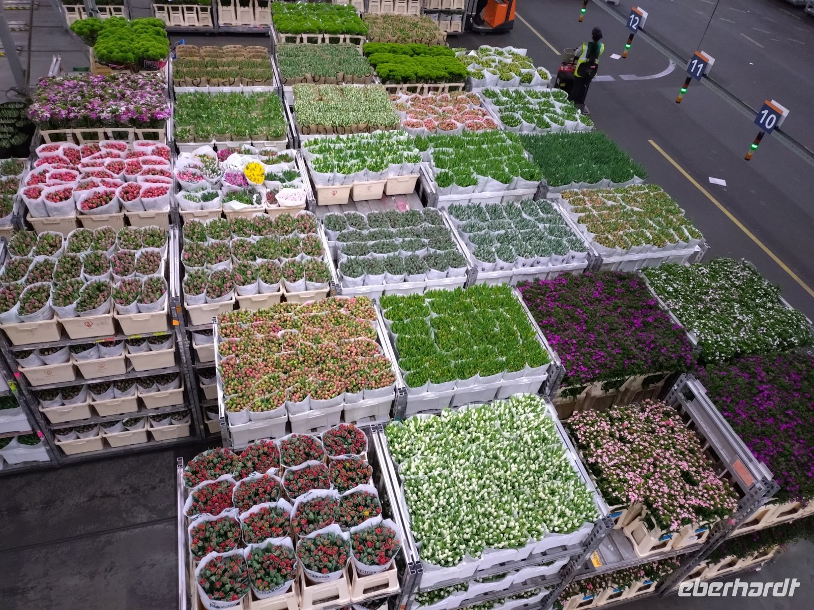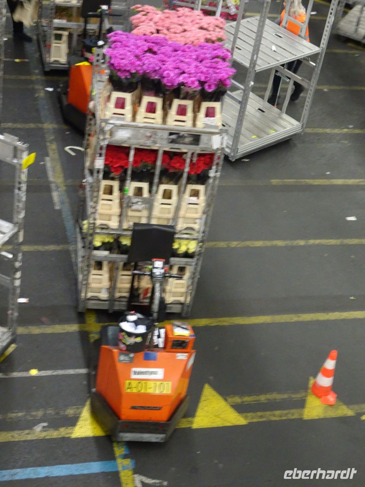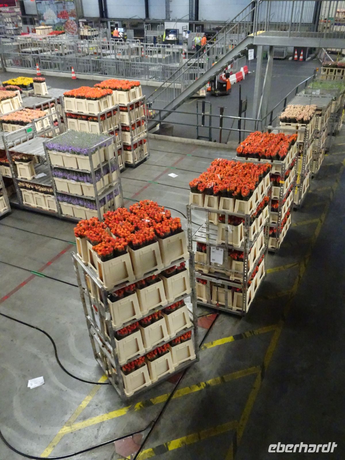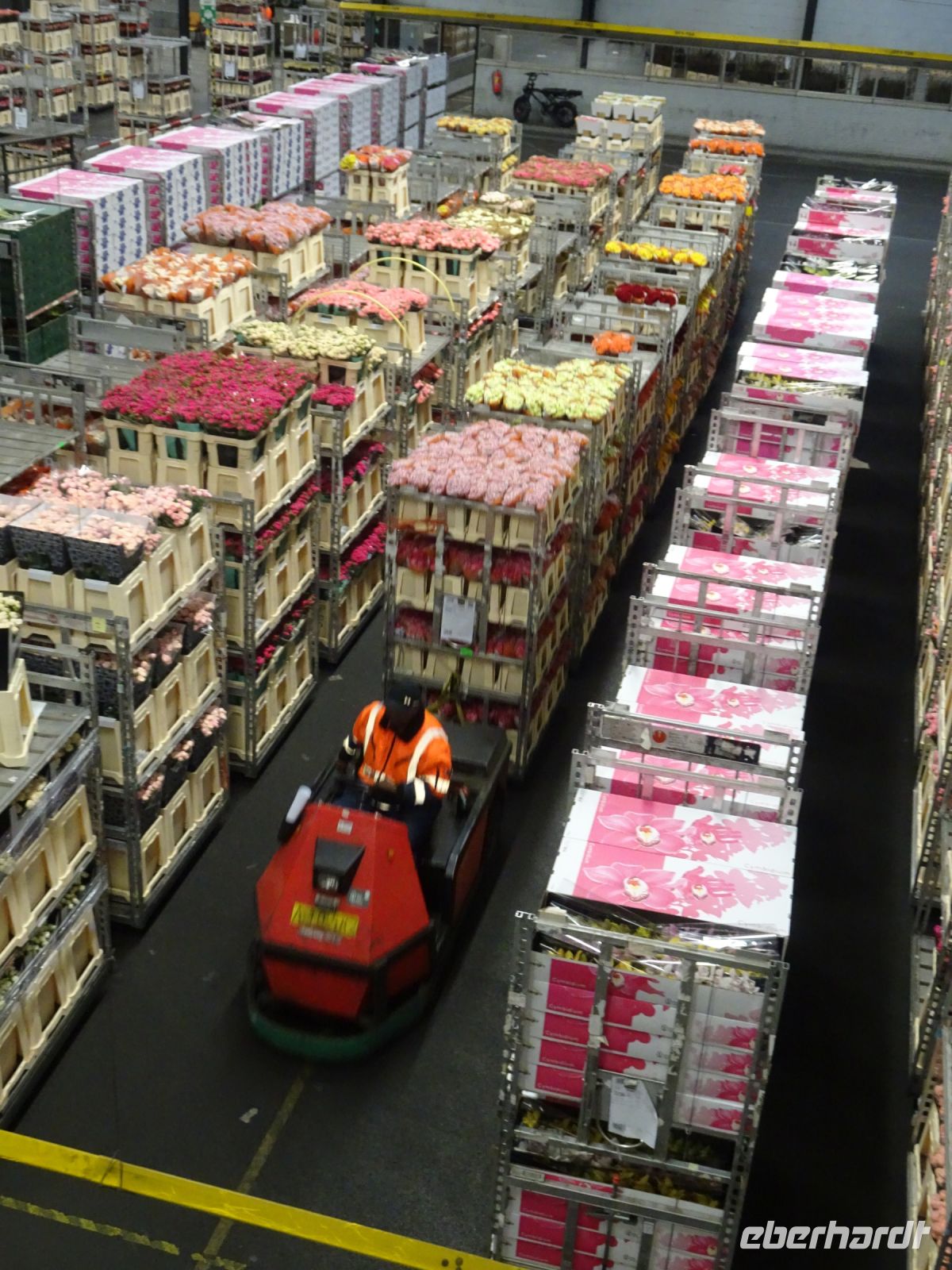 Von einer Galerie von je fast 1000 m hin und zurück über dem Marktgeschehen erlebten wir ein Meer von Schnittblumen aller Art in Transportbehältnissen und mehretagigen Regalwagen, die für die Kaufer mit einer Armada an Elektroscootern zusammengestellt und zu den Transportfahrzeugen gefahren wurden. Denn wir als Käufer in fast ganz Europa wollen ja am kommenden Tag bereits die Blumen für das Wochenende im Geschäft haben. Die eigentliche Auktion findet heute nicht mehr in dem historischen Versteigerungssaal statt, sondern per Internet. Erläuterungstafeln gaben uns einen Einblick, wie diese Genossenschaft zwischen Erzeugern und über Großhändler uns als Kunden funktioniert. Und wer wollte, konnte auch mit sich einen Videoclip erstellen, wie man gewissermaßen selbst auf einem Elektroscooter durch die Hallen düst. Toll!
