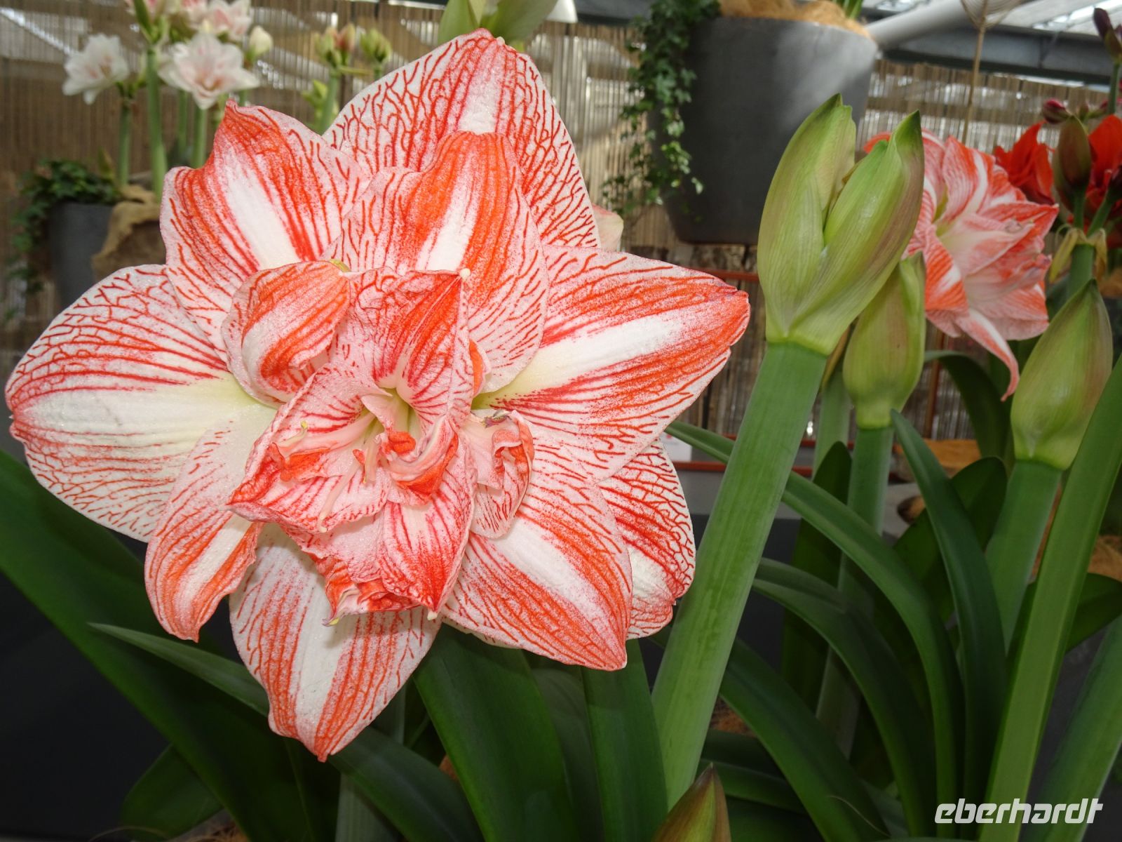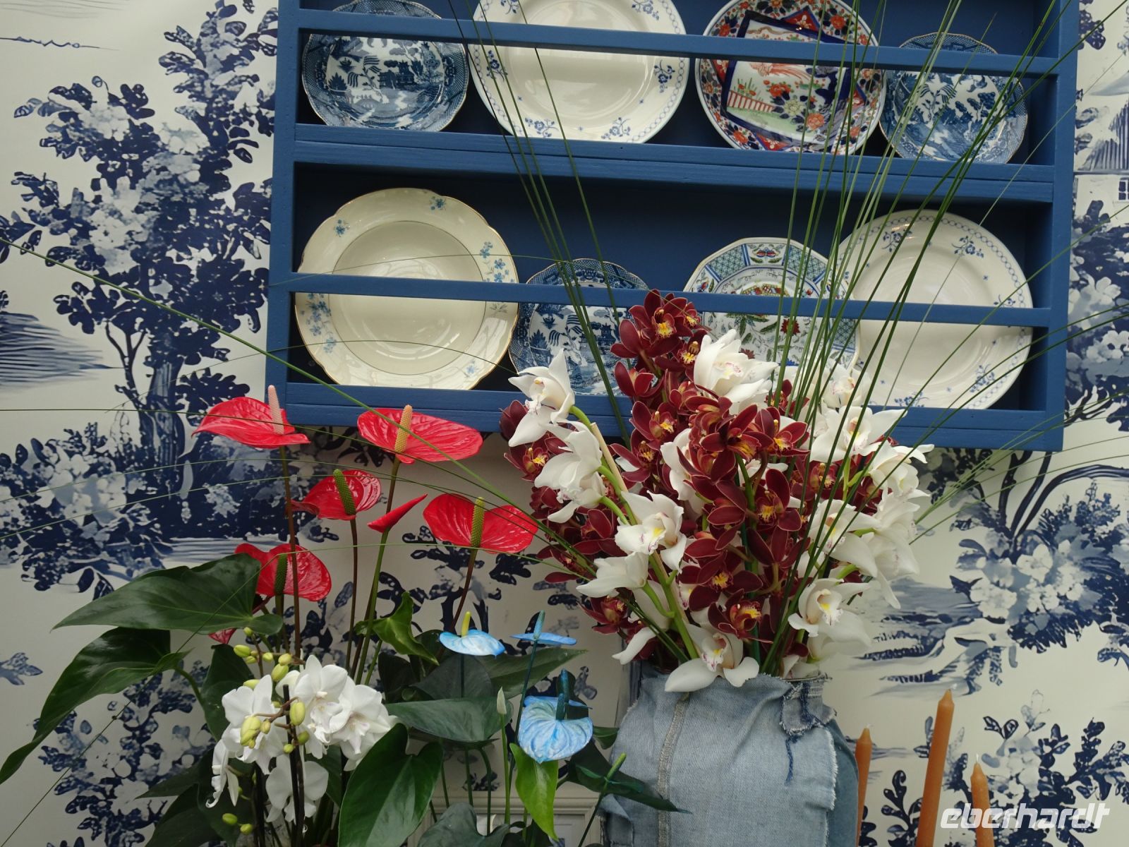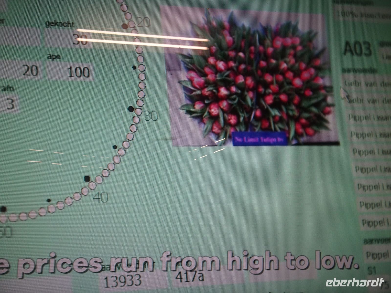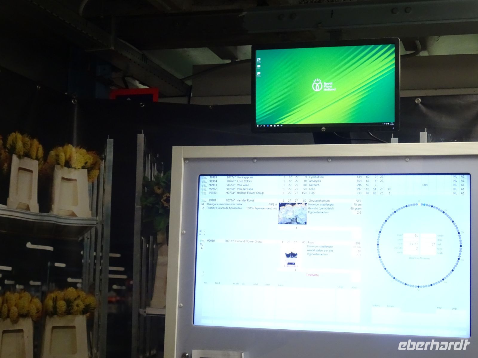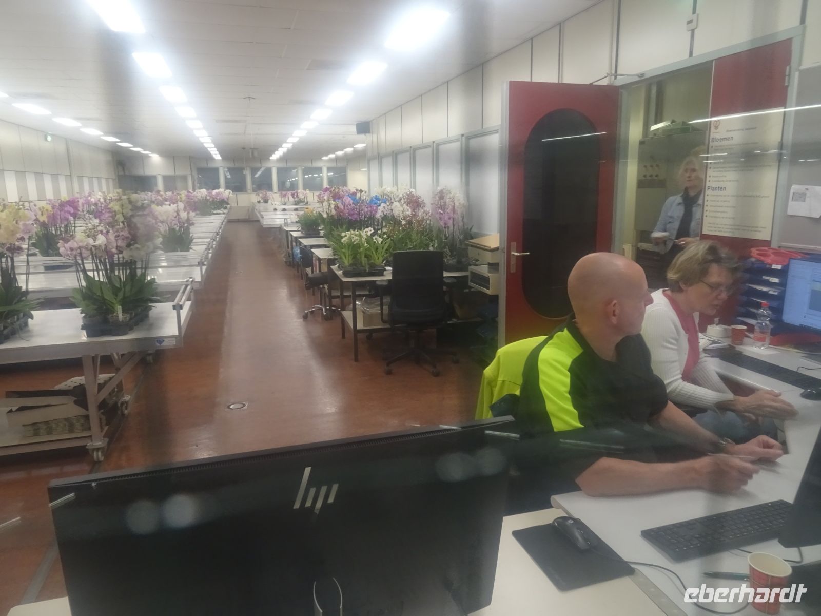 Von einer Galerie von je fast 1000 m hin und zurück über dem Marktgeschehen erlebten wir ein Meer von Schnittblumen aller Art in Transportbehältnissen und mehretagigen Regalwagen, die für die Kaufer mit einer Armada an Elektroscootern zusammengestellt und zu den Transportfahrzeugen gefahren wurden. Denn wir als Käufer in fast ganz Europa wollen ja am kommenden Tag bereits die Blumen für das Wochenende im Geschäft haben. Die eigentliche Auktion findet heute nicht mehr in dem historischen Versteigerungssaal statt, sondern per Internet. Erläuterungstafeln gaben uns einen Einblick, wie diese Genossenschaft zwischen Erzeugern und über Großhändler uns als Kunden funktioniert. Und wer wollte, konnte auch mit sich einen Videoclip erstellen, wie man gewissermaßen selbst auf einem Elektroscooter durch die Hallen düst. Toll!