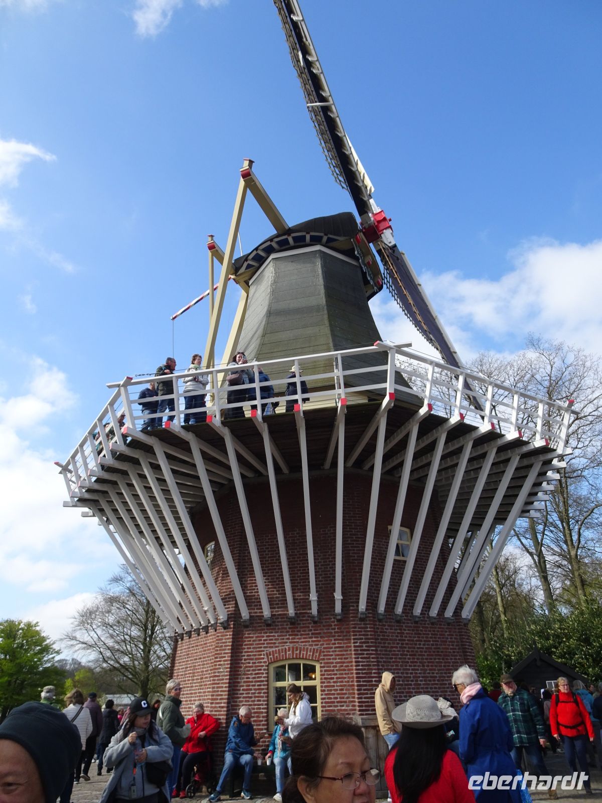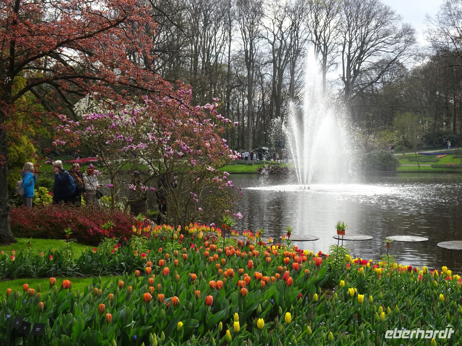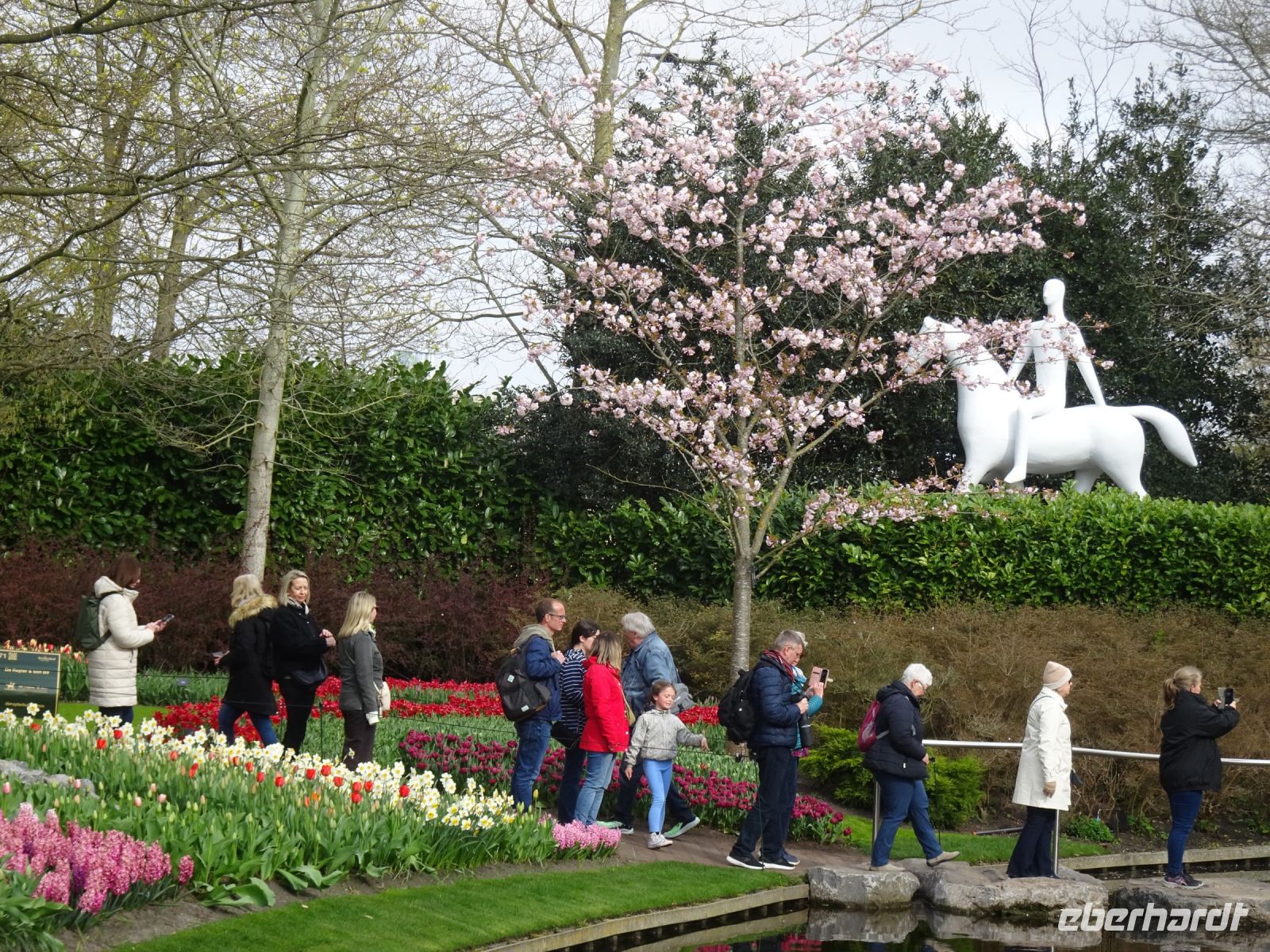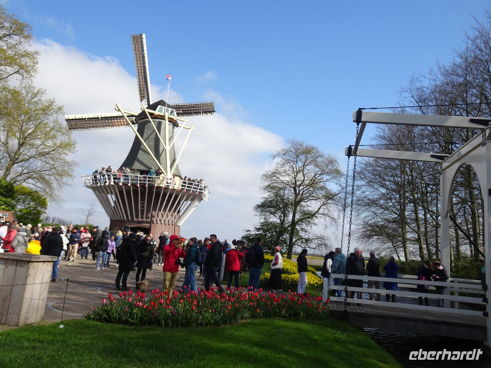 Nach einem guten Frühstück vom Buffet starteten wir um 8:30 Uhr zum Keukenhof bei Lisse. Rechtzeitige Ankunft ist empfehlenswert, da wir nicht die einzigen Besucher waren. Ausgestattet mit Übersichtsplänen und nach vorheriger Information über die Highlights auf dem Ausstellungsgelände durch unseren Reiseleiter Hartwig gestaltete jeder seinen Aufenthalt individuell. Drehorgel mit Dauermusik, typische Windmühle, Kahnfahrten, aber auch Blumenbindekunst, fachmännische gärtnerische Hinweise sowie Bilder zur über 75jährigen Geschichte des Keukenhofes gab es zu erleben. Besonders prächtig die in die Parklandschaft eingebetteten und hervorragend gepflegten Blumenbeete mit einer Farben- und Artenvielfalt aller Zwiebelgewächse, allem voran natürlich die Tulpen. Allerdings waren auf Grund kühler Witterung erst die frühen Tulpensorten aufgeblüht und vilefältige und prächtige Narzissen gaben interessante Farbtupfer, begleitet unter anderem von Magnolienblüten. Besonders empfehlenswert auch die Beet und Blumenkreationen in den Hallen. Wetterbeständig waren hier Riesen-Tulpen besondere Hingucker. Und nur hier: Amaryllen in einer erstaunlichen Vielfalt, wunderbar drappiert.