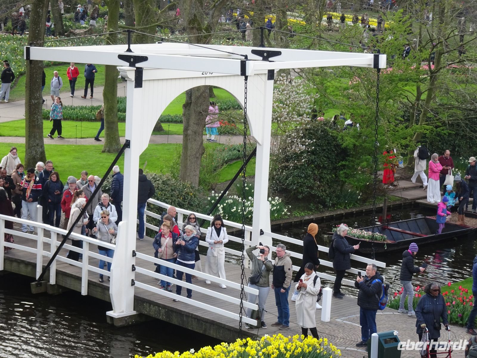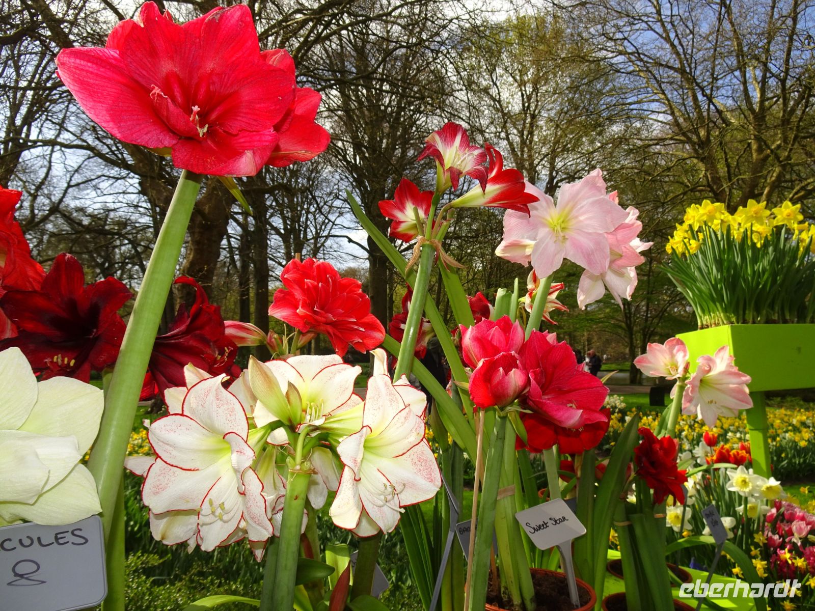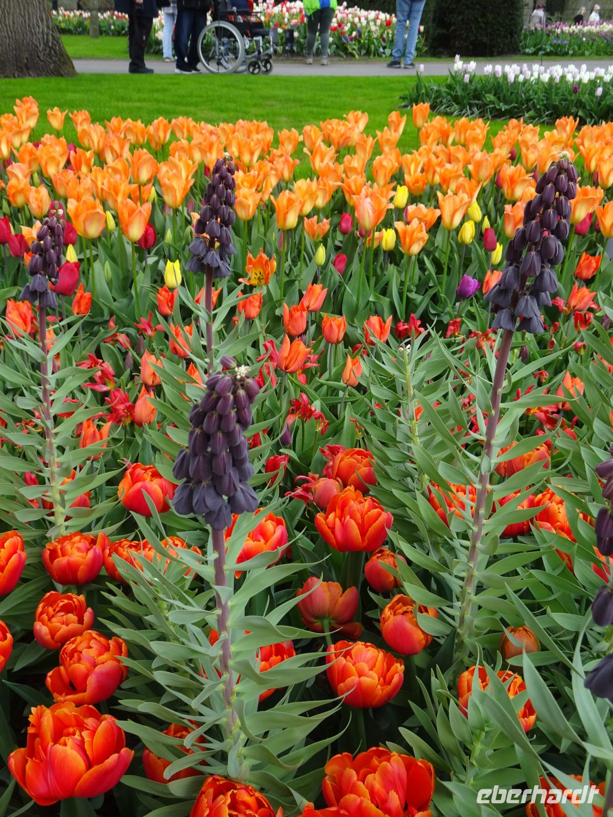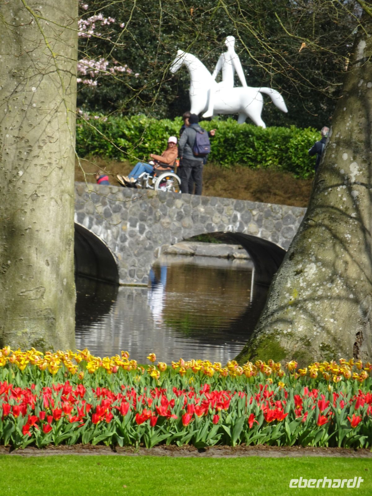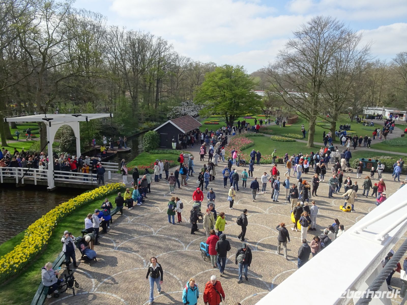 Nach einem guten Frühstück vom Buffet starteten wir um 8:30 Uhr zum Keukenhof bei Lisse. Rechtzeitige Ankunft ist empfehlenswert, da wir nicht die einzigen Besucher waren. Ausgestattet mit Übersichtsplänen und nach vorheriger Information über die Highlights auf dem Ausstellungsgelände durch unseren Reiseleiter Hartwig gestaltete jeder seinen Aufenthalt individuell. Drehorgel mit Dauermusik, typische Windmühle, Kahnfahrten, aber auch Blumenbindekunst, fachmännische gärtnerische Hinweise sowie Bilder zur über 75jährigen Geschichte des Keukenhofes gab es zu erleben. Besonders prächtig die in die Parklandschaft eingebetteten und hervorragend gepflegten Blumenbeete mit einer Farben- und Artenvielfalt aller Zwiebelgewächse, allem voran natürlich die Tulpen. Allerdings waren auf Grund kühler Witterung erst die frühen Tulpensorten aufgeblüht und vilefältige und prächtige Narzissen gaben interessante Farbtupfer, begleitet unter anderem von Magnolienblüten. Besonders empfehlenswert auch die Beet und Blumenkreationen in den Hallen. Wetterbeständig waren hier Riesen-Tulpen besondere Hingucker. Und nur hier: Amaryllen in einer erstaunlichen Vielfalt, wunderbar drappiert.