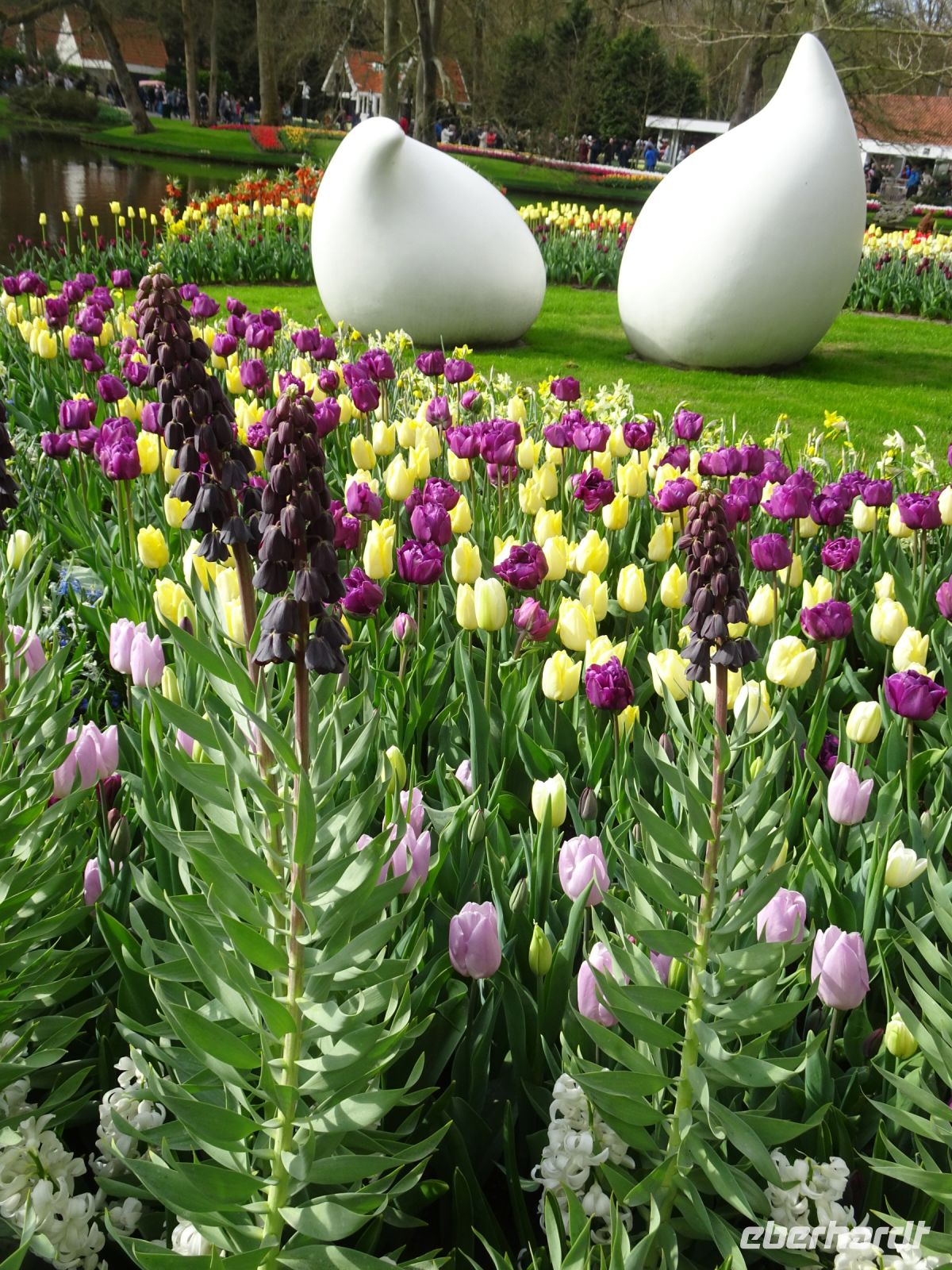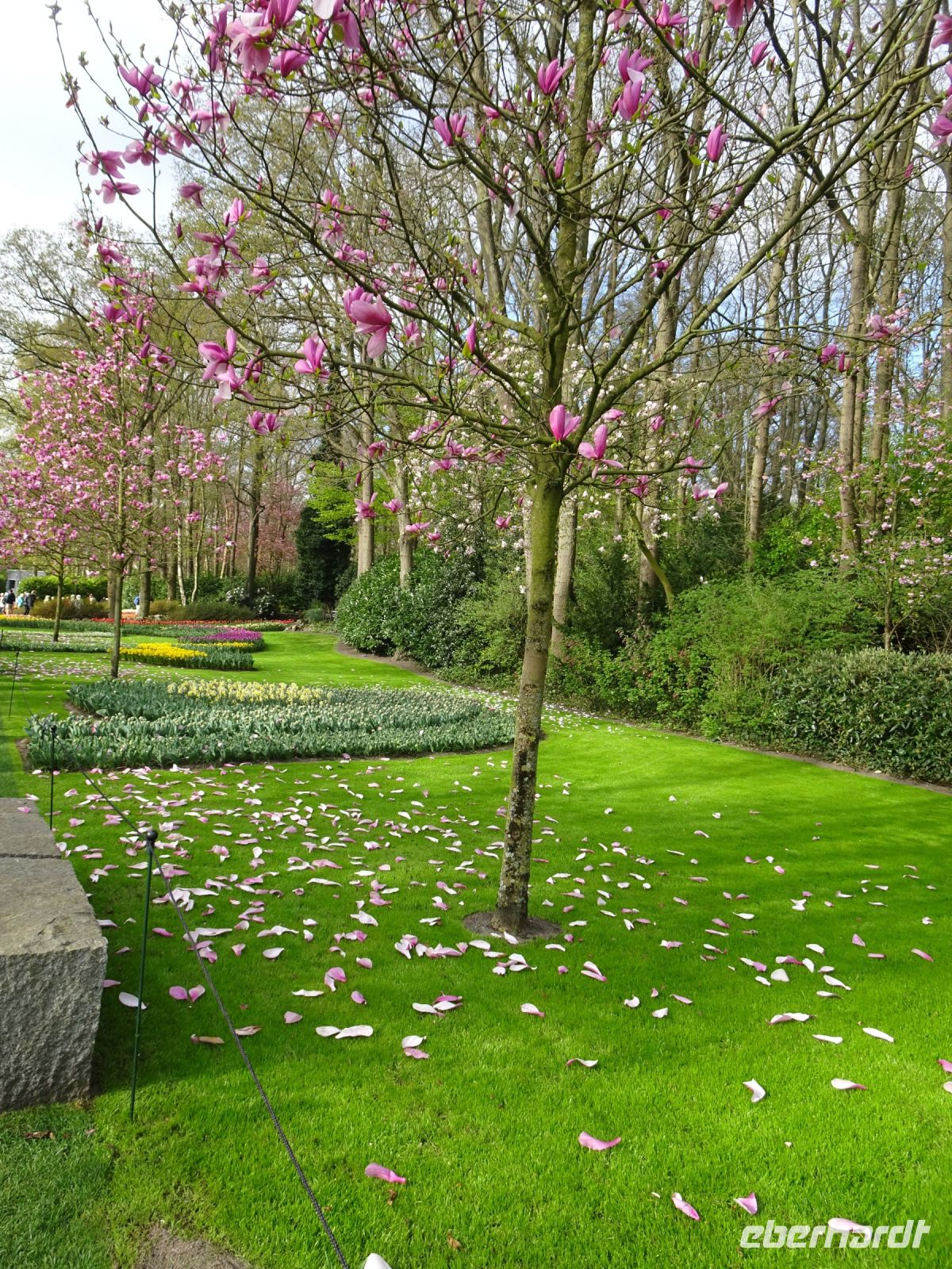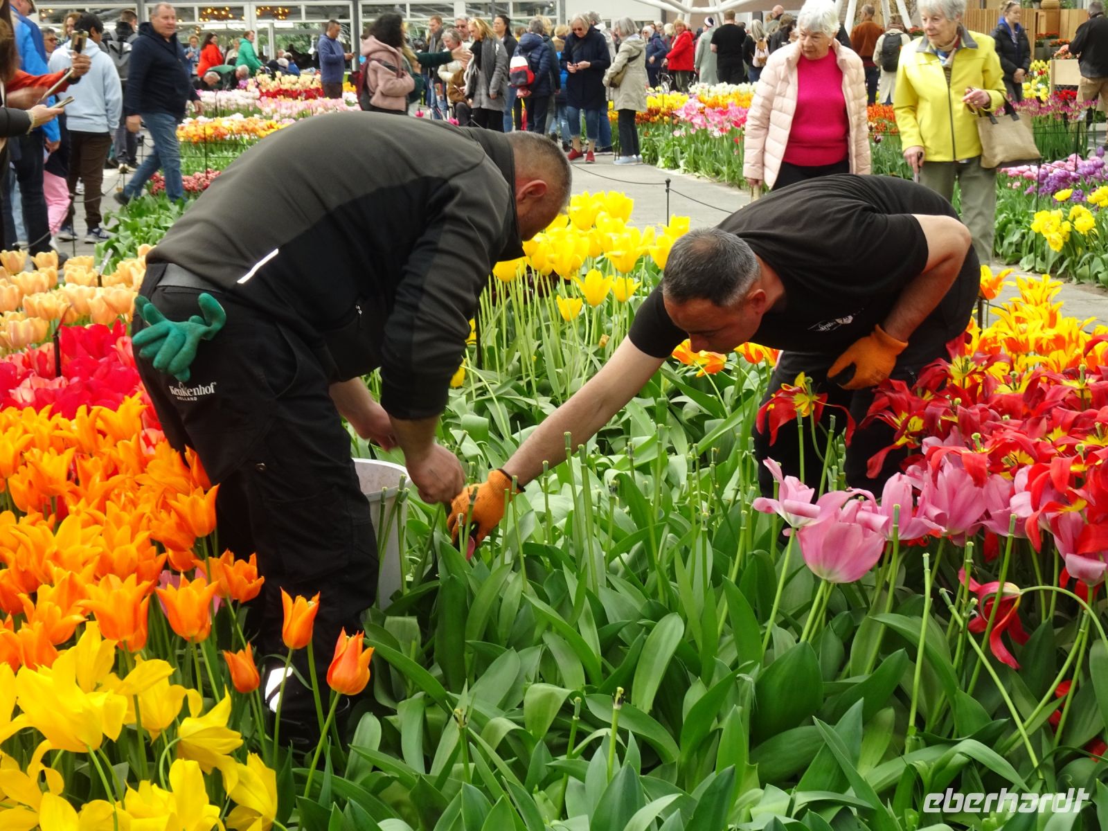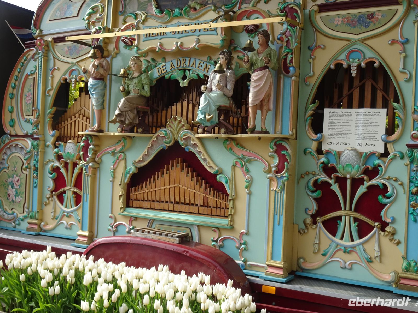 Nach einem guten Frühstück vom Buffet starteten wir um 8:30 Uhr zum Keukenhof bei Lisse. Rechtzeitige Ankunft ist empfehlenswert, da wir nicht die einzigen Besucher waren. Ausgestattet mit Übersichtsplänen und nach vorheriger Information über die Highlights auf dem Ausstellungsgelände durch unseren Reiseleiter Hartwig gestaltete jeder seinen Aufenthalt individuell. Drehorgel mit Dauermusik, typische Windmühle, Kahnfahrten, aber auch Blumenbindekunst, fachmännische gärtnerische Hinweise sowie Bilder zur über 75jährigen Geschichte des Keukenhofes gab es zu erleben. Besonders prächtig die in die Parklandschaft eingebetteten und hervorragend gepflegten Blumenbeete mit einer Farben- und Artenvielfalt aller Zwiebelgewächse, allem voran natürlich die Tulpen. Allerdings waren auf Grund kühler Witterung erst die frühen Tulpensorten aufgeblüht und vilefältige und prächtige Narzissen gaben interessante Farbtupfer, begleitet unter anderem von Magnolienblüten. Besonders empfehlenswert auch die Beet und Blumenkreationen in den Hallen. Wetterbeständig waren hier Riesen-Tulpen besondere Hingucker. Und nur hier: Amaryllen in einer erstaunlichen Vielfalt, wunderbar drappiert.