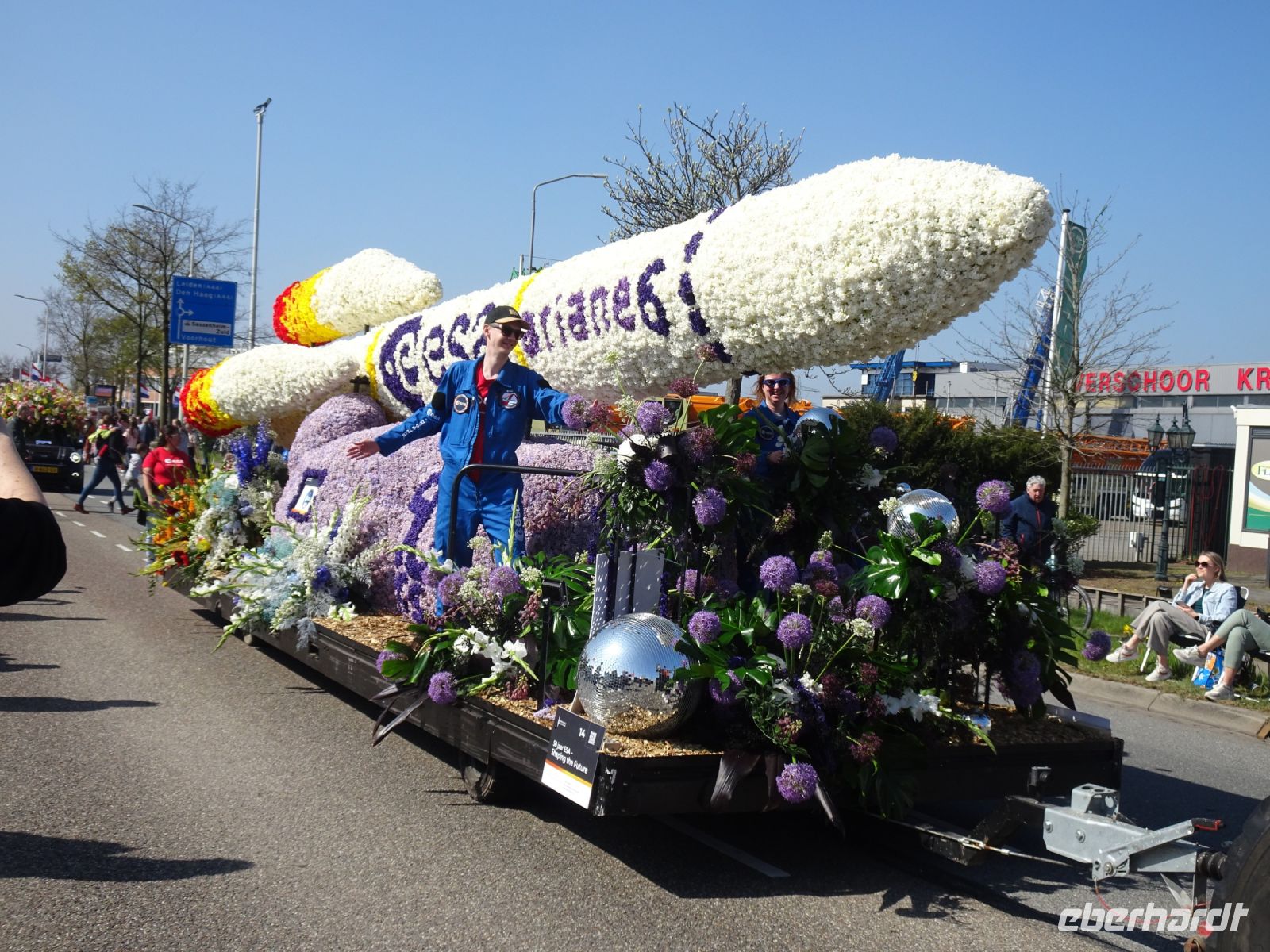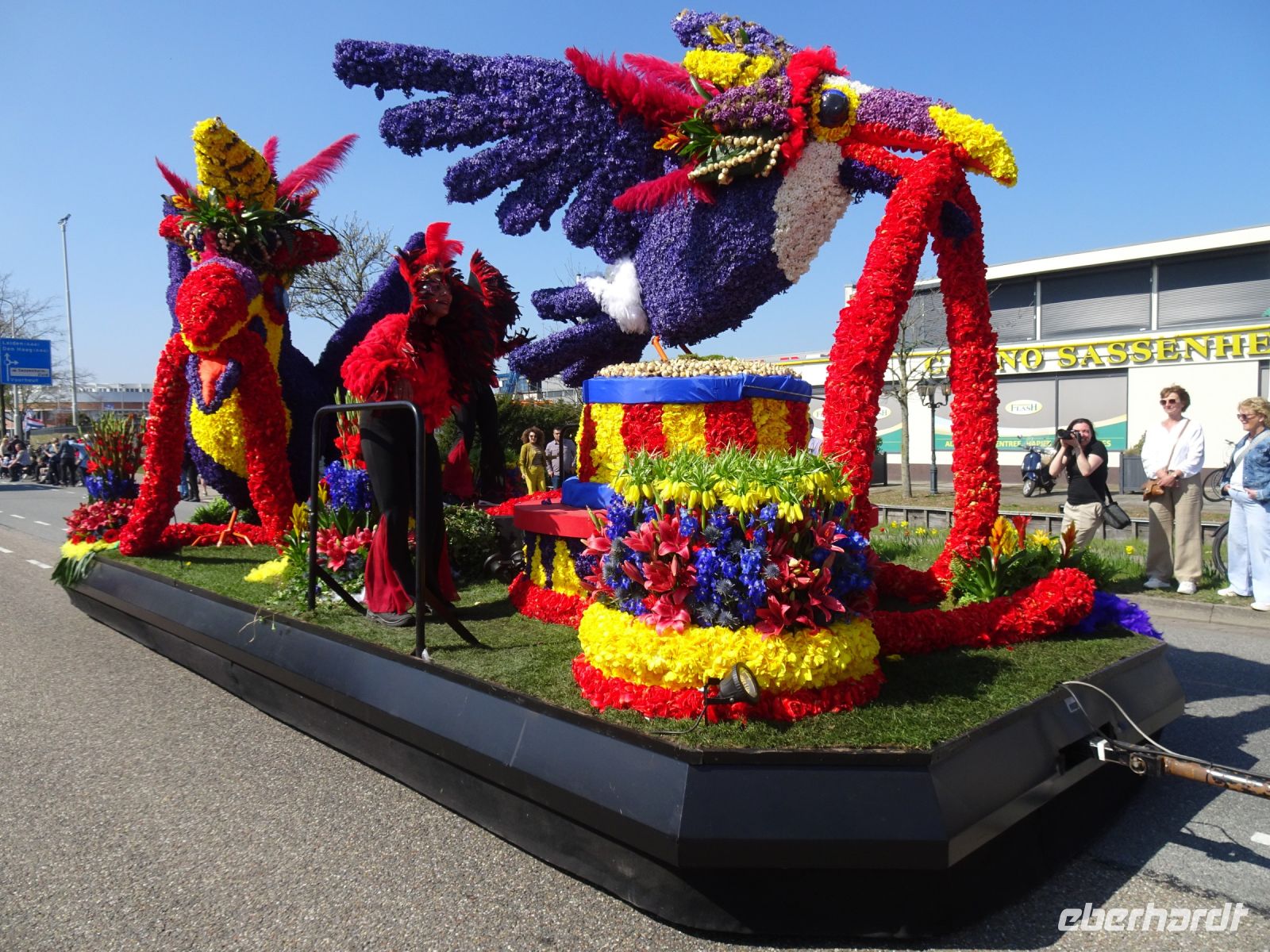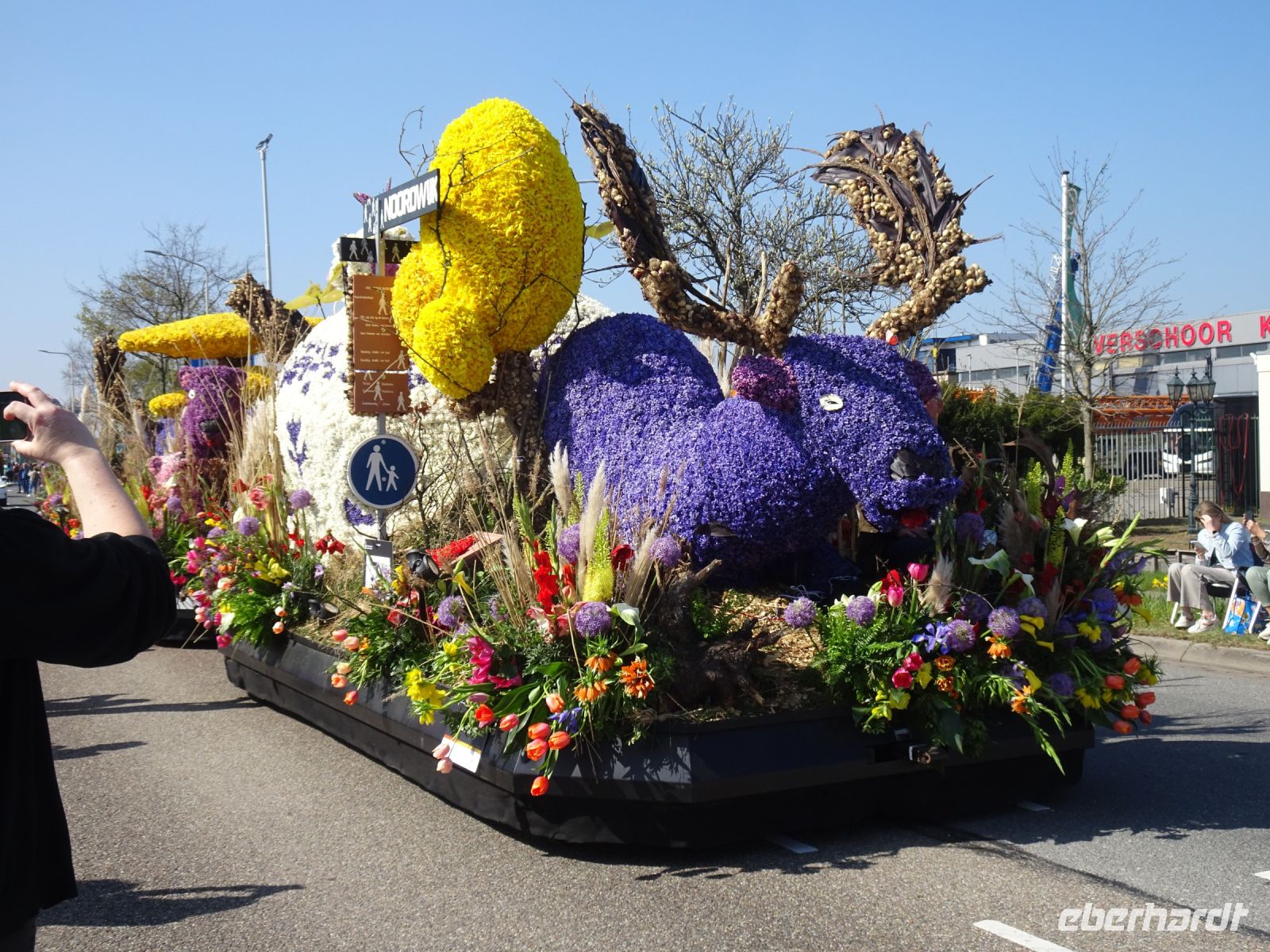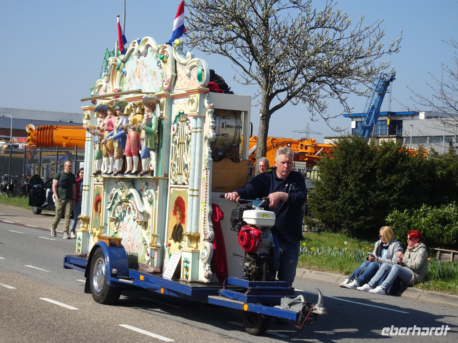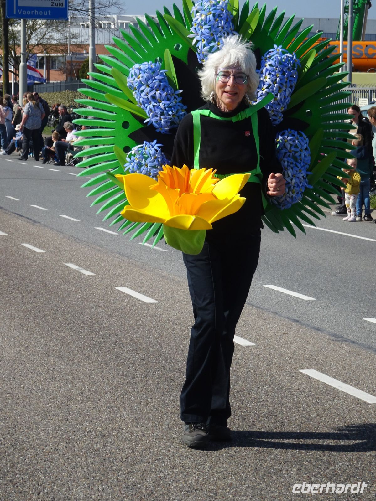 Nach einem guten Frühstück vom Buffet starteten wir gegen 8:30 Uhr in Richtung Sassenheim, dem Ort, wo der Blumenkorso gegen 12 Uhr vorbeikommen sollte. Zügig ging es nach Sassenheim, wo wir nahe der Korsostrecke unseren Bus abstellen konnten. Denn wir hatten großes Glück: auf einem Gewerbegrundstück unmittelbar gegenüber einer Tribüne hatten wir einen idealen Platz für die Beobachtung des Korsos gefunden. Mit vielen froh gelaunten Besuchern aus den Niederlanden und dem Ausland vertraten wir uns die Füße an der Korsostrecke. Gegen 12 Uhr erreichte der Korsozug - inoffiziell angeführt von einer Drehorgel auf einem Anhänger - die Tribüne. Geschmückte Fahrräder und Scooter begleiteten den Zug. Fröhliche Korsoteilnehmer mit Schiebeenten führten zu einem Extrabeifall von der Tribüne. Als Blüten gekleidete Damen sammelten mit Blütenkelchen Spenden ein. Und nach dem schon bekannten Motto "Mit Musik geht alles besser" begleitetem mehrere Kapellen den Zug. Selbstverständlich wurde von allen vor der Tribüne das nächste Lied intoniert. Anerkennung deshalb besonders, da auf dem etwa 40 km langen Weg von früh um 9 Uhr bis abends gegen 22 Uhr gute Kondition gefragt war.