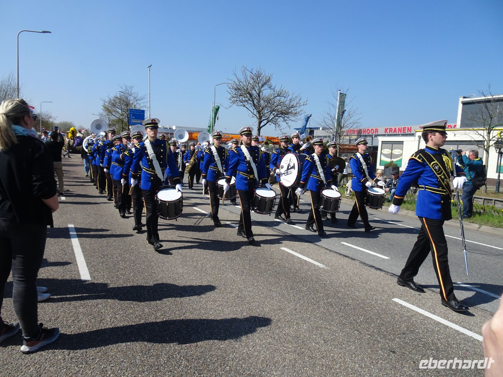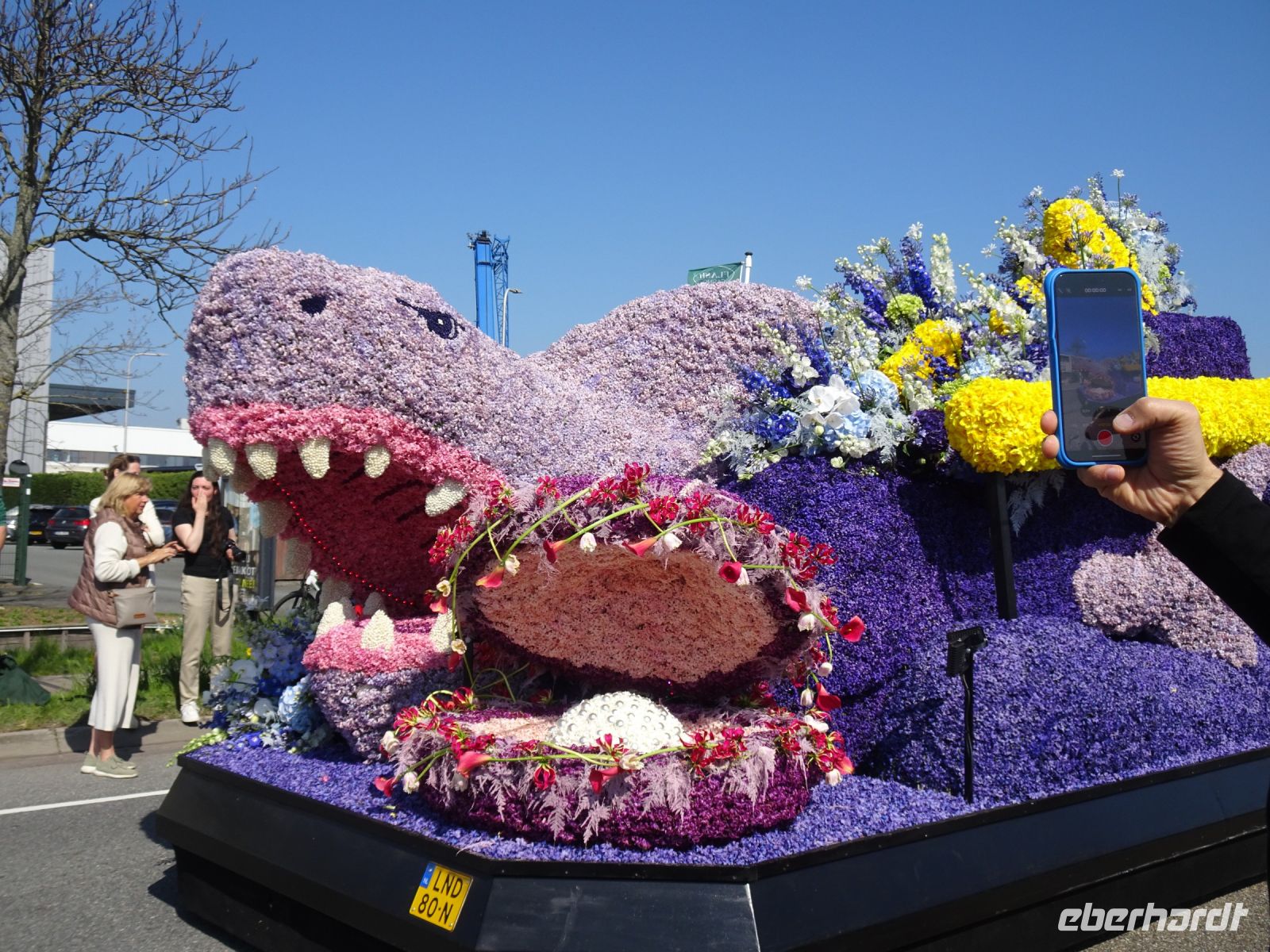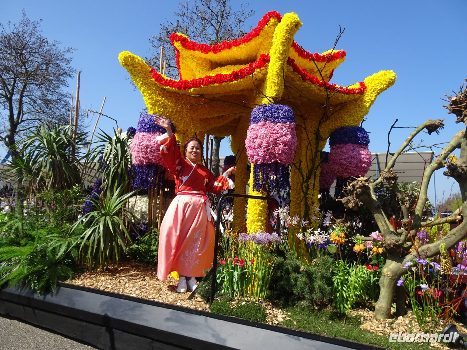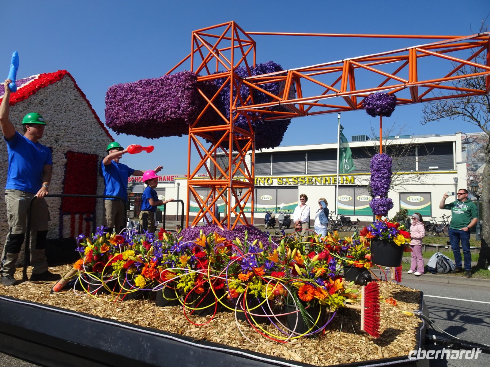 Nach einem guten Frühstück vom Buffet starteten wir gegen 8:30 Uhr in Richtung Sassenheim, dem Ort, wo der Blumenkorso gegen 12 Uhr vorbeikommen sollte. Zügig ging es nach Sassenheim, wo wir nahe der Korsostrecke unseren Bus abstellen konnten. Denn wir hatten großes Glück: auf einem Gewerbegrundstück unmittelbar gegenüber einer Tribüne hatten wir einen idealen Platz für die Beobachtung des Korsos gefunden. Mit vielen froh gelaunten Besuchern aus den Niederlanden und dem Ausland vertraten wir uns die Füße an der Korsostrecke. Gegen 12 Uhr erreichte der Korsozug - inoffiziell angeführt von einer Drehorgel auf einem Anhänger - die Tribüne. Geschmückte Fahrräder und Scooter begleiteten den Zug. Fröhliche Korsoteilnehmer mit Schiebeenten führten zu einem Extrabeifall von der Tribüne. Als Blüten gekleidete Damen sammelten mit Blütenkelchen Spenden ein. Und nach dem schon bekannten Motto "Mit Musik geht alles besser" begleitetem mehrere Kapellen den Zug. Selbstverständlich wurde von allen vor der Tribüne das nächste Lied intoniert. Anerkennung deshalb besonders, da auf dem etwa 40 km langen Weg von früh um 9 Uhr bis abends gegen 22 Uhr gute Kondition gefragt war.