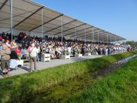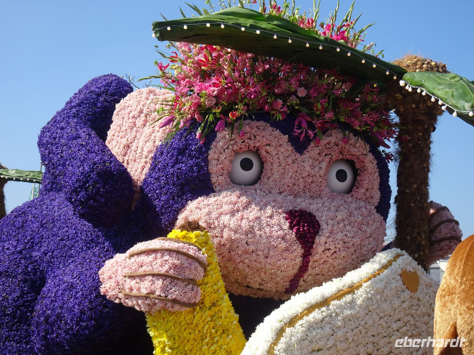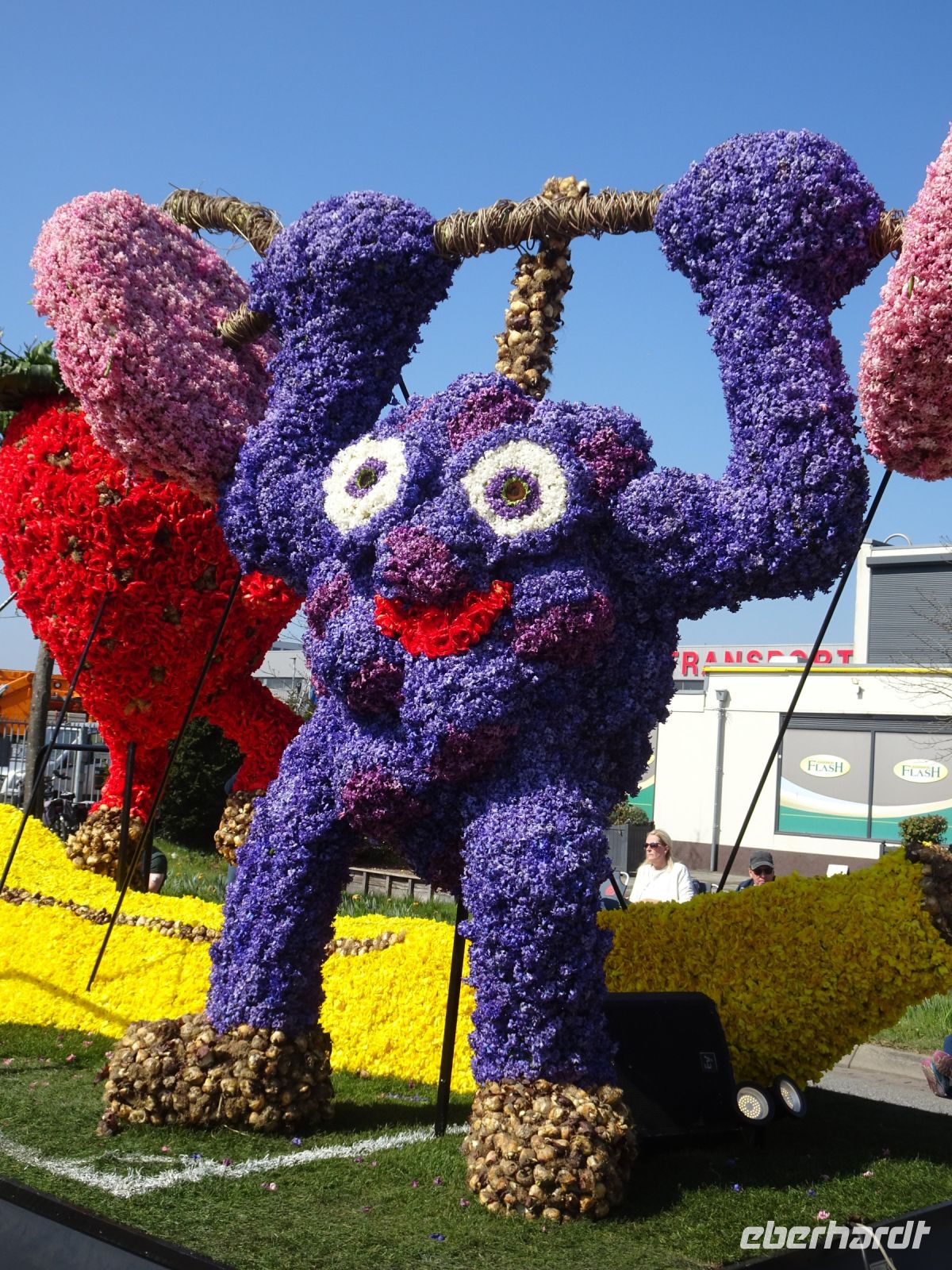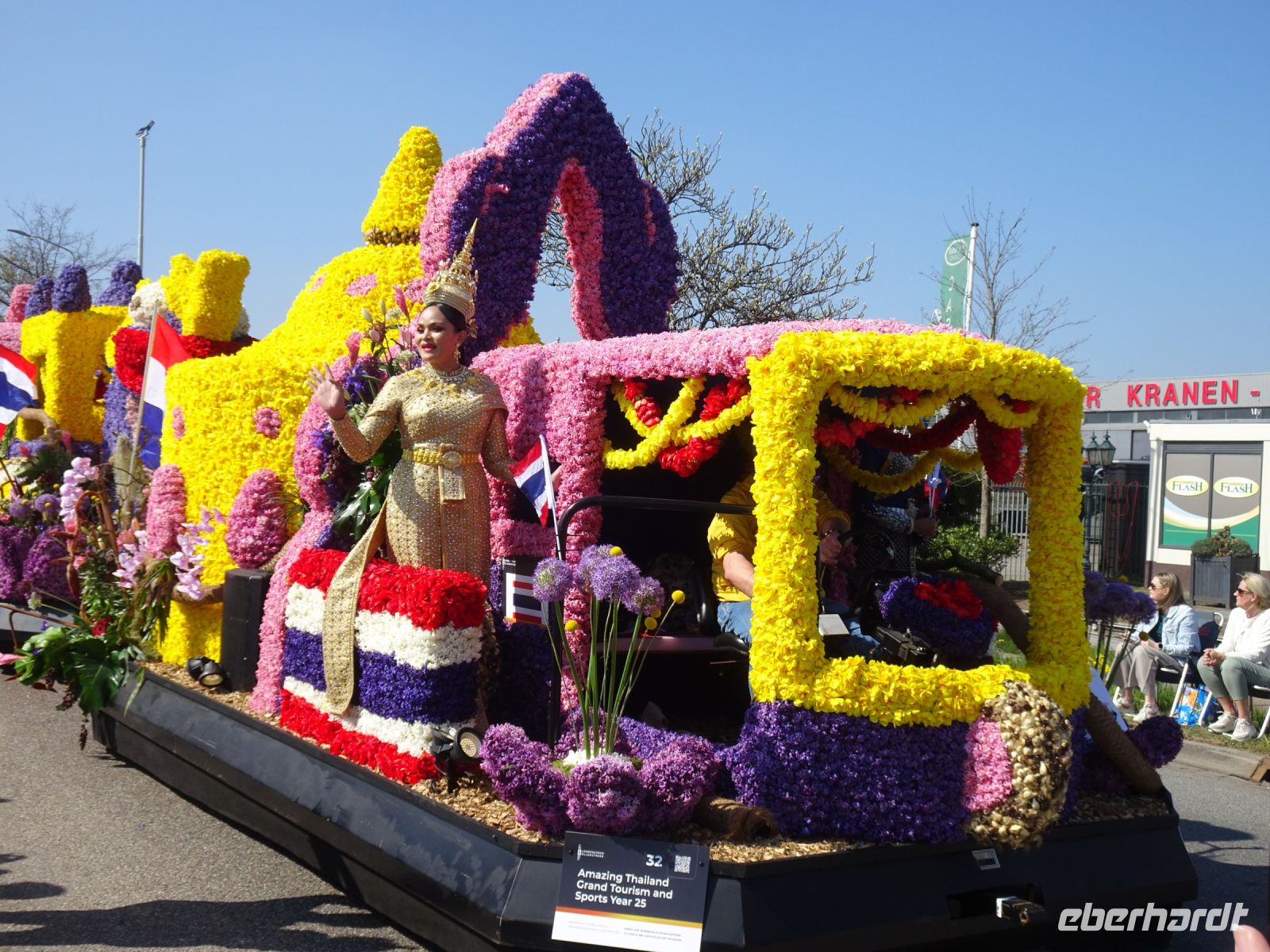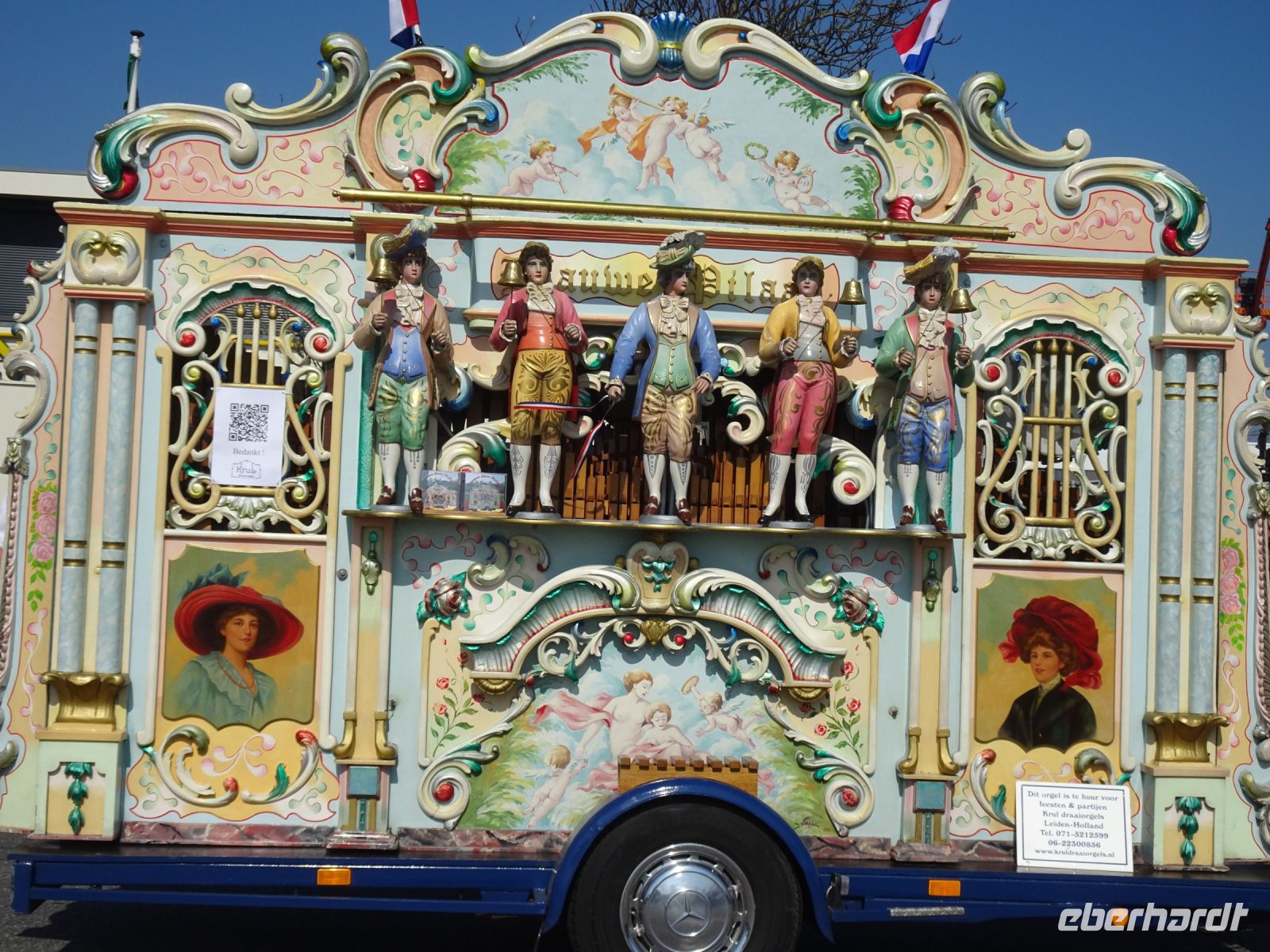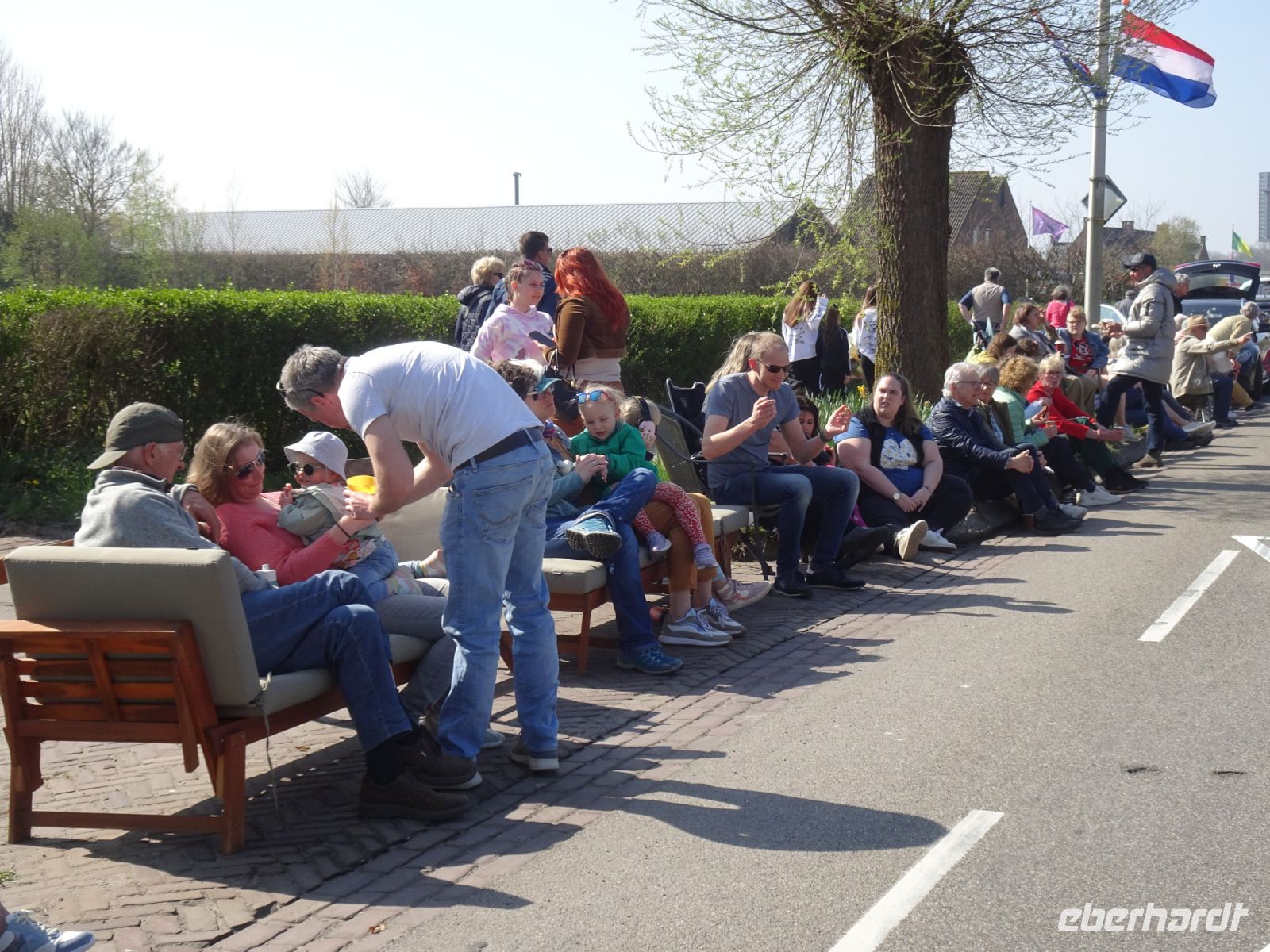 Nach einem guten Frühstück vom Buffet starteten wir gegen 8:30 Uhr in Richtung Sassenheim, dem Ort, wo der Blumenkorso gegen 12 Uhr vorbeikommen sollte. Zügig ging es nach Sassenheim, wo wir nahe der Korsostrecke unseren Bus abstellen konnten. Denn wir hatten großes Glück: auf einem Gewerbegrundstück unmittelbar gegenüber einer Tribüne hatten wir einen idealen Platz für die Beobachtung des Korsos gefunden. Mit vielen froh gelaunten Besuchern aus den Niederlanden und dem Ausland vertraten wir uns die Füße an der Korsostrecke. Gegen 12 Uhr erreichte der Korsozug - inoffiziell angeführt von einer Drehorgel auf einem Anhänger - die Tribüne. Geschmückte Fahrräder und Scooter begleiteten den Zug. Fröhliche Korsoteilnehmer mit Schiebeenten führten zu einem Extrabeifall von der Tribüne. Als Blüten gekleidete Damen sammelten mit Blütenkelchen Spenden ein. Und nach dem schon bekannten Motto "Mit Musik geht alles besser" begleitetem mehrere Kapellen den Zug. Selbstverständlich wurde von allen vor der Tribüne das nächste Lied intoniert. Anerkennung deshalb besonders, da auf dem etwa 40 km langen Weg von früh um 9 Uhr bis abends gegen 22 Uhr gute Kondition gefragt war.