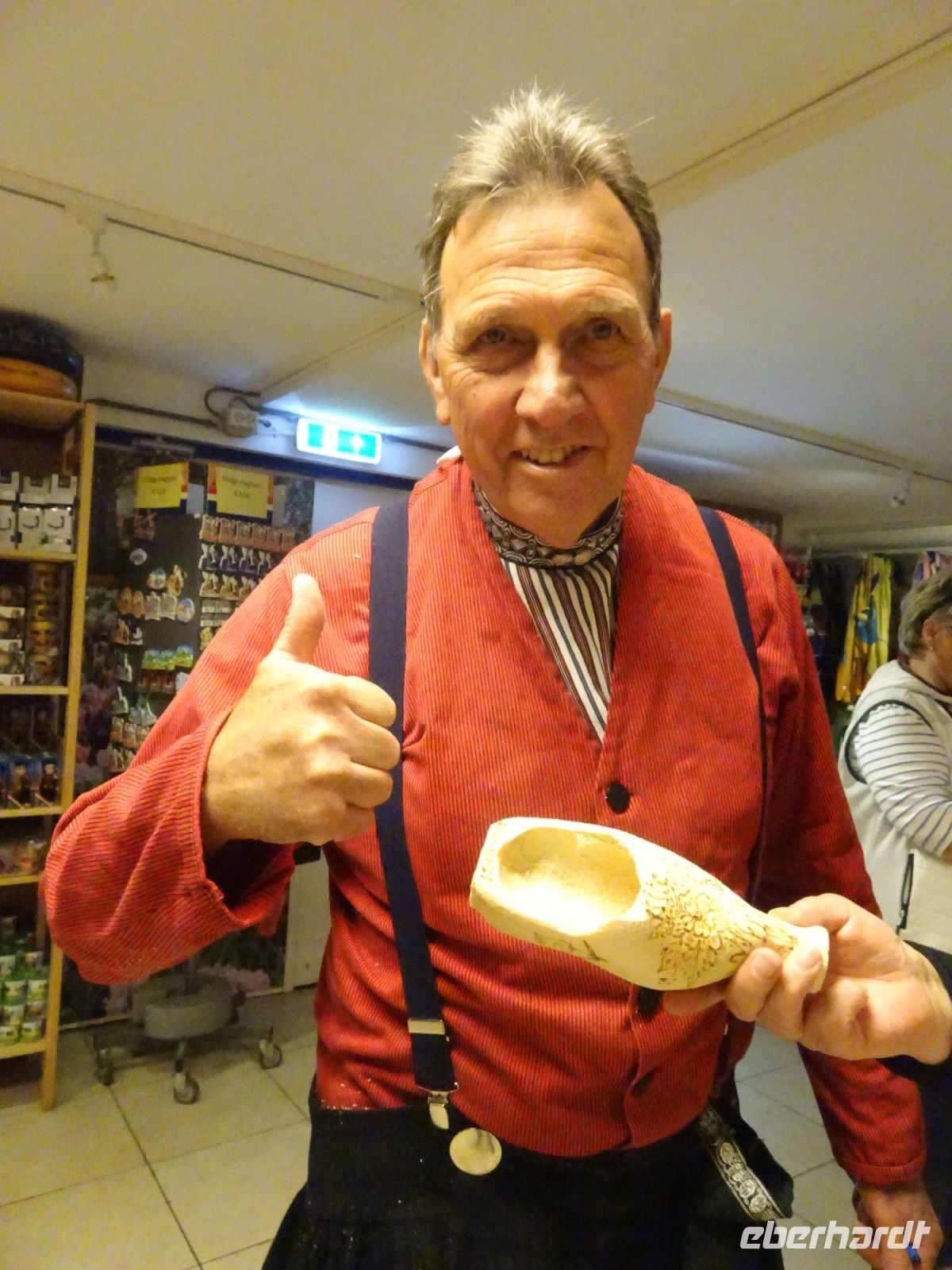 Durch unseren Busstandort in Sassenheim konnten wir nach dem Korso relativ problemlos zu unserem nächsten Reiseziel starten: den Simonehoeven bei Volendam. Wie die Catharina Hoeven in Zaanse Schans sind die Simonehoeve ein für Touristen ausgebauter typisch holländischer Hof mit Schwerpunkt Käseherstellung, Holzschuhproduktion und holländischer Folklore. Alles wird mit holländischem Humor vorgeführt und das Käse- und Souvenirangebot ist riesengroß. Nette Geste von unserem echt holländischen Begleiter: eine Dame unserer Reisegruppe erhielt den Rohling eines Holzschuhs aus tagaktueller Vorführung mit einer Gravierung nach ihrem Wunsch! Der anschließende Hofladen verzeichnete dann sehr gute Umsätze, da ja am Sonntag bereits der Heimreisetag anstand.