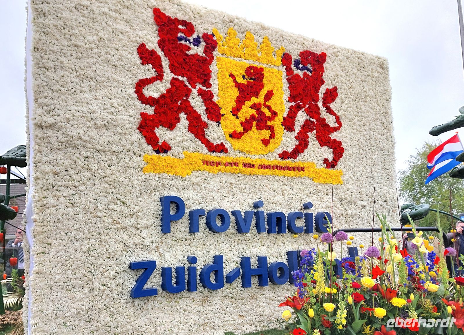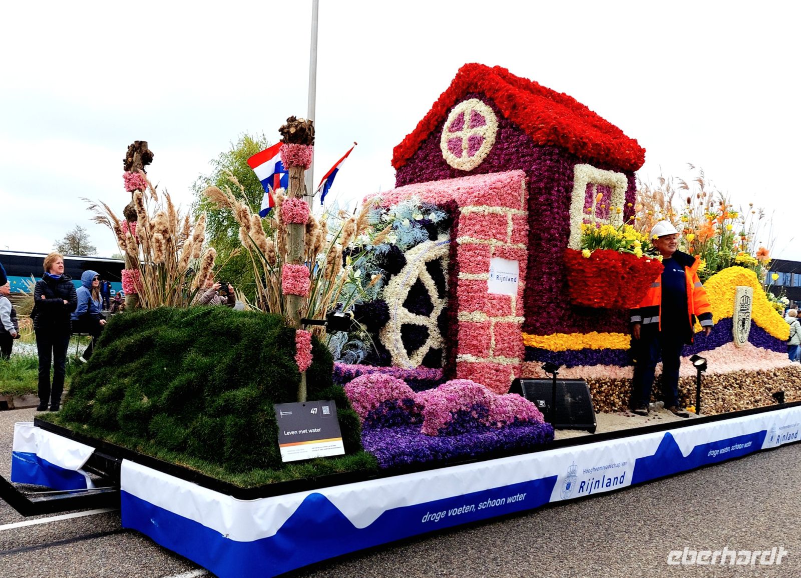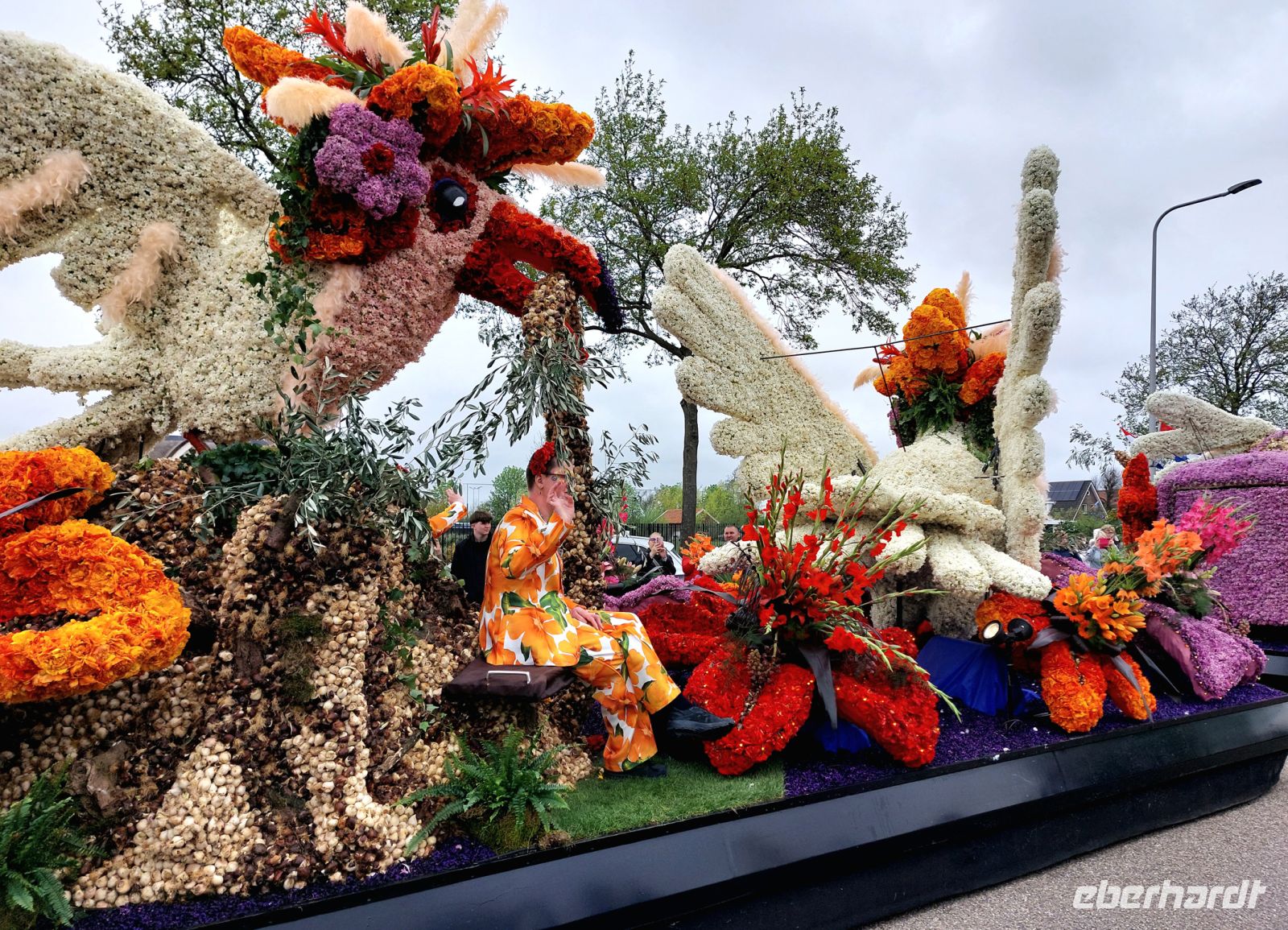 Viele Menschen säumten die Staße und saßen auf der gegenüberliegenden Tribühne in Erwartung der 20 großen Festwagen sowie 30 kleineren Fahrzeugen mit hunderttausenden Blumen bestückt. Eröffnet wurde der Zug mit Musik von einem Spielmannszug und dann kamen die ersten Wagen in Sicht. Viele Gäste erkannten die gestalteten Wagen vom Besuch in den Aufbauhallen wieder. Der Einsatz und die Leidenschaft der vielen Helfer ist ein zentraler Bestandteil dieser Corsowagen mit hunderttausenden Blüten bestückt. Es war ein überwältigender Eindruck diese vielen Farben und Formen - eine Welle der Begeisterung ging durch die Zuschauerreihen. Nach einer Stunde des Staunens nahmen wir am Bus kurz unseren Imbiss ein und starteten 13:30 Uhr zum Rembrandt Hoeve in Amstelveen südlich von Amsterdam.