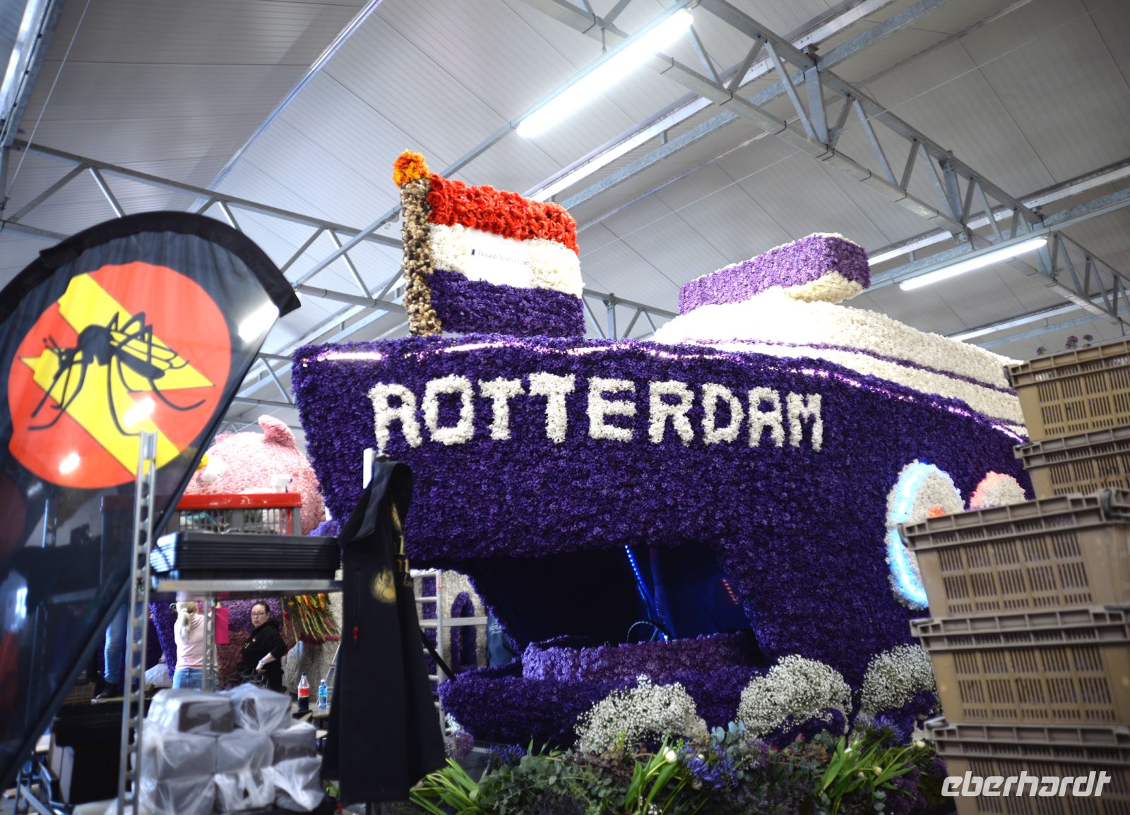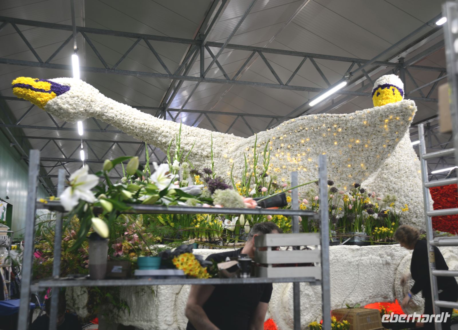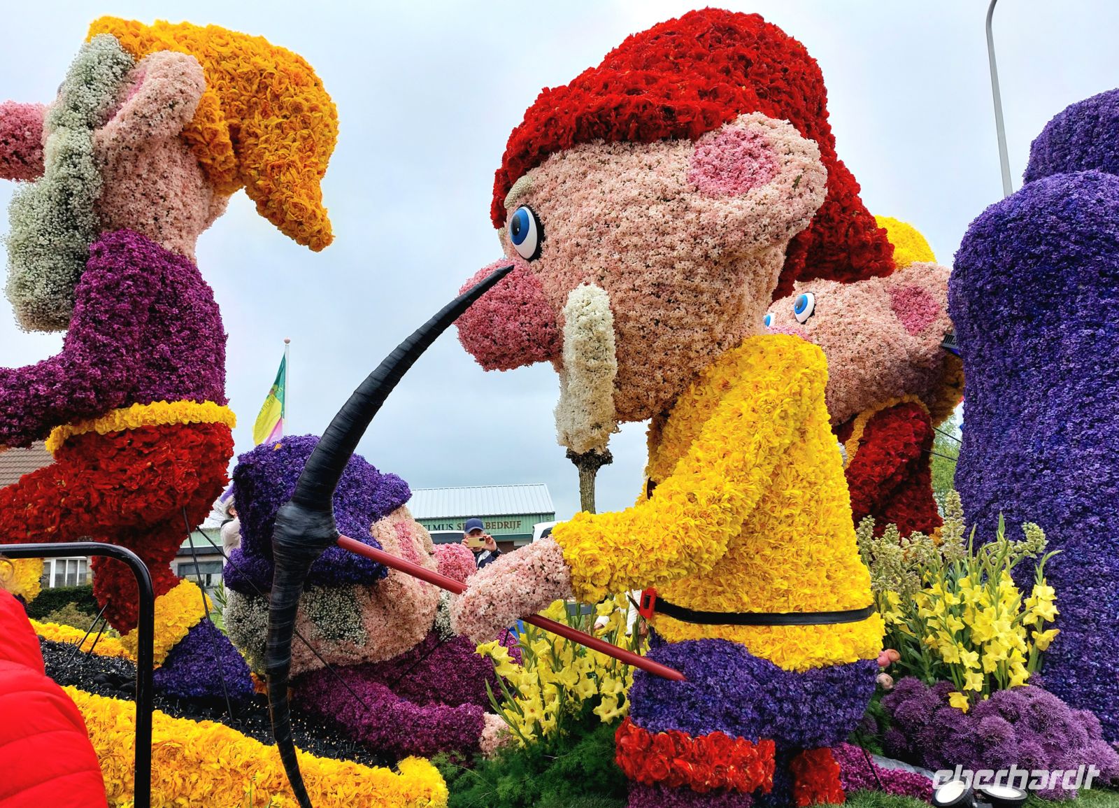 Viele Menschen säumten die Staße und saßen auf der gegenüberliegenden Tribühne in Erwartung der 20 großen Festwagen sowie 30 kleineren Fahrzeugen mit hunderttausenden Blumen bestückt. Eröffnet wurde der Zug mit Musik von einem Spielmannszug und dann kamen die ersten Wagen in Sicht. Viele Gäste erkannten die gestalteten Wagen vom Besuch in den Aufbauhallen wieder. Der Einsatz und die Leidenschaft der vielen Helfer ist ein zentraler Bestandteil dieser Corsowagen mit hunderttausenden Blüten bestückt. Es war ein überwältigender Eindruck diese vielen Farben und Formen - eine Welle der Begeisterung ging durch die Zuschauerreihen. Nach einer Stunde des Staunens nahmen wir am Bus kurz unseren Imbiss ein und starteten 13:30 Uhr zum Rembrandt Hoeve in Amstelveen südlich von Amsterdam.