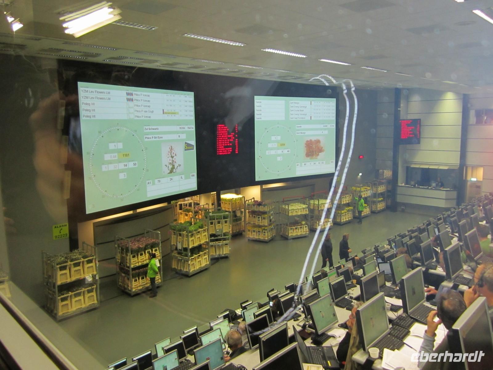Viele Touristen sind schon da und auch wir beginnen 8.15 Uhr mit unserem Rundgang. Die Versteigerung geht bis 8.45 Uhr und der Weg bis zu den Auktionsuhren dauert ca 10 min. Aber es hat sich gelohnt, das Blumenaktionshaus zu besuchen. Täglich werden knapp 20 Millionen Blumen versteigt. Dabei kommen die Blumen auch aus Israel, Kenia oder auch aus Bangkok. Der Hauptabnehmer ist Deutschland. Wir werden nun die Blumen mit ganz anderen Augen kaufen.