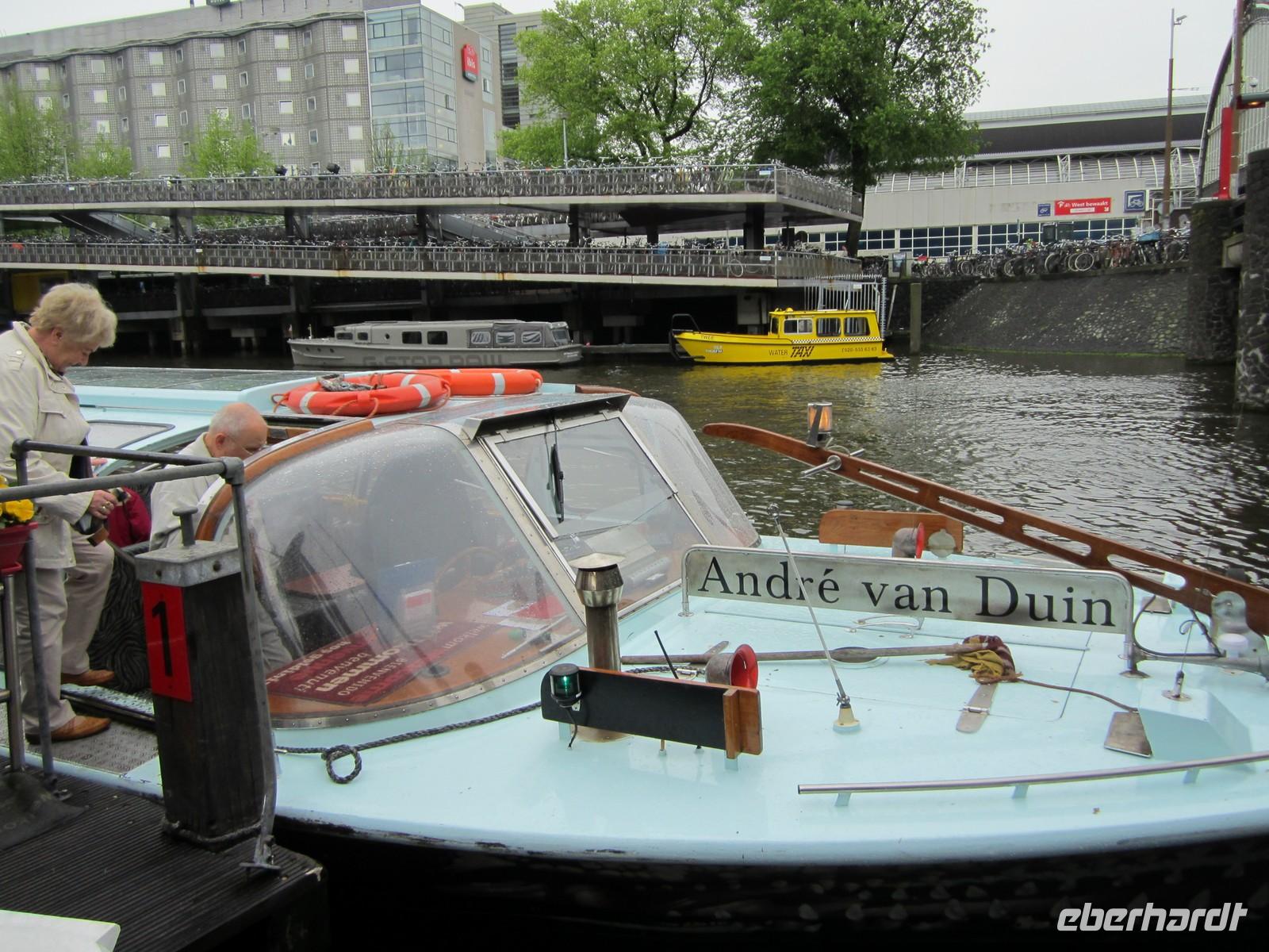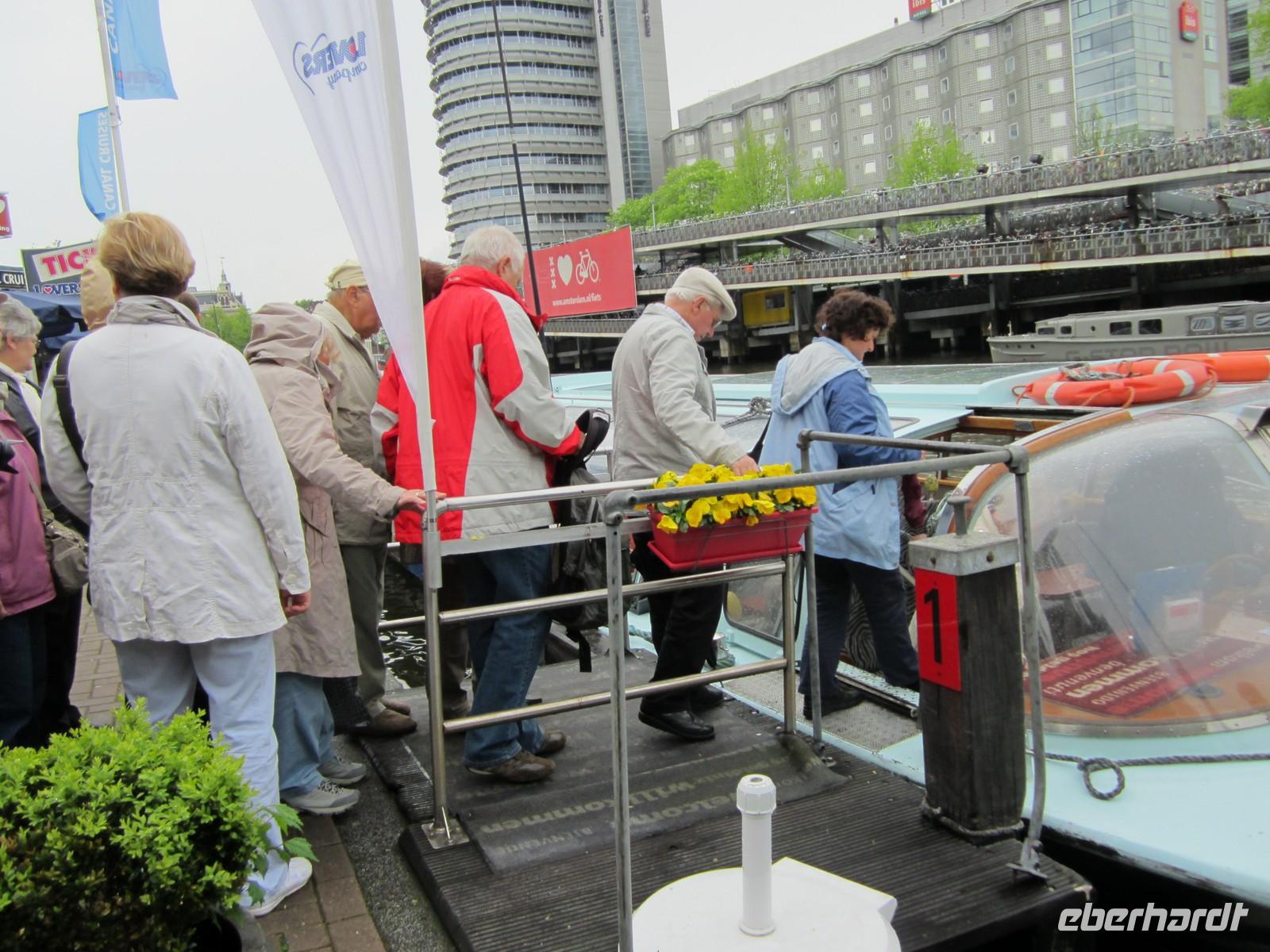 Gegen 11. Uhr sind wir in Amsterdam an der Anlegestelle der Reederei Lovers. Hier beginnen wir unsere Grachtenrundfahrt. Unsere Fahrt führt uns entlang der der Prinzengracht mir der Westerkerk, in der 1966 die Hochzeit von Königin Beatrix mit Claus von Amsberg stattfand.
