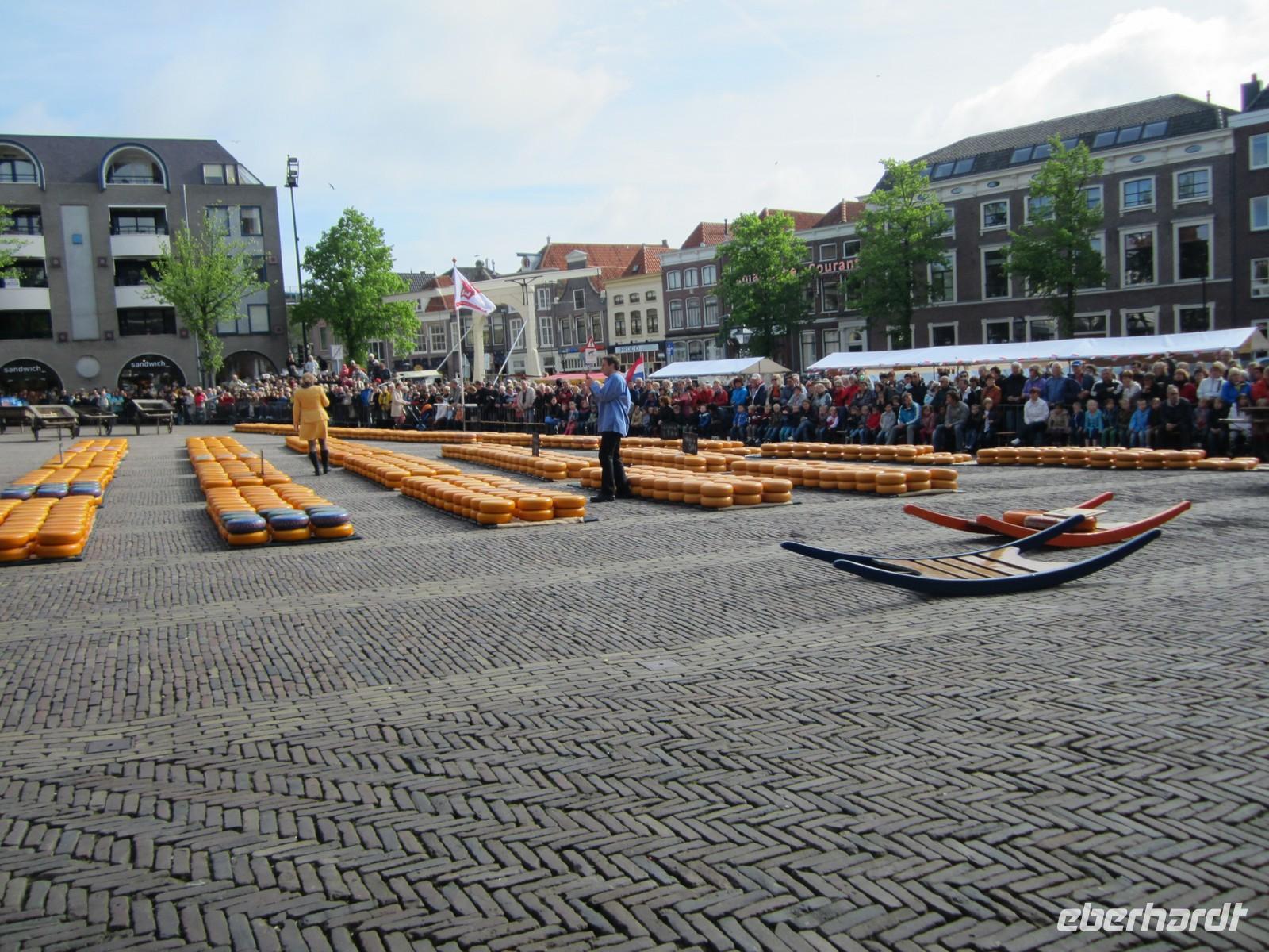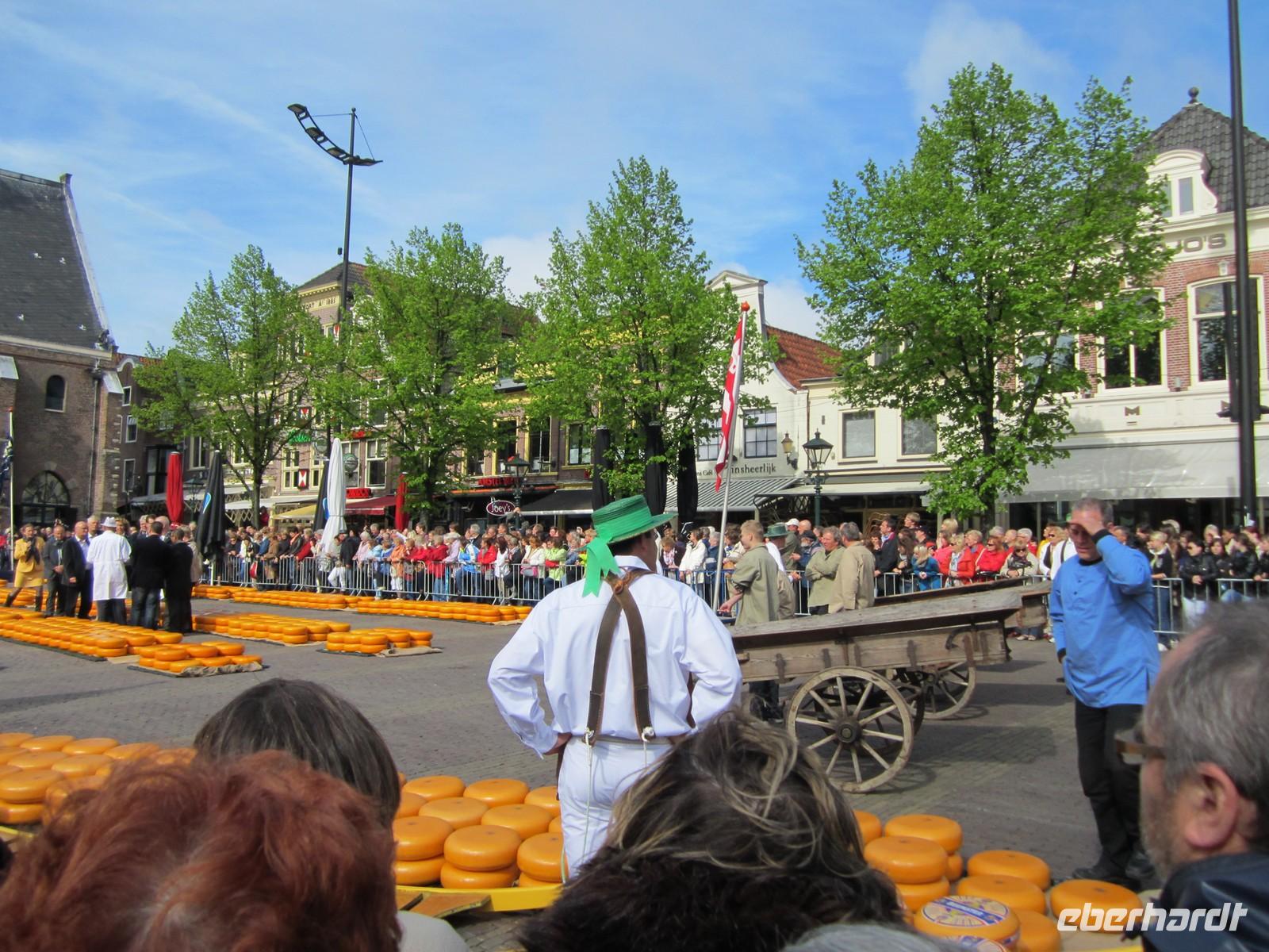 Unsere Rundfahrt um das Ijselmeer fällt auf Freitag. Da können wir nicht einfach an Alkmaar vorbei fahren. Der weltberühmte Käsemarkt findet immer freitags statt. Deshalb fahren wir natürlich den Käsemarkt an. Wir sind zeitig unterwegs und haben die Stadt fast für uns allein. Es ist schön, die Ruhe genießen zu können. Der Käse liegt bereits auf dem Marktplatz und die Käsestände sind aufgebaut. Gegen 10.00 Uhr beginnt dann das Markttreiben.