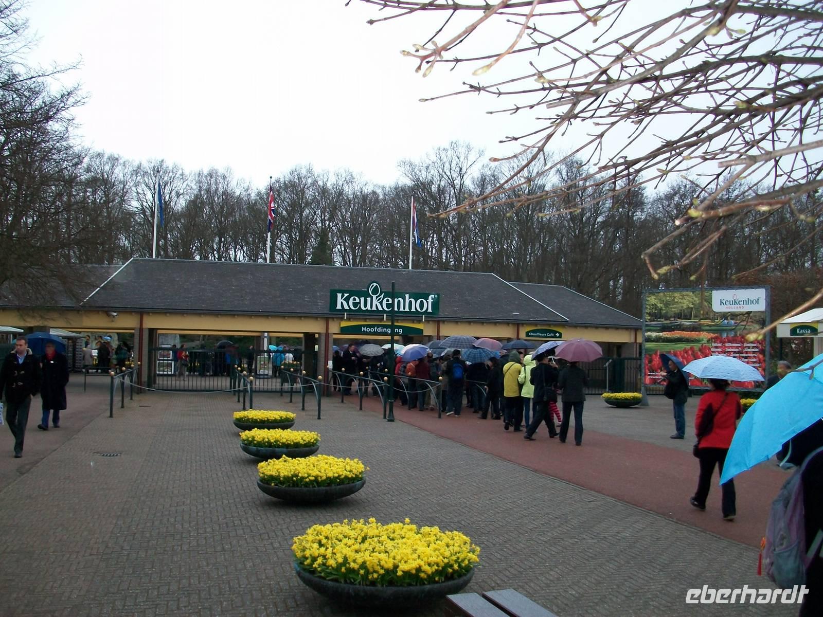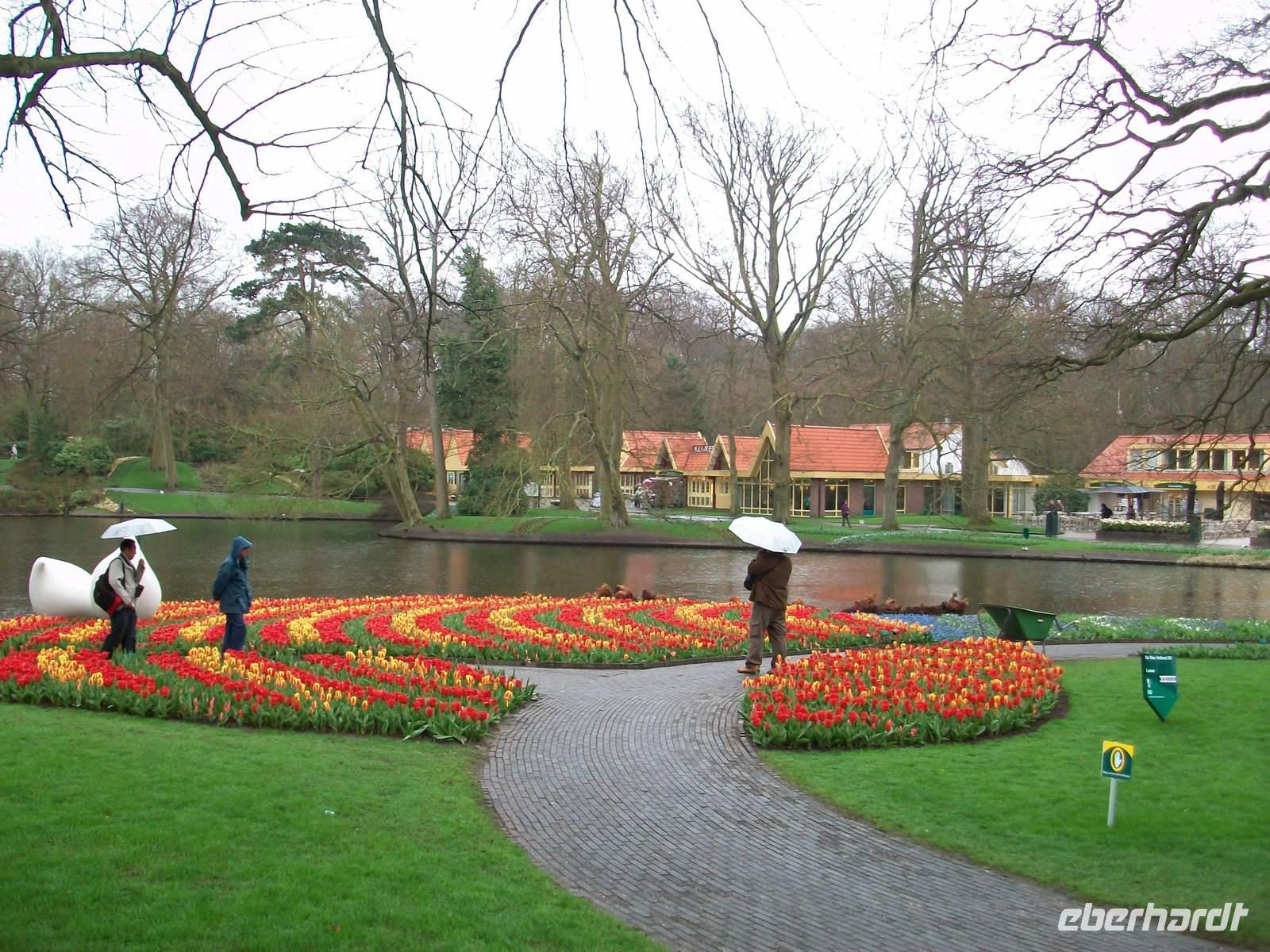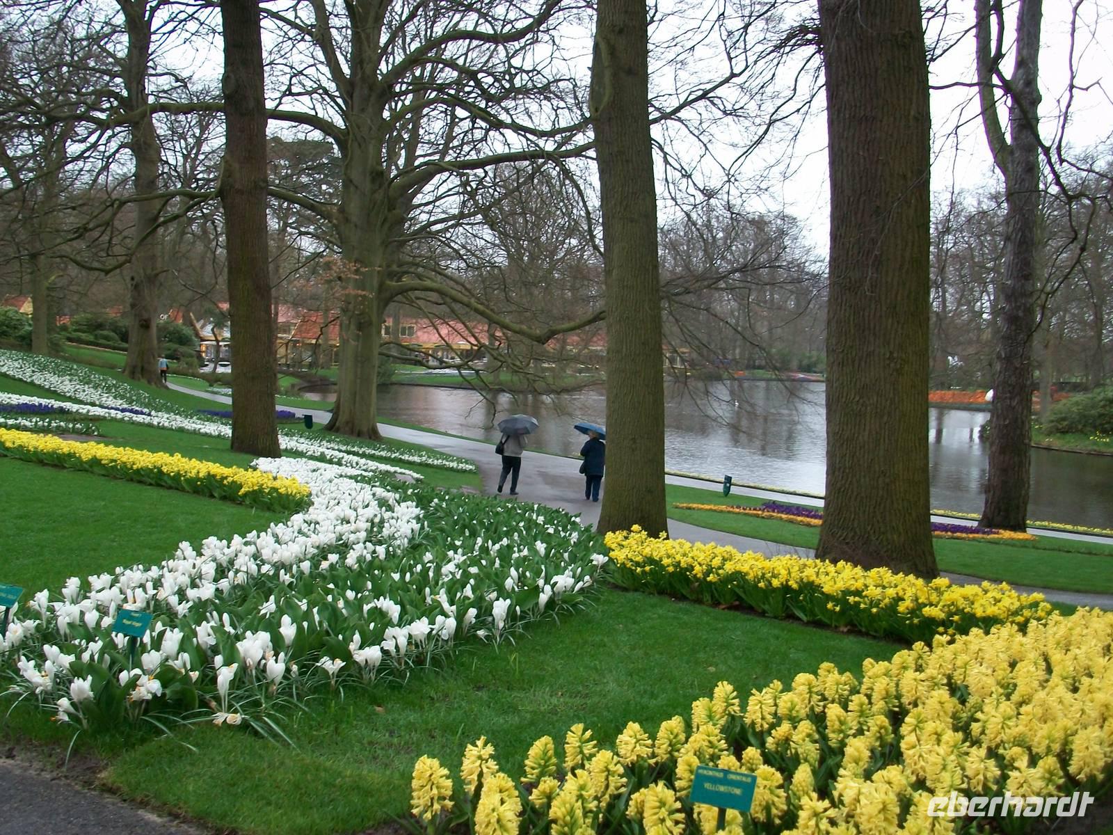 15.4.2013. Auch diese Nacht war wieder kühl, nachdem wir vom Hotel gestartet sind glitzern die Wiesen auf dem flachen Land, Tautröpfchen haben sich hier festgesetzt. Nach einer guten Stunde Fahrzeit langen wir beim Ort Lisse am Keukenhof an. Leider hat sich der Himmel bezogen und dicke Wolken bringen leichten Regen. Das stört aber unseren Tatendrang nicht, bald sind die Tickets verteilt und es beginnt das individuelle Entdecken in diesem faszinierenden Park. Auch wenn es noch keine so große Blütenpracht gibt wie sonst zu dieser Jahreszeit, ist der Genuss sehr groß. Viele Blumen wurden in Glashäusern vorbereitet und die verschiedenen Pavillons bieten eine große Auswahl floristischen Könnens, so dass der Aufenthalt trotz des lausigen Wetters doch noch zum Genuss wird.