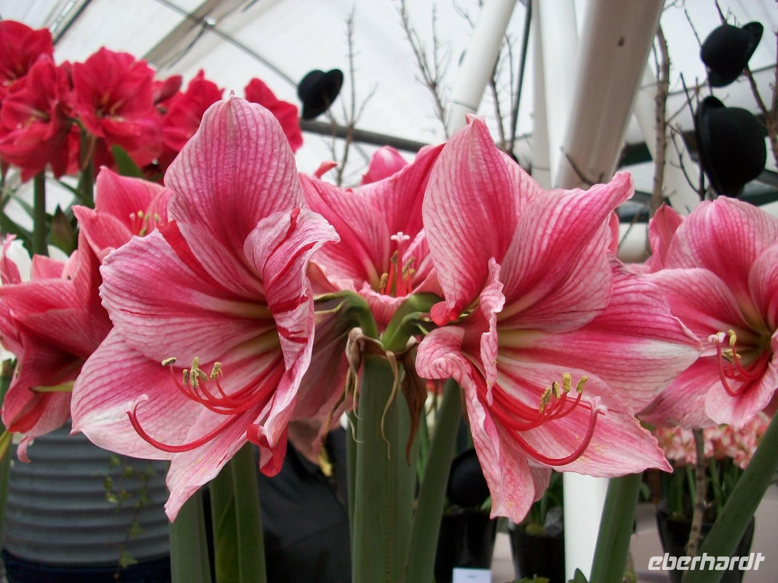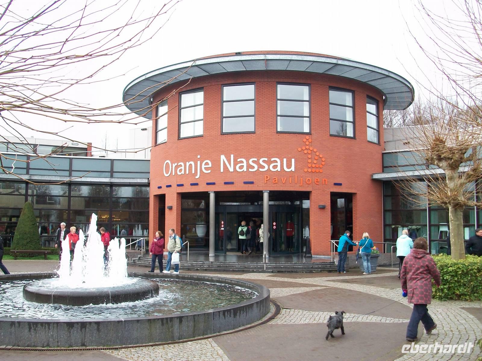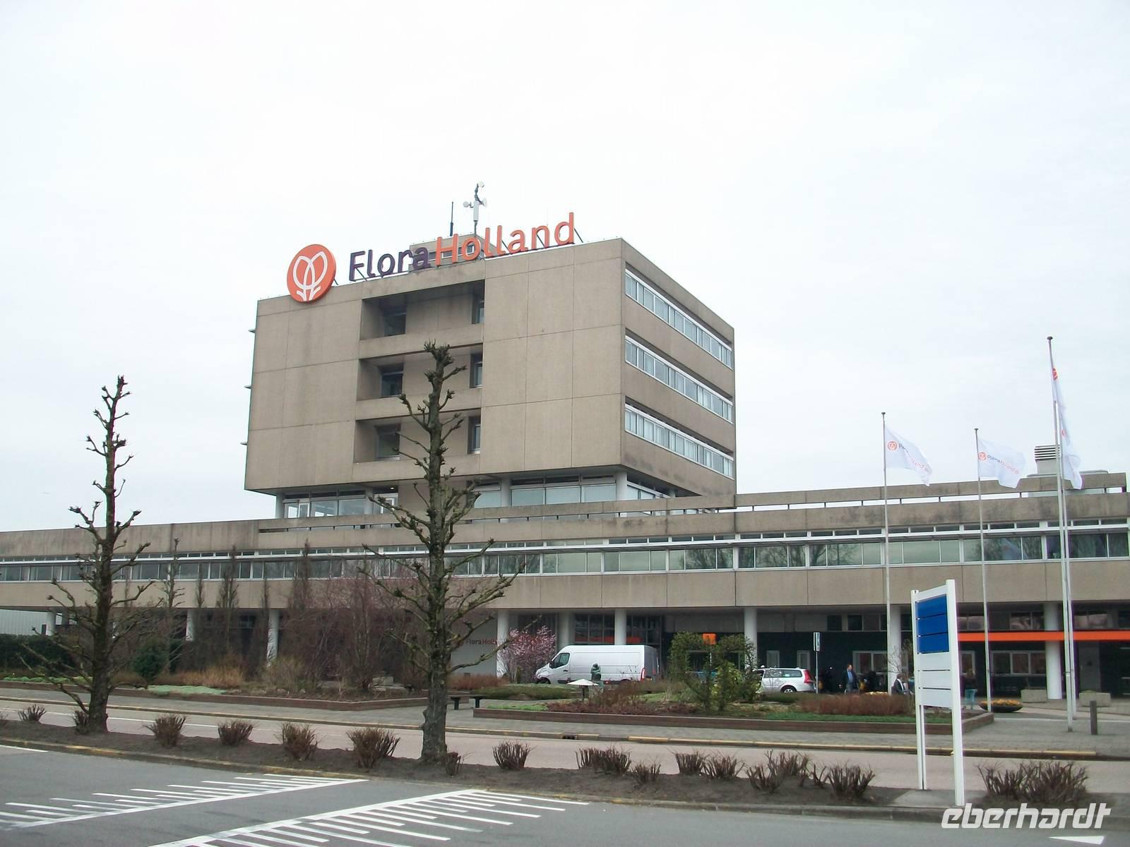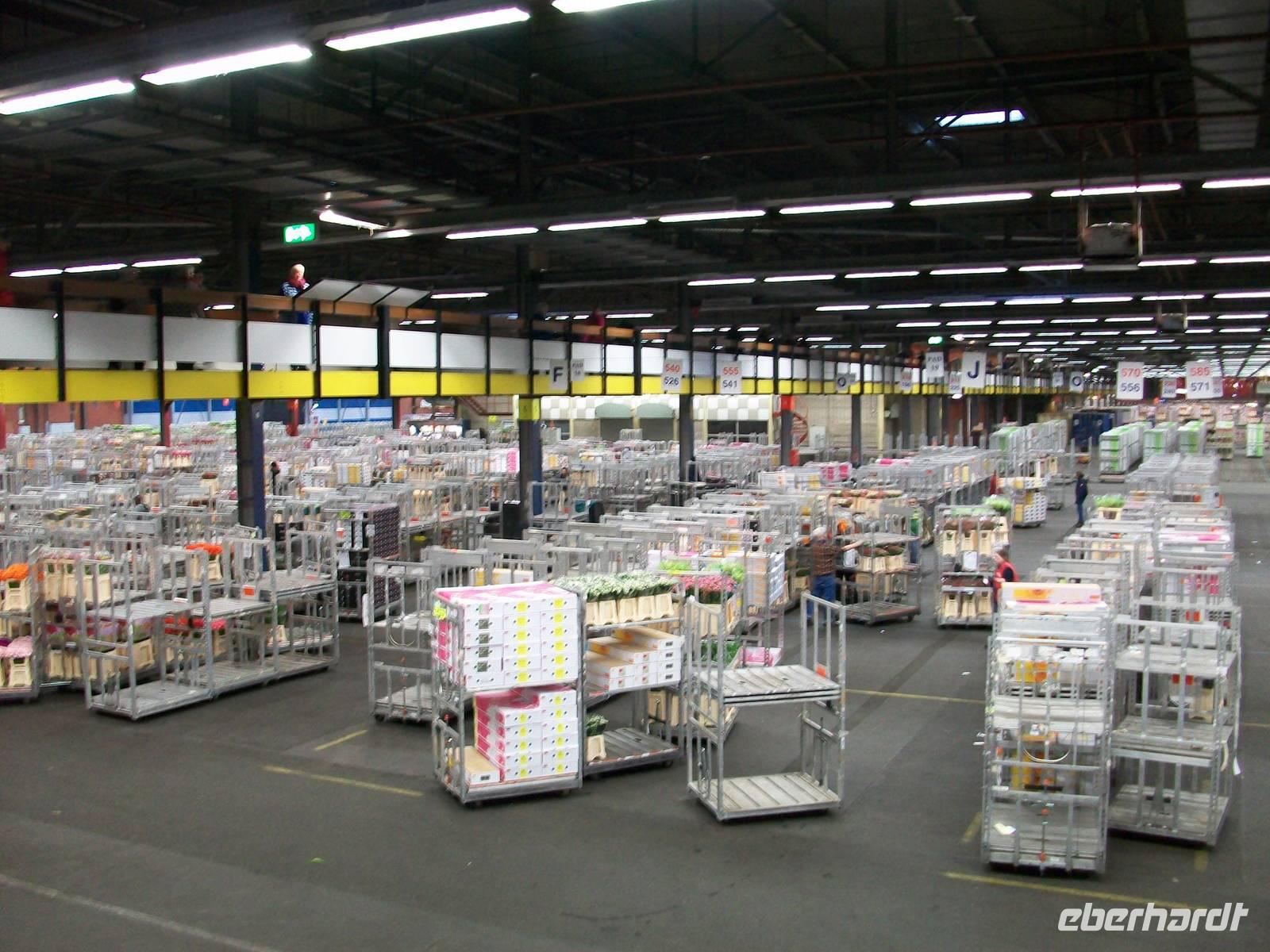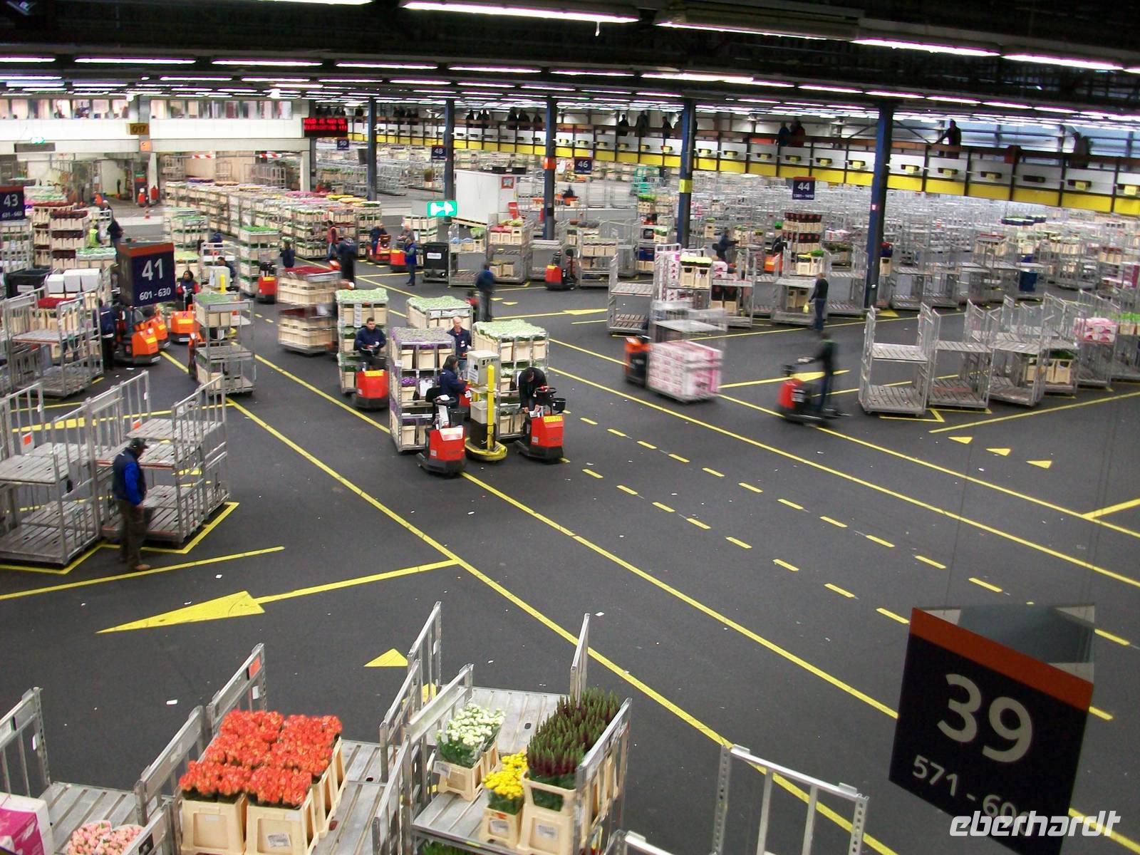 16.4.2013. Heute mussten wir zeitig aufstehen. Dafür erwartet uns aber auch ein ganz besonderes Ereignis: der Besuch der größten Blumenversteigerung der Welt. Wir fahren am Großraum Amsterdam vorbei, und sehen am Flughafen Schiphol die startenden und landenden Flugzeuge aus aller Welt. Dann schwenken wir links ab und befinden uns auf dem Weg zum Ort Aalsmeer. Hier wurden schon immer Blumen verkauft; erst nach dem Zweiten Weltkrieg aber schlossen sich die Gärtner zu einer Genossenschaft zusammen und versteigerten dann zentral ihre Erzeugnisse. Wir langen pünktlich gegen acht an und können nun die weltgrößte Halle dieser Art besuchen. Die Betreiber haben oberhalb der Halle breite Laufstege angelegt von denen wir dem emsigen Treiben zusehen können. Von hier scheint alles chaotisch, die Paletten werden, vollgepackt mit Blumen, schnell zu ihrem Bestimmungsort gefahren, sei es in die Auktionshalle oder zum Abtransport zu den rund