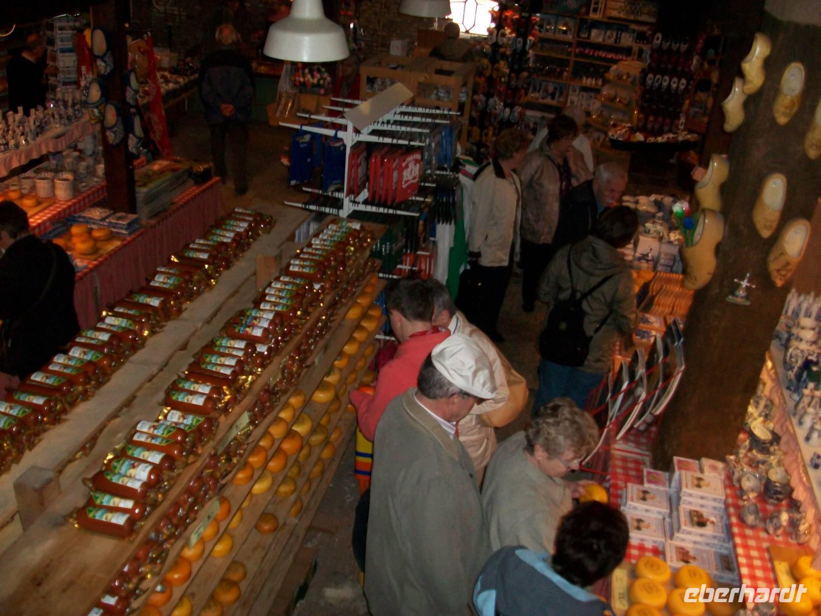 Später gehen wir nur um die Ecke und schauen dem Bauern beim Holzschuhmachen über die Schulter. Eine Maschine ist ihm dabei behilflich um aus einem Stück Pappelholz einen Klomben, so heißen hier die Holschuhe, zu fertigen. Lustig fliegen uns dabei die Holzspäne um die Ohren. Dann besteht im großen Verkaufsraum noch die Möglichkeit von den vielen Spezialitäten ein Souvenir mit nach Hause zu nehmen. Noch ein letzter Blick in den Stall mit den sauberen schwarz- weißen Friesenkühen, und wir sind schon wieder unterwegs einem neuen Höhepunkt entgegen zu fahren.