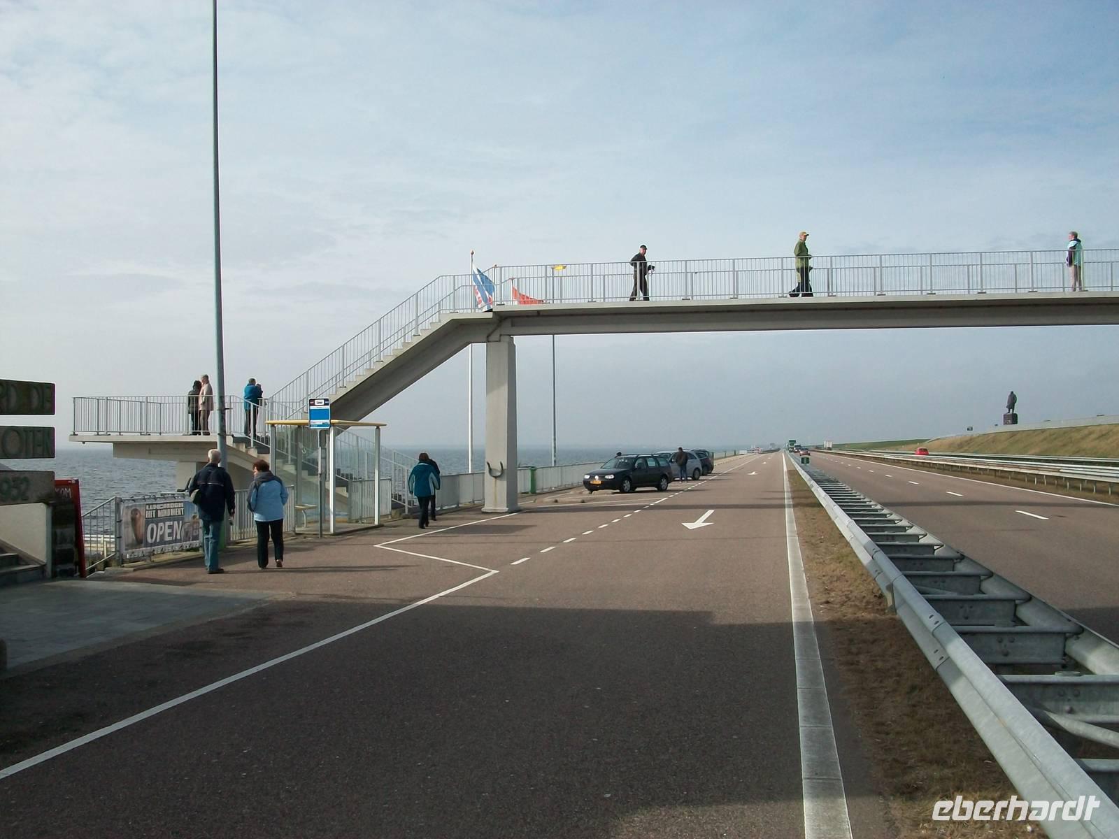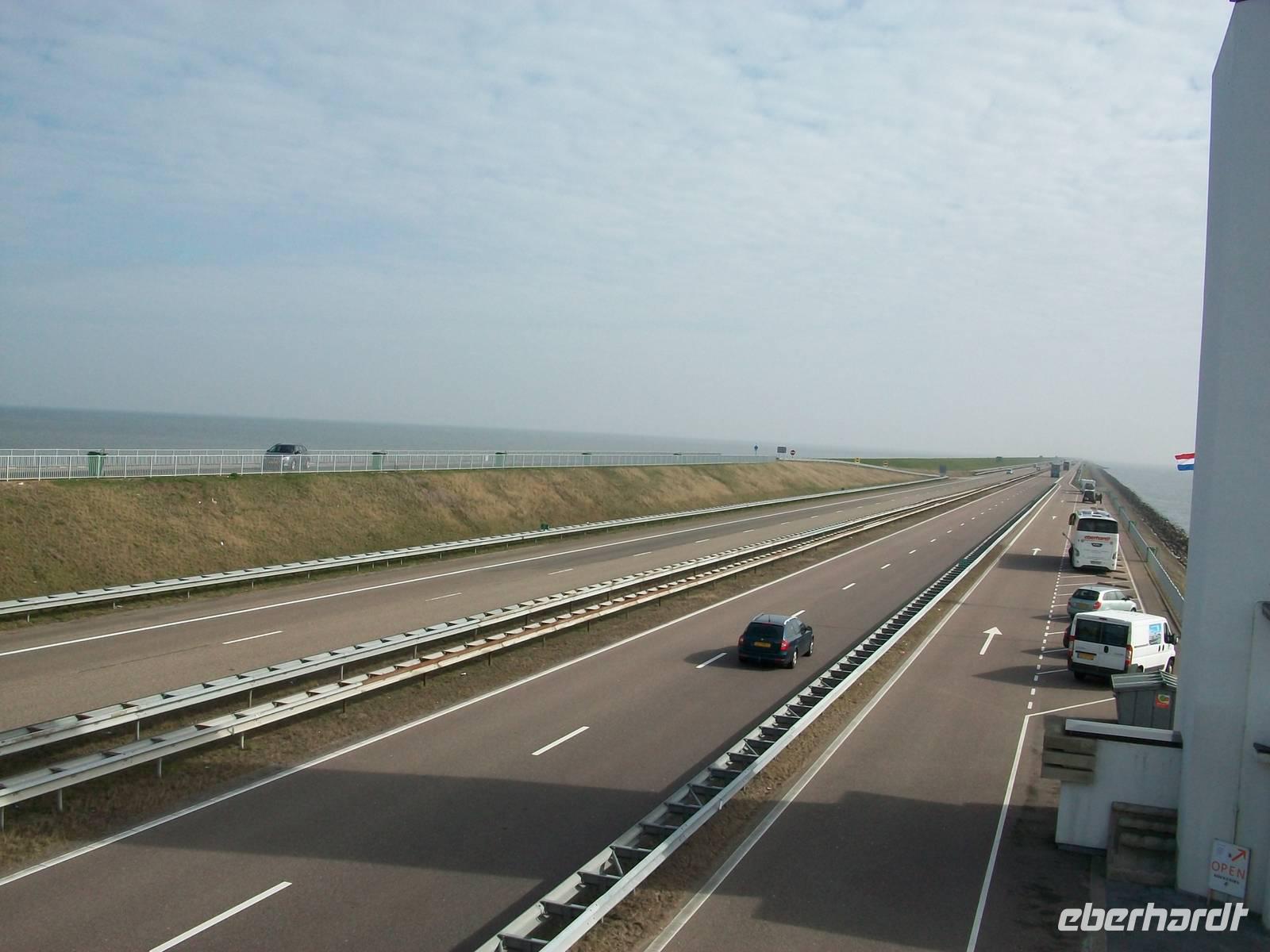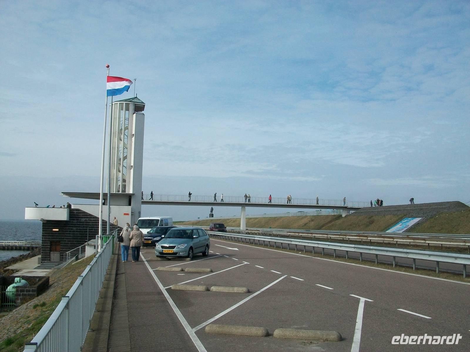 Dann sind wir auf am gigantischen Abschlussteich angelangt. Er wurde in dem Dreißiger Jahren des 20. Jahrhunderts angelegt und mit seinen gut 30 Kilometern trennt er die Küste komplett ab, ein gigantischer Binnensee, das IJselmeer entstand. Auf der Dammkrone können wir einen Blick auf dieses Bauwerk werfen, links das schäumende offene Meer und rechts das große Binnengewässer.