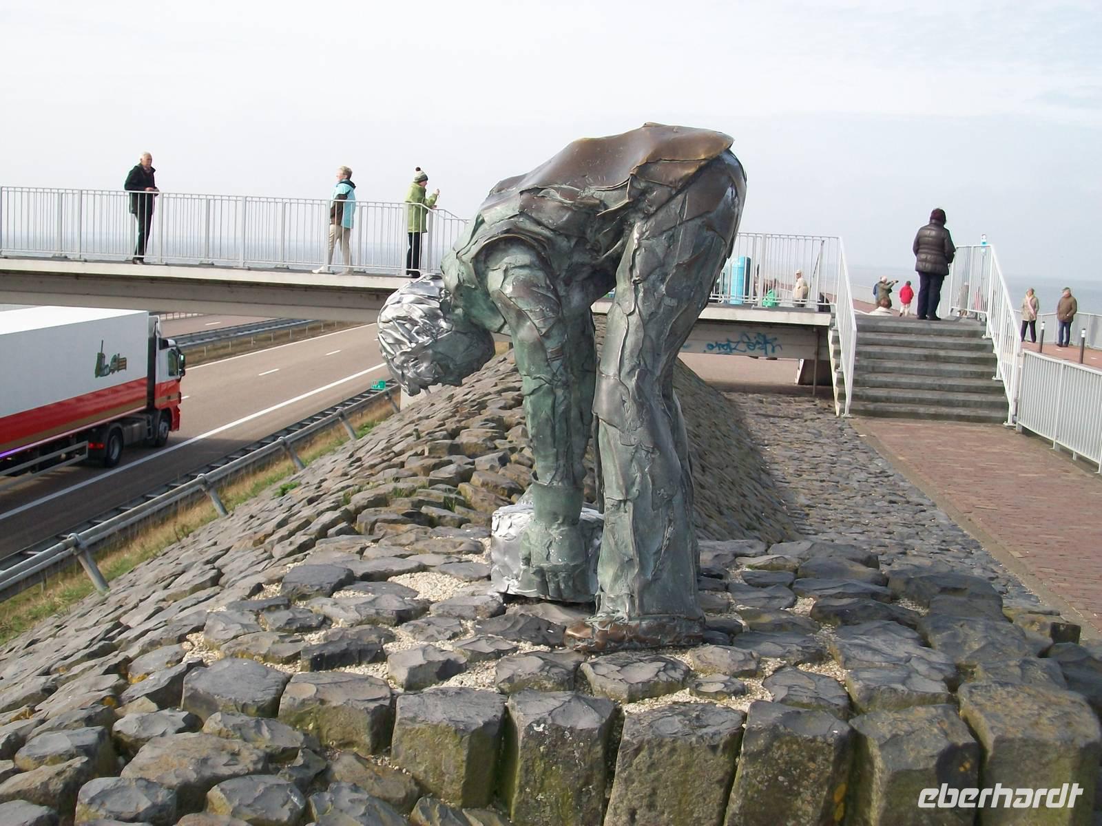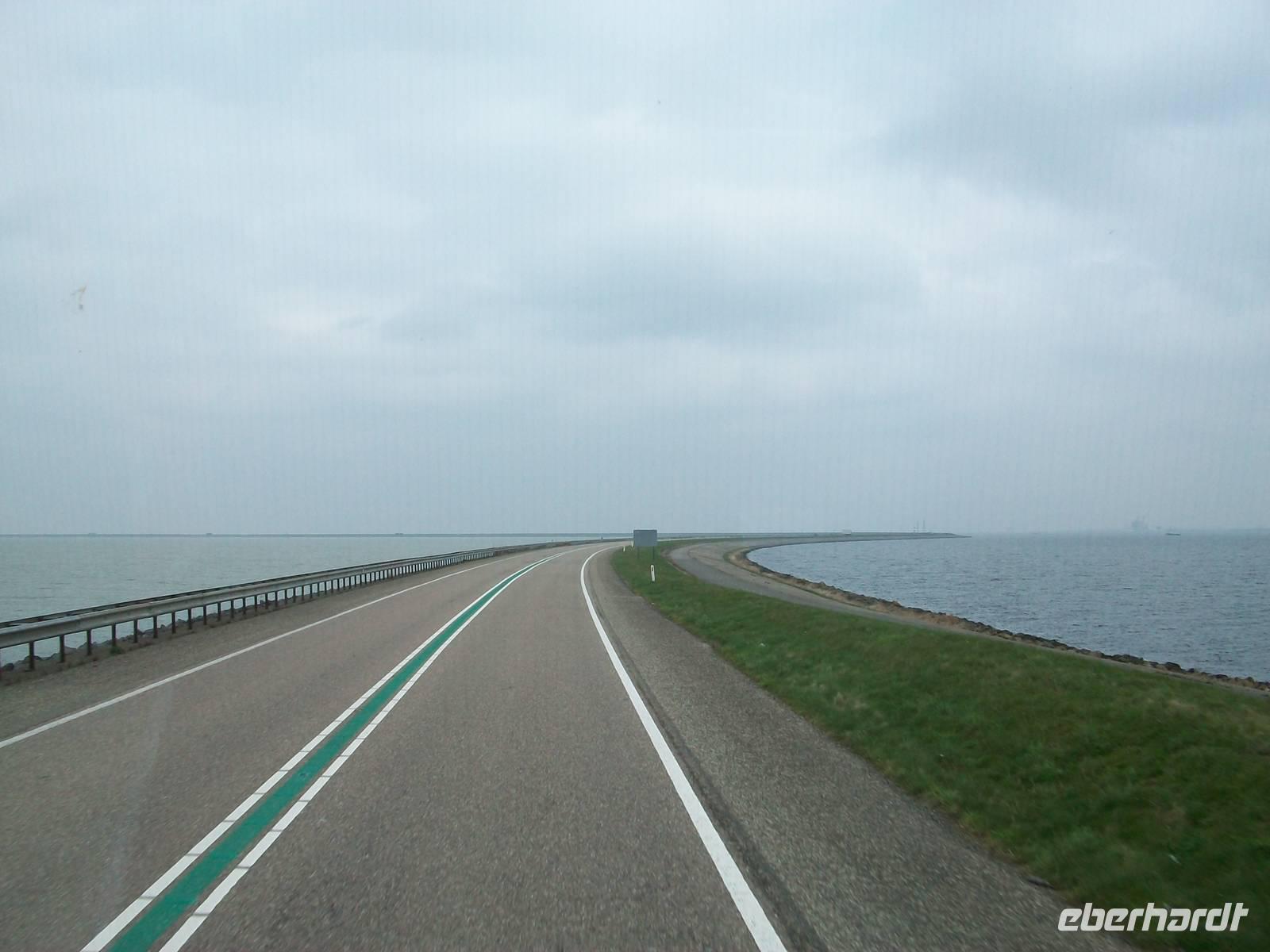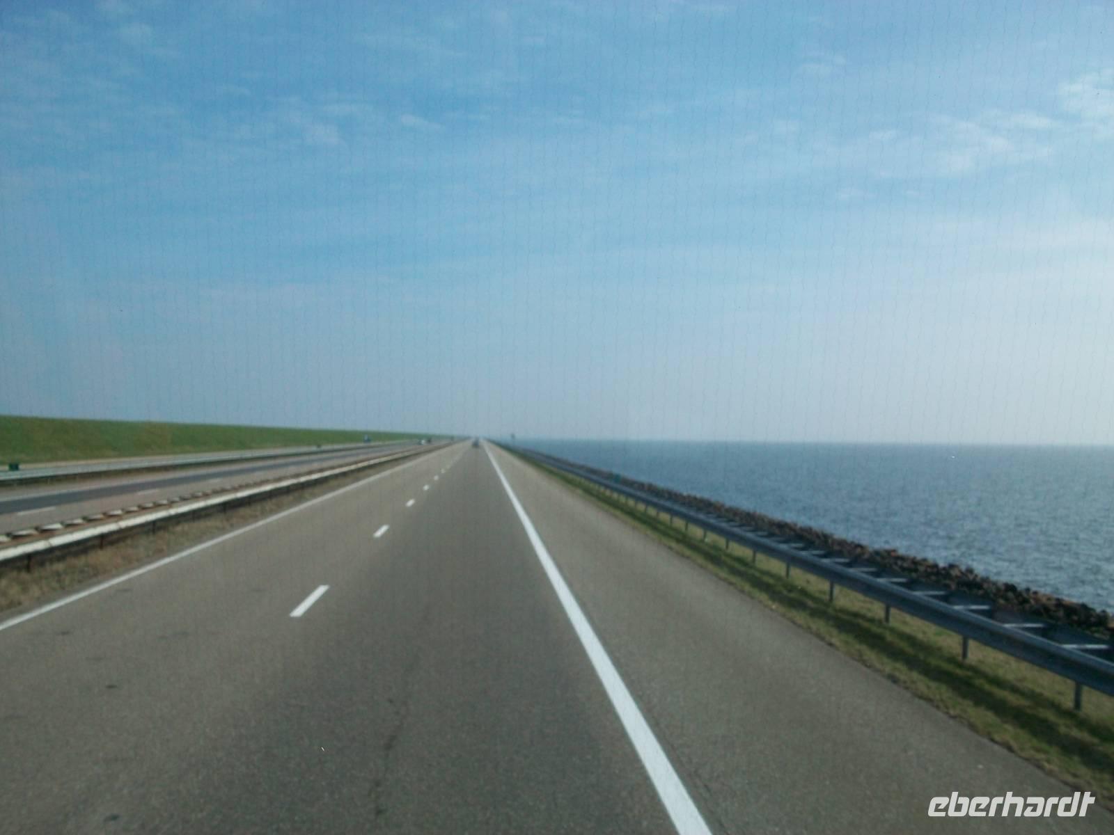Dann sind wir auf am gigantischen Abschlussteich angelangt. Er wurde in dem Dreißiger Jahren des 20. Jahrhunderts angelegt und mit seinen gut 30 Kilometern trennt er die Küste komplett ab, ein gigantischer Binnensee, das IJselmeer entstand. Auf der Dammkrone können wir einen Blick auf dieses Bauwerk werfen, links das schäumende offene Meer und rechts das große Binnengewässer.