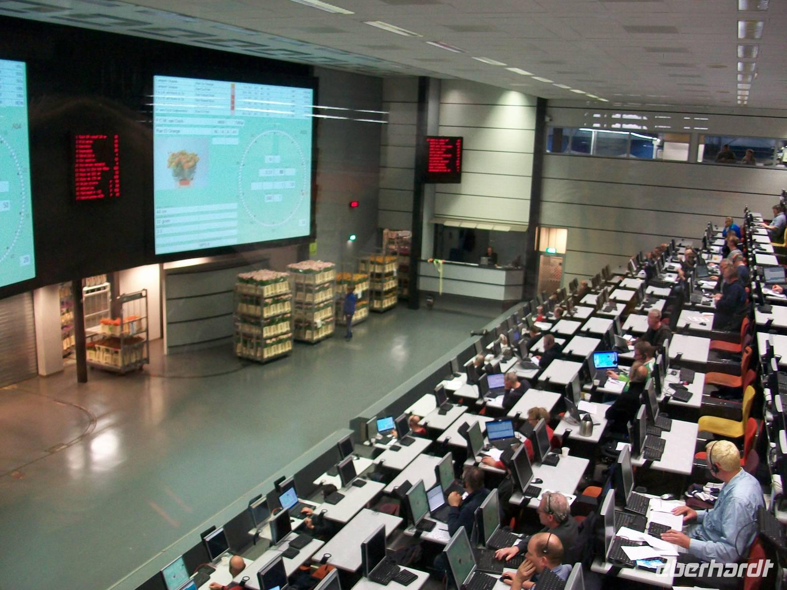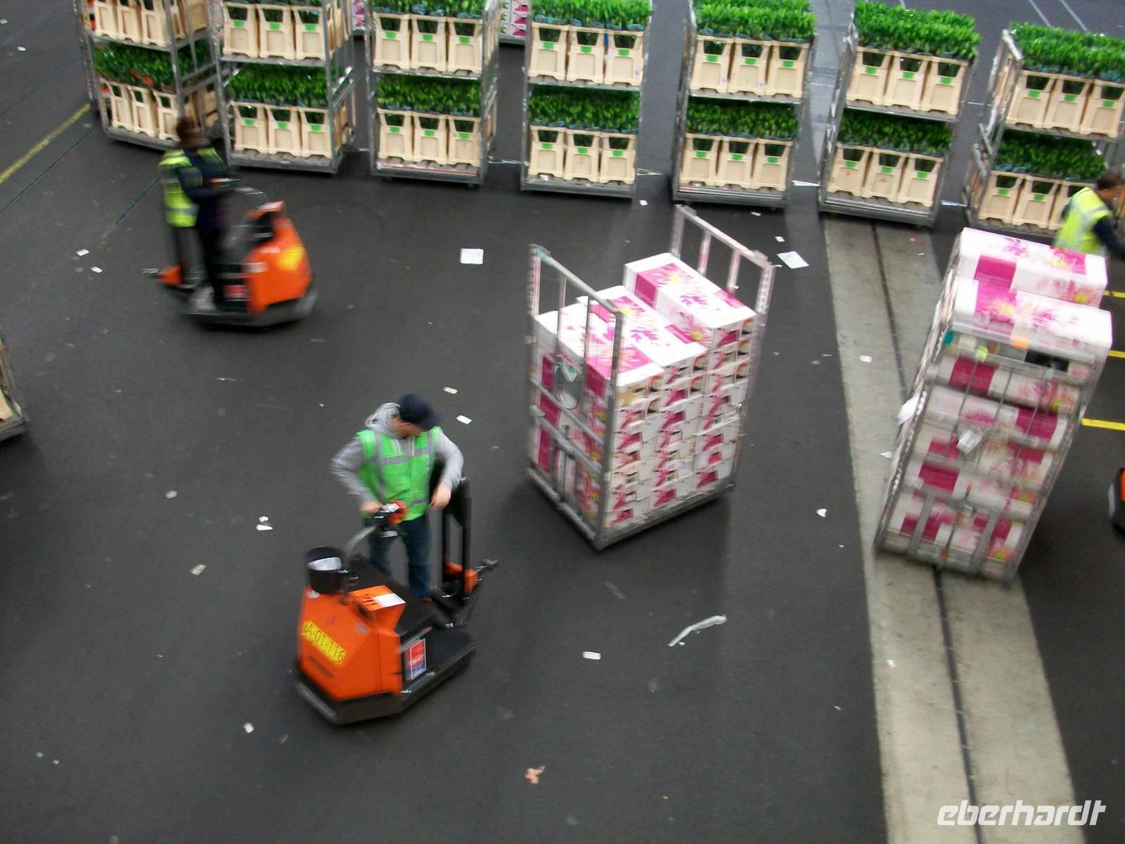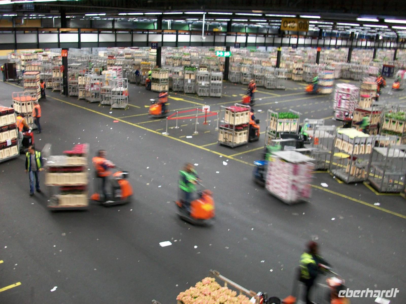 Wir betreten, nachdem wir den Eingang passiert haben, die breiten Laufstege innerhalb des Gebäudes, hier führt der Rundweg entlang und wir können den fleißigen Arbeitern bei ihrem Tagewerk zuschauen. Eilends werden Stapelwagen mit den verschiedensten Blumen und Pflanzen zusammengestellt, aneinandergekoppelt und dann geht schon die rasante Fahrt los um die Fracht zu den Auktionssälen zu bringen. Auch hier können wir zuschauen; in einem Hörsaal sitzen die Händler, begutachten die Ware, schauen auf die Auktionsuhr und ordern die Ware mit einem Knopfdruck. Auch das geht in rasender Schnelle, höchste Konzentration ist da gefragt. Danach verlassen die Gebinde den Saal und werden zur Verladung gebracht. Wie in einem schwirrenden Ameisenhaufen bewegen sich die Fahrzeuge, es sieht zwar chaotisch aus, folgt aber einer strengen und kalkulierten Logistik, schließlich muss die empfindliche Ware schnell zum Empfänger.