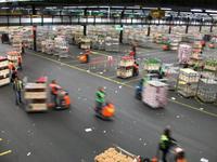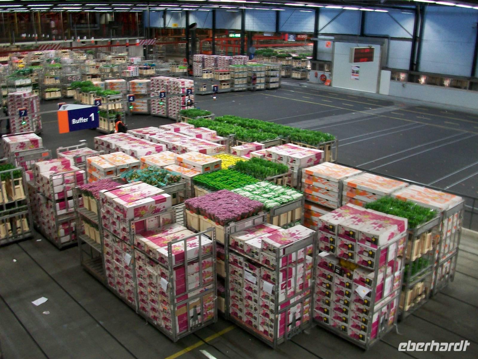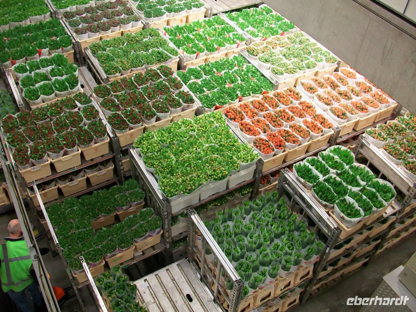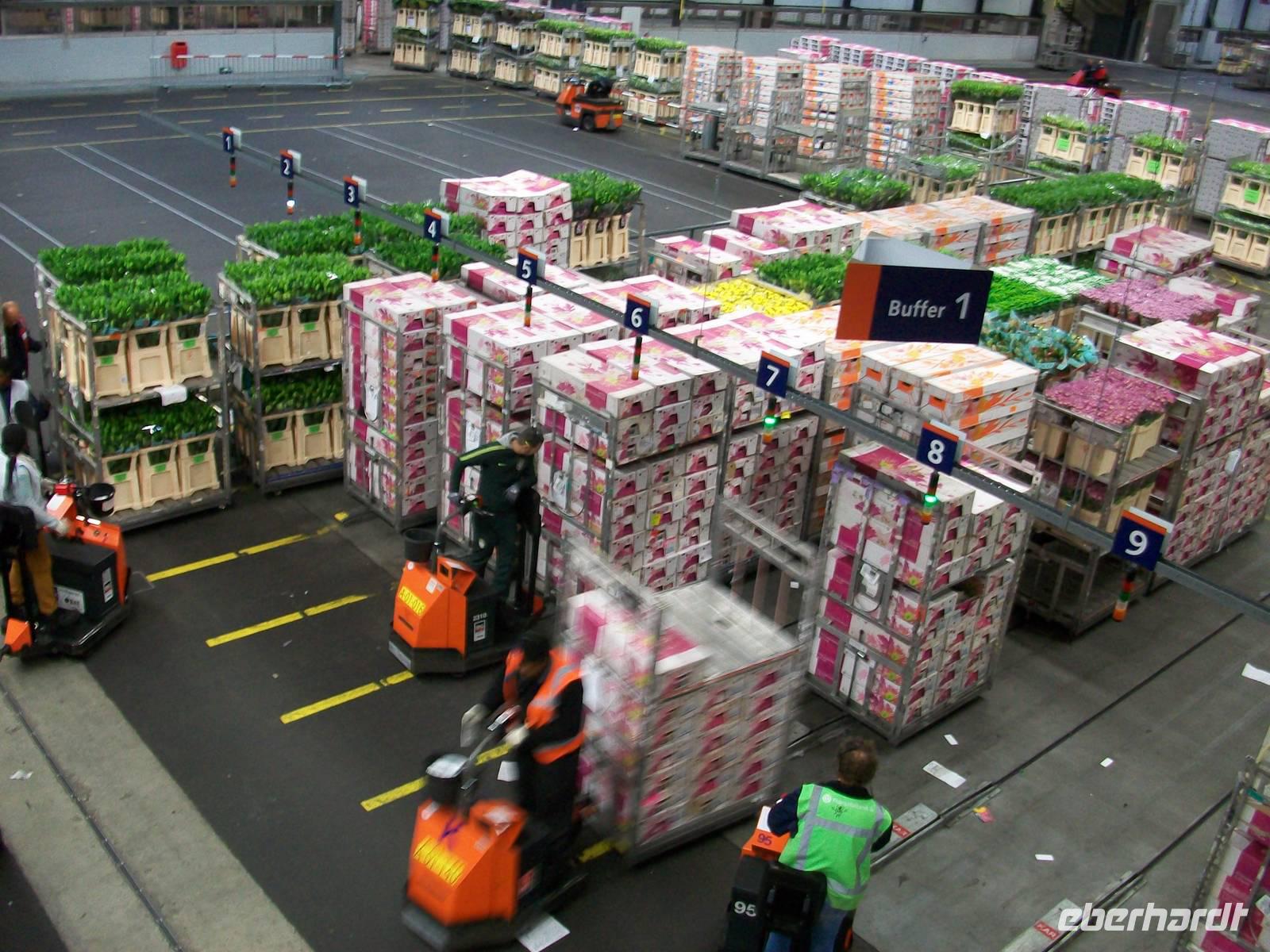 Wir betreten, nachdem wir den Eingang passiert haben, die breiten Laufstege innerhalb des Gebäudes, hier führt der Rundweg entlang und wir können den fleißigen Arbeitern bei ihrem Tagewerk zuschauen. Eilends werden Stapelwagen mit den verschiedensten Blumen und Pflanzen zusammengestellt, aneinandergekoppelt und dann geht schon die rasante Fahrt los um die Fracht zu den Auktionssälen zu bringen. Auch hier können wir zuschauen; in einem Hörsaal sitzen die Händler, begutachten die Ware, schauen auf die Auktionsuhr und ordern die Ware mit einem Knopfdruck. Auch das geht in rasender Schnelle, höchste Konzentration ist da gefragt. Danach verlassen die Gebinde den Saal und werden zur Verladung gebracht. Wie in einem schwirrenden Ameisenhaufen bewegen sich die Fahrzeuge, es sieht zwar chaotisch aus, folgt aber einer strengen und kalkulierten Logistik, schließlich muss die empfindliche Ware schnell zum Empfänger.
