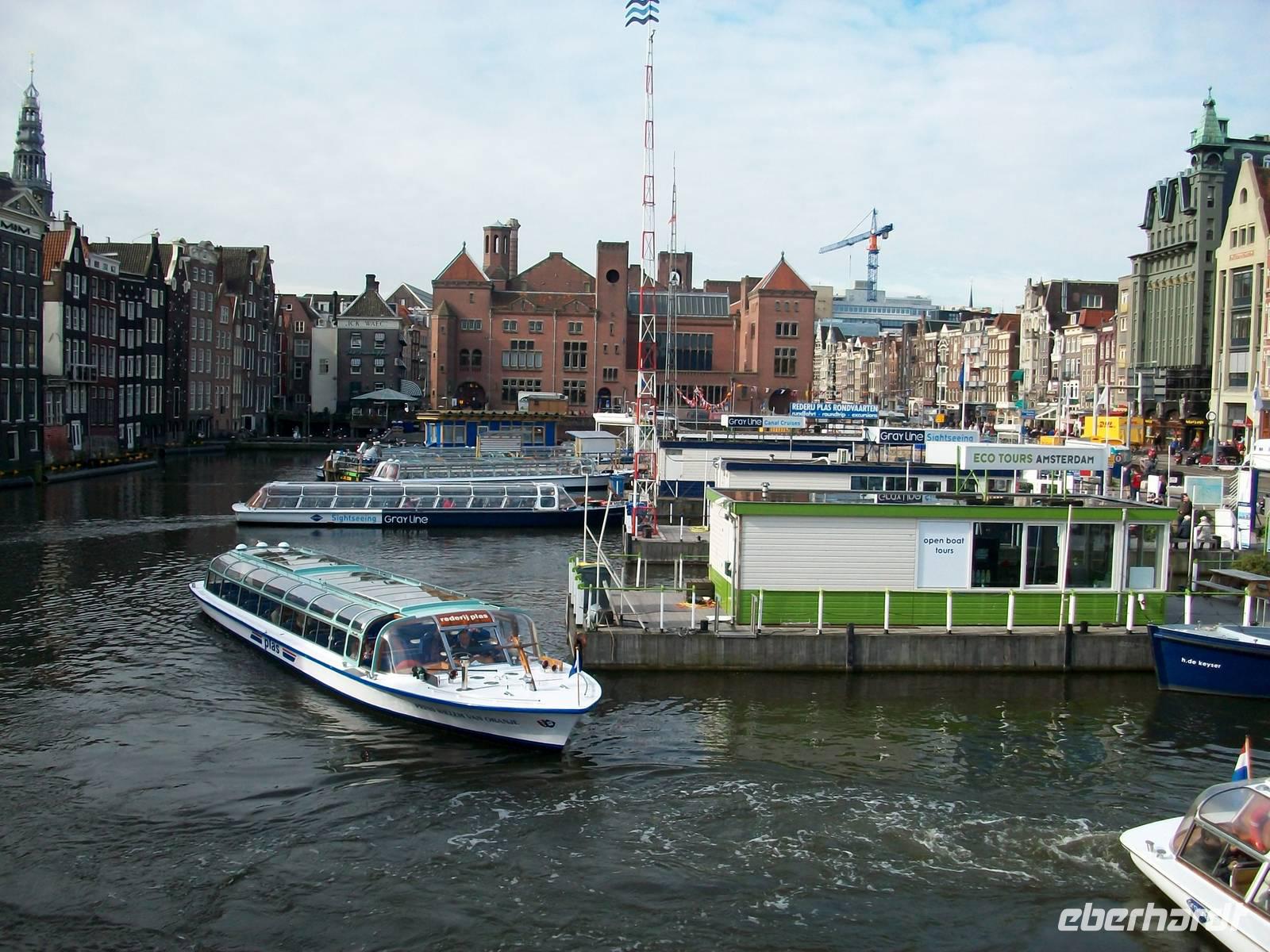 In der Höhe der Nikolauskirche verlassen wir den Bus und sind nun zu Fuß unterwegs einem ganz besonderen Erlebnis entgegen zu gehen. Parallel zum Damrak ist ein Kanal und hier beginnt wenig später die Grachtenrundfahrt.