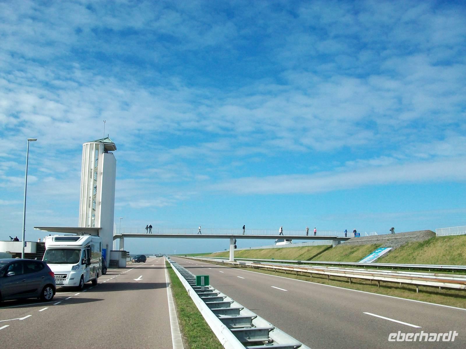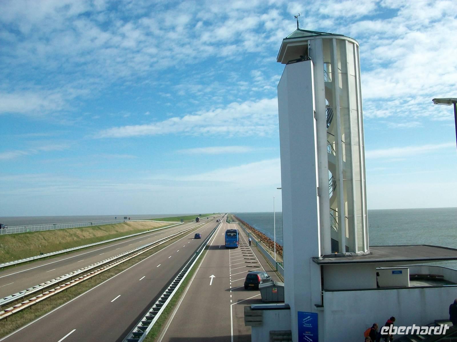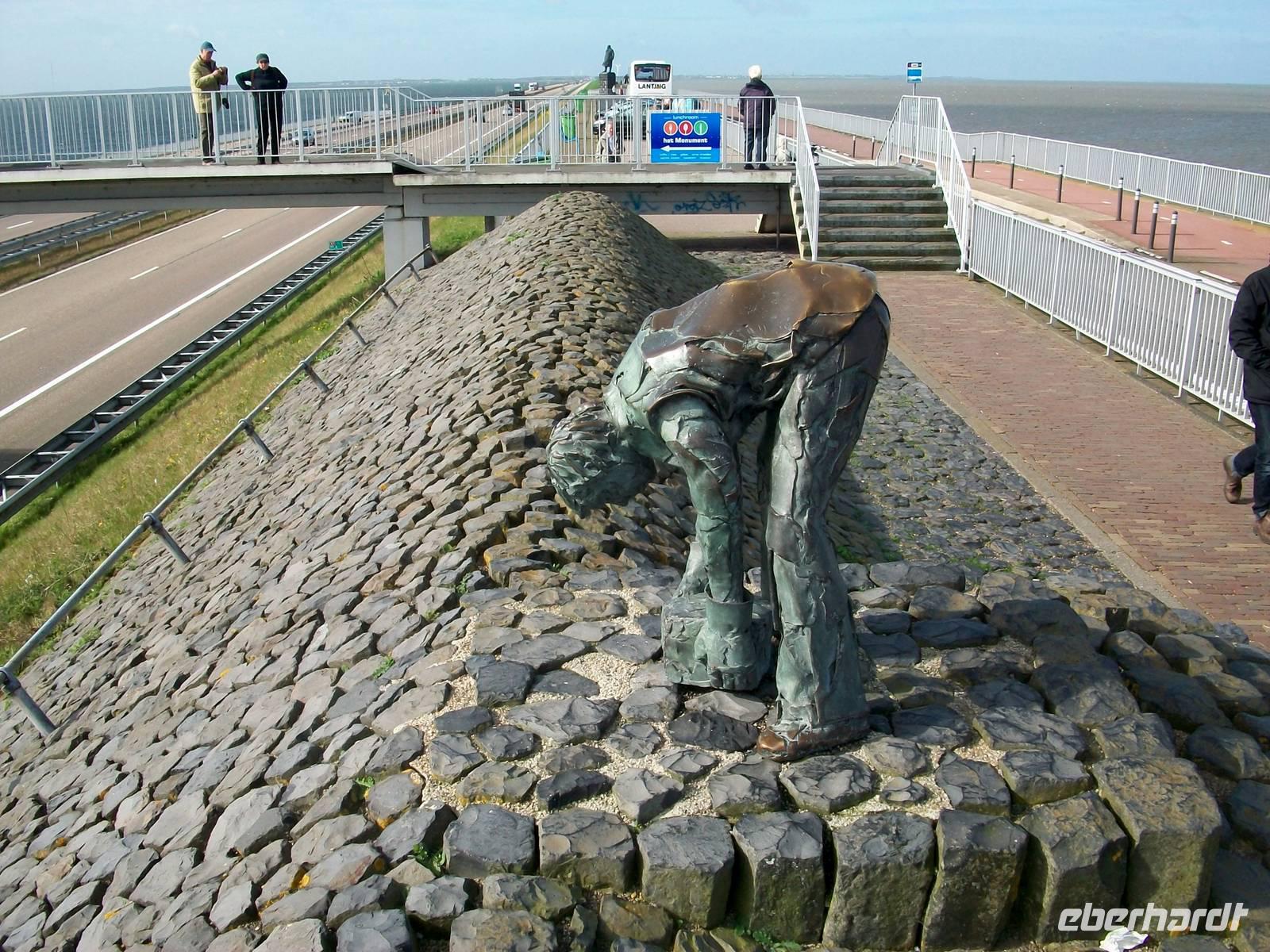 Bald sind wir am Abschlussdeich angelangt, einem mächtigen von Menschenhand geschaffenen Damm der gut dreißig Kilometer lang ist. Am Monument, welches an die Erbauung erinnert, legen wir einen Stopp ein und können auch einen Aussichtssturm hinaufsteigen, der Blick auf dieses einmalige Bauwerk ist gigantisch.
