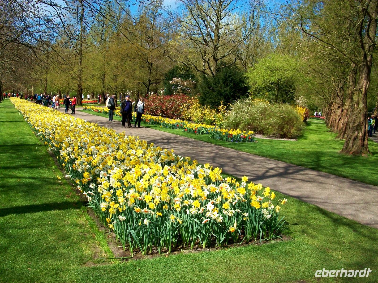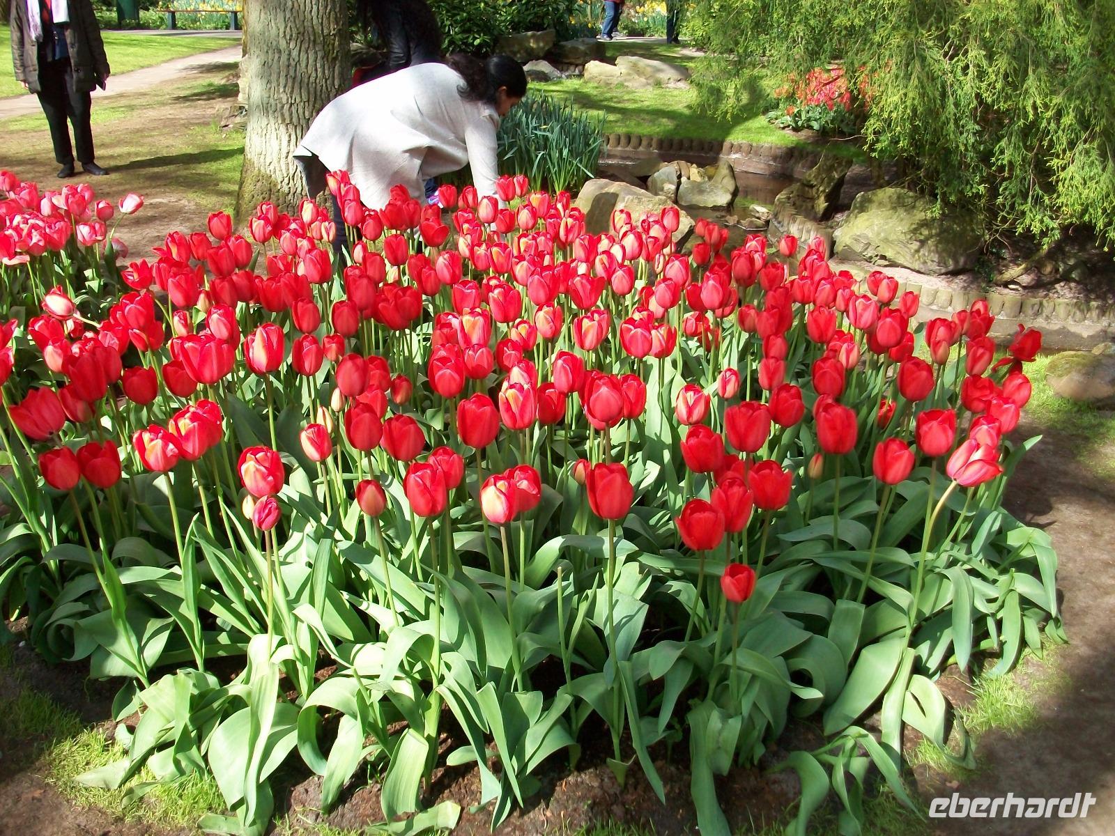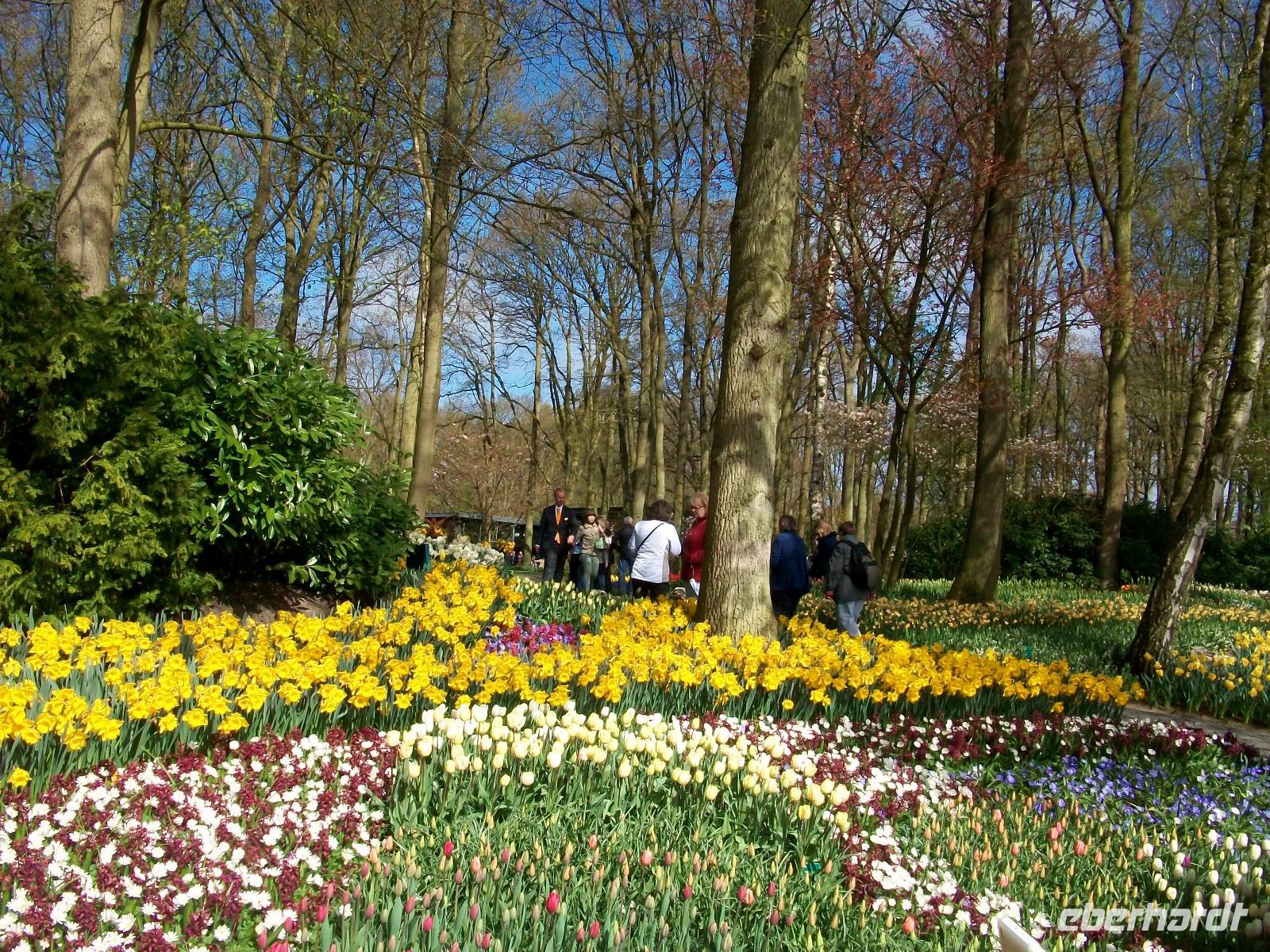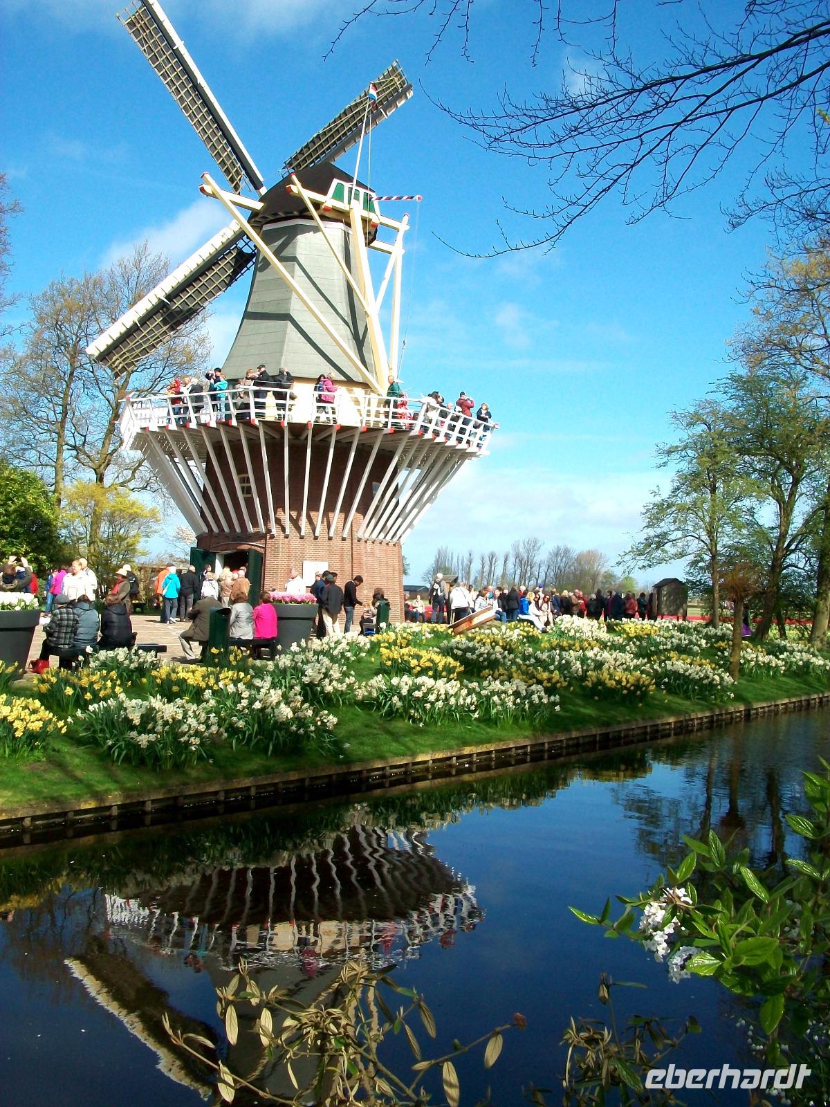 8.30 Uhr. Unser Bus steht bereit; eine kühle Brise umweht uns, aber bald sind wir unterwegs. Leider geht es nicht ganz ohne Stau, aber nach einer knapp zweistündigen Fahrt langen wir dann an unserem ersten Ziel an, dem Keukenhof. Einstmals diente er zum Anbau allerlei würziger Pflanzen, daher sein Name (deutsch: Küchenhof), heute jedoch ist er ein Muss für Blumenfreunde aus der ganzen Welt. Zahlreiche Busse sind schon auf dem Parkplatz zu sehen, bald sind die Karten verteilt und der Besuch kann beginnen. Zunächst gelangen wir zu einem kleinen See mit Springbrunnen, von hier beginnen dann die Wege durch den Park. Flankiert wird der Rundgang von immer neuen farbenprächtigen Impressionen und das Auge kann sich gar nicht satt sehen an der Farbenpracht der Blumen. Überall sind Tulpen zu sehen in Formen und Farben die es wohl nur hier gibt. Aber das nicht allein; ein intensiver Geruch kündigt uns ein Beet von Hyazinthen an, dort um die Ecke stehen gelb blühende Narzissen und wenig später gelangt der Besucher an den großen See der buchstäblich eingerahmt ist von einem Blütenmeer. Dazu lacht die Sonne vom blauen Himmel herab, die Vögel zwitschern und wir können den Besuch dieser einmaligen Blumenschau mit allen Sinnen genießen. Wie schön ist die Natur für den, der sich an ihr erfreuen kann!