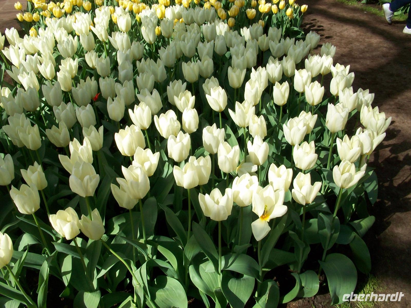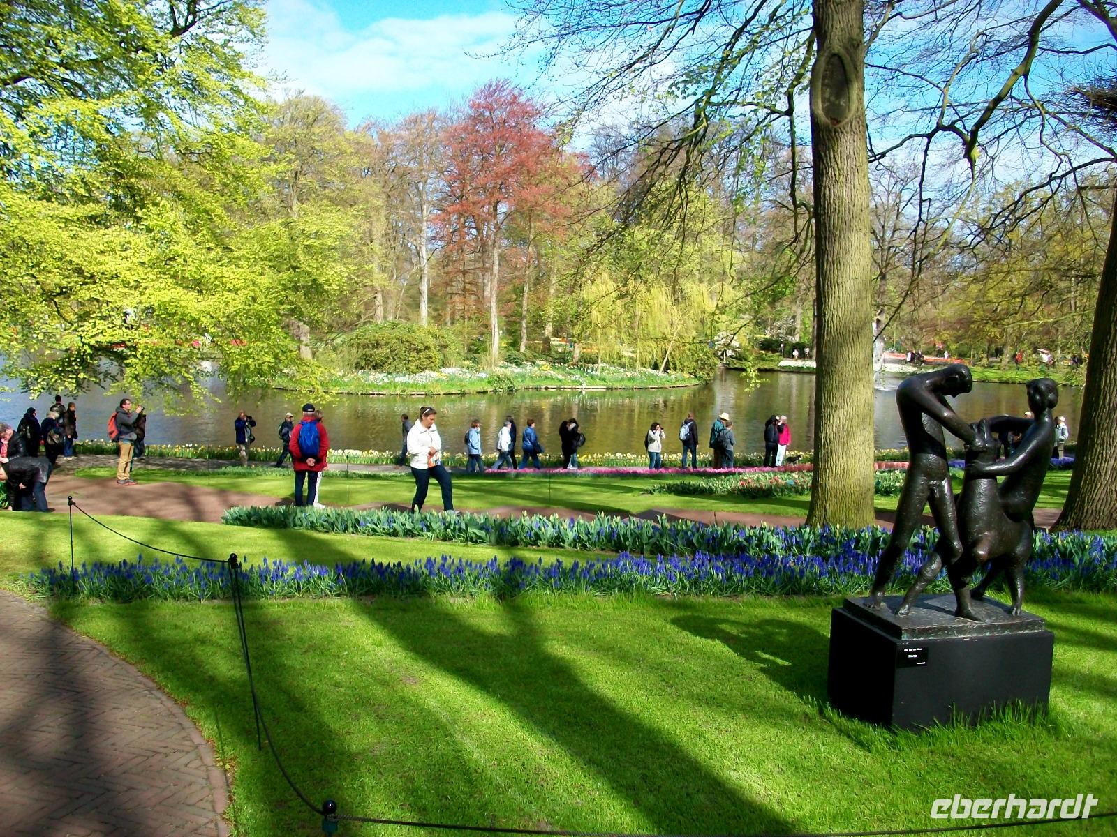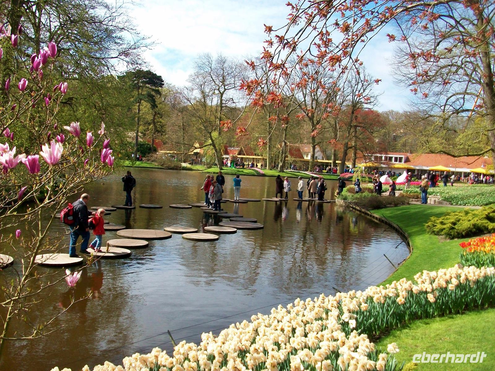 8.30 Uhr. Unser Bus steht bereit; eine kühle Brise umweht uns, aber bald sind wir unterwegs. Leider geht es nicht ganz ohne Stau, aber nach einer knapp zweistündigen Fahrt langen wir dann an unserem ersten Ziel an, dem Keukenhof. Einstmals diente er zum Anbau allerlei würziger Pflanzen, daher sein Name (deutsch: Küchenhof), heute jedoch ist er ein Muss für Blumenfreunde aus der ganzen Welt. Zahlreiche Busse sind schon auf dem Parkplatz zu sehen, bald sind die Karten verteilt und der Besuch kann beginnen. Zunächst gelangen wir zu einem kleinen See mit Springbrunnen, von hier beginnen dann die Wege durch den Park. Flankiert wird der Rundgang von immer neuen farbenprächtigen Impressionen und das Auge kann sich gar nicht satt sehen an der Farbenpracht der Blumen. Überall sind Tulpen zu sehen in Formen und Farben die es wohl nur hier gibt. Aber das nicht allein; ein intensiver Geruch kündigt uns ein Beet von Hyazinthen an, dort um die Ecke stehen gelb blühende Narzissen und wenig später gelangt der Besucher an den großen See der buchstäblich eingerahmt ist von einem Blütenmeer. Dazu lacht die Sonne vom blauen Himmel herab, die Vögel zwitschern und wir können den Besuch dieser einmaligen Blumenschau mit allen Sinnen genießen. Wie schön ist die Natur für den, der sich an ihr erfreuen kann!