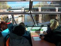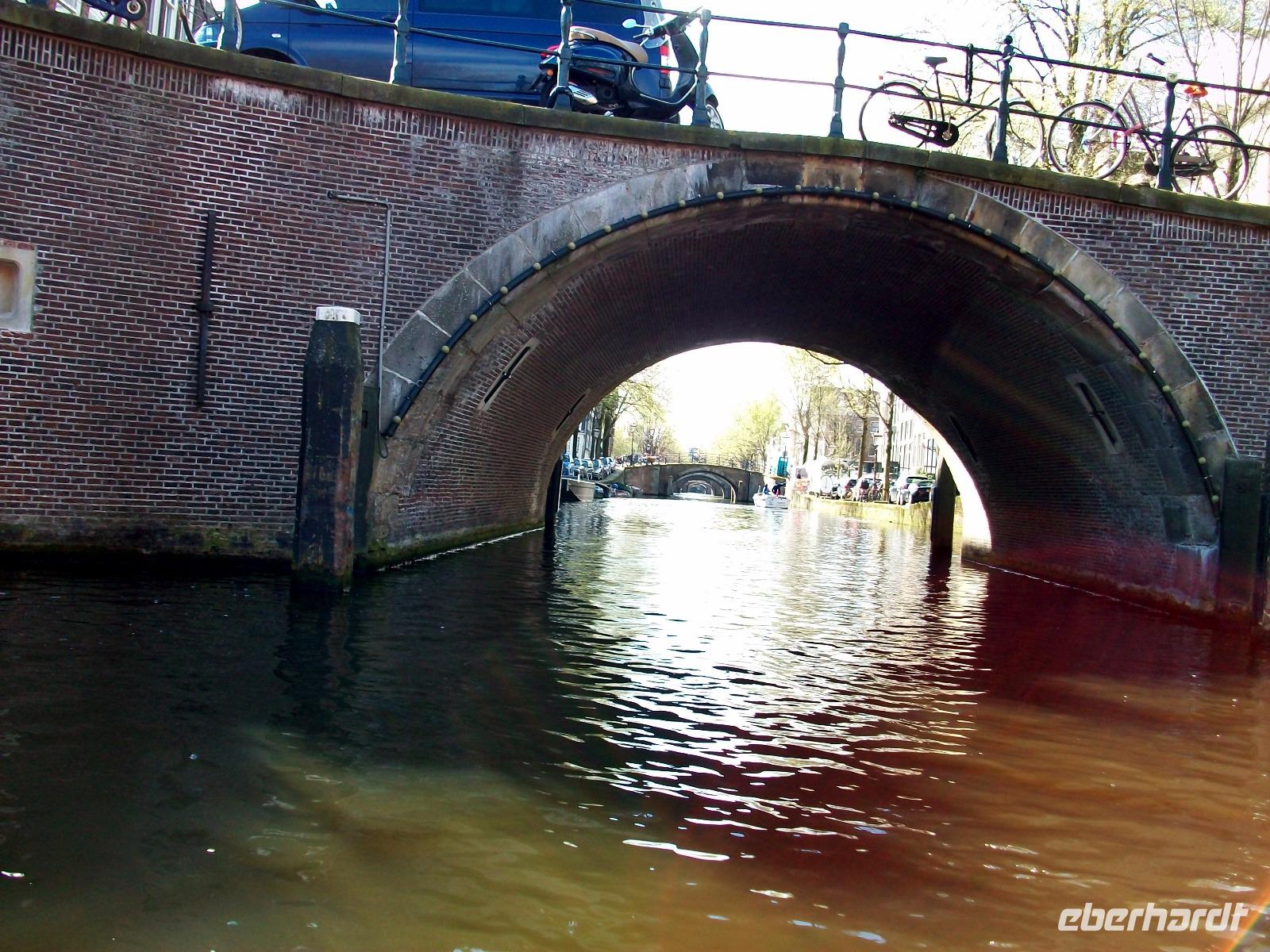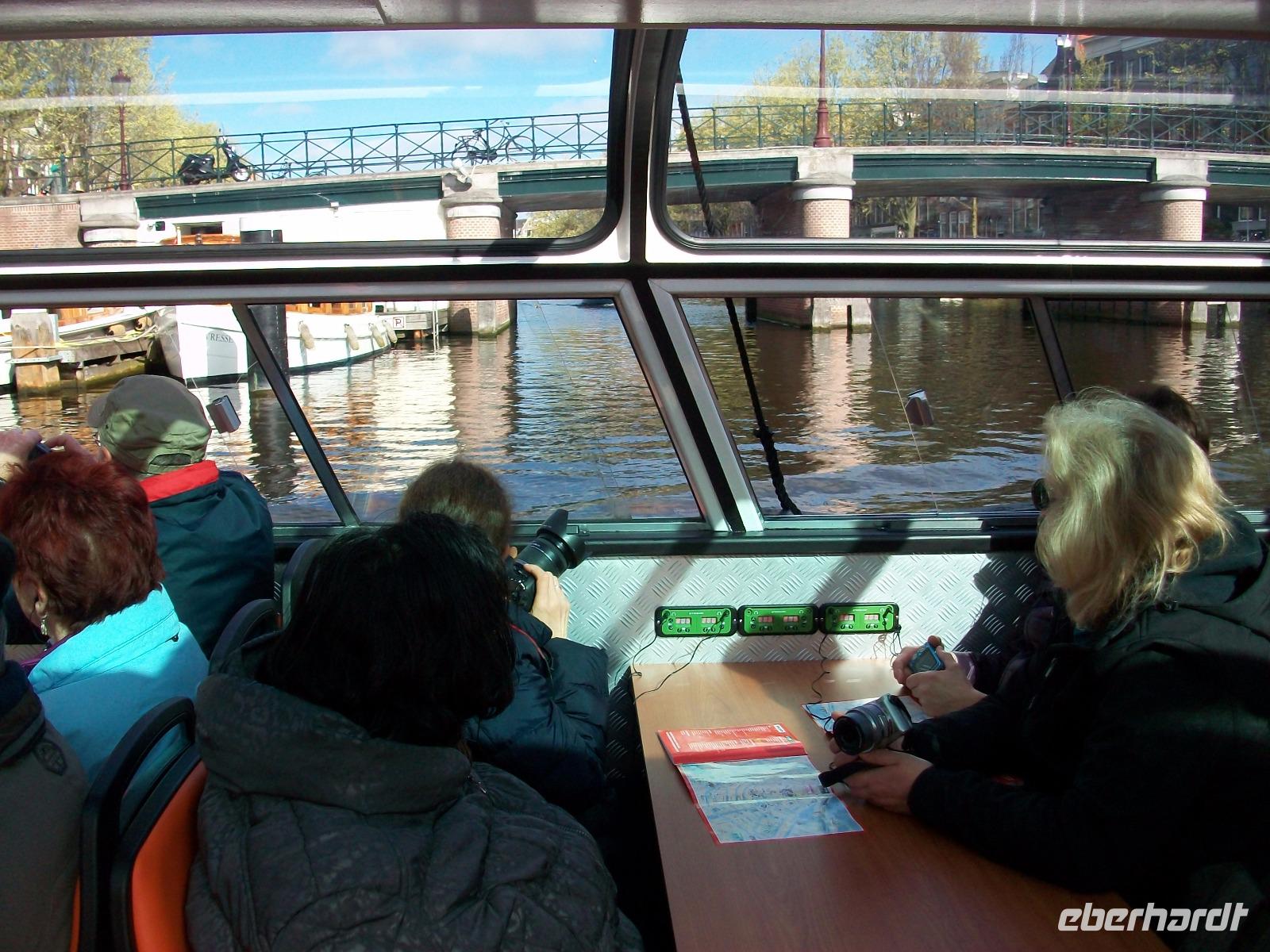 Im Zentrum angelangt sehen wir bald auf der rechten Seite die schöne Fassade des Hauptbahnhofs und wenig später gelangen wir zum Anleger des Bootes welches uns in der nächsten guten Stunde durch die Grachten Amsterdams bringen wird. Wir sind zwar zu zeitig da, aber wir können dennoch starten; nachdem wir Platz genommen haben, beginnt diese einmalige Fahrt und wir können die Stadt von dieser besonderen Perspektive durch die großen Panoramafenster genießen. Wir sehen all die uralten Brücken, die pittoresken Häuser der Stadt und auch die Menschen bei ihrem täglichen Tun. Und da sind dann noch die zahllosen Fahrräder die selbst an den unmöglichsten Stellen abgestellt werden, diese ganz besonderen Impressionen bleiben im Gedächtnis haften.
