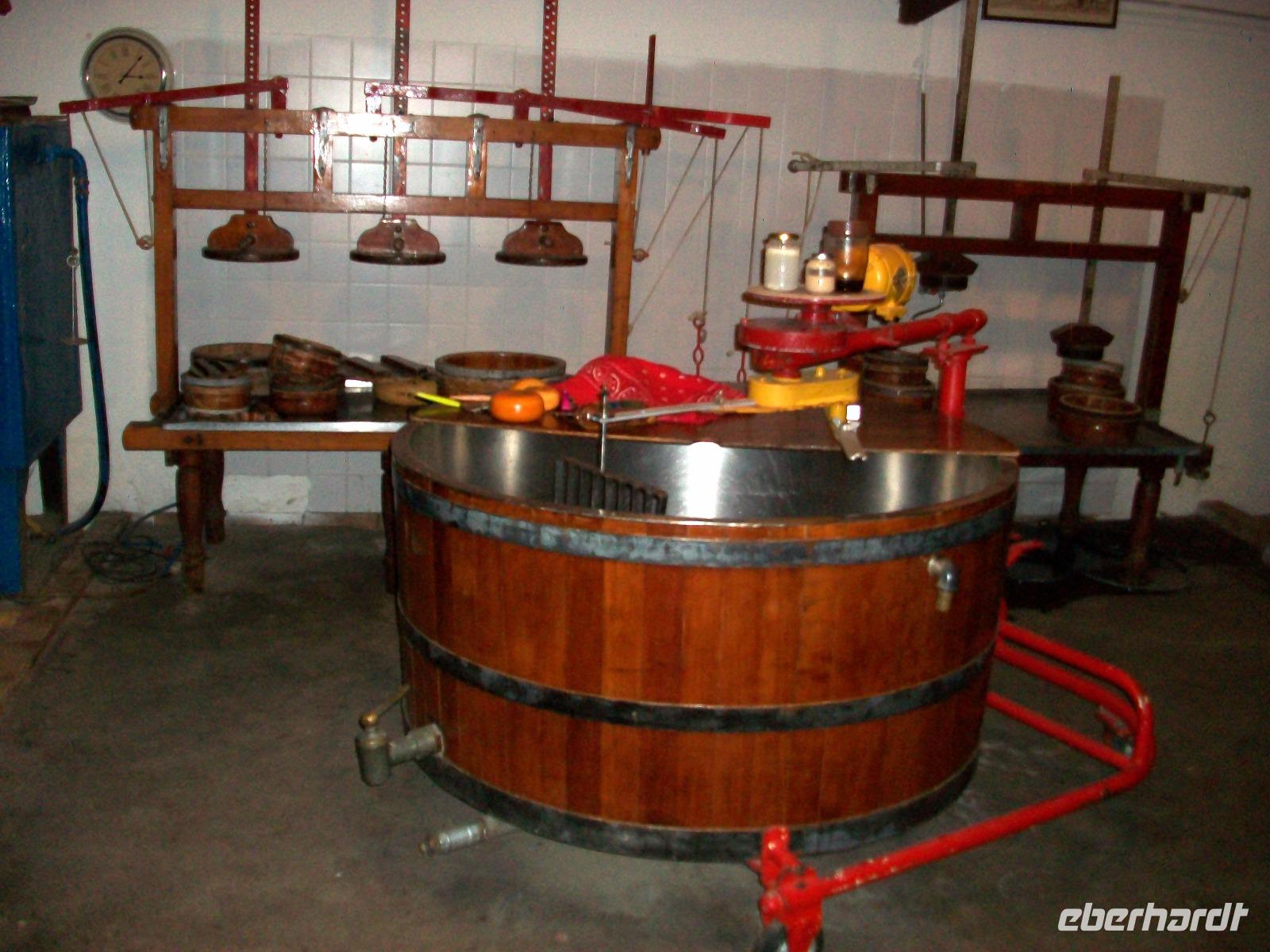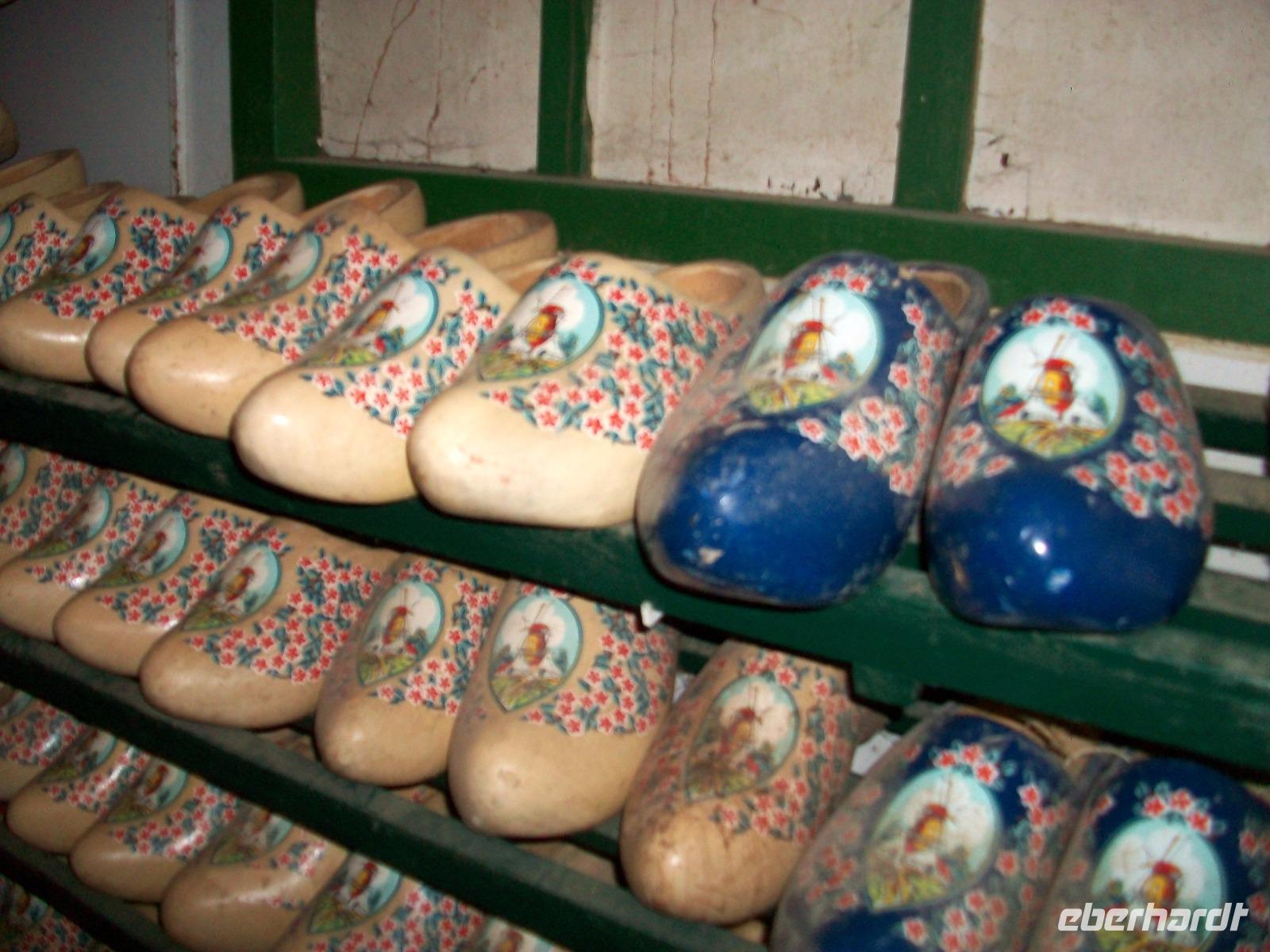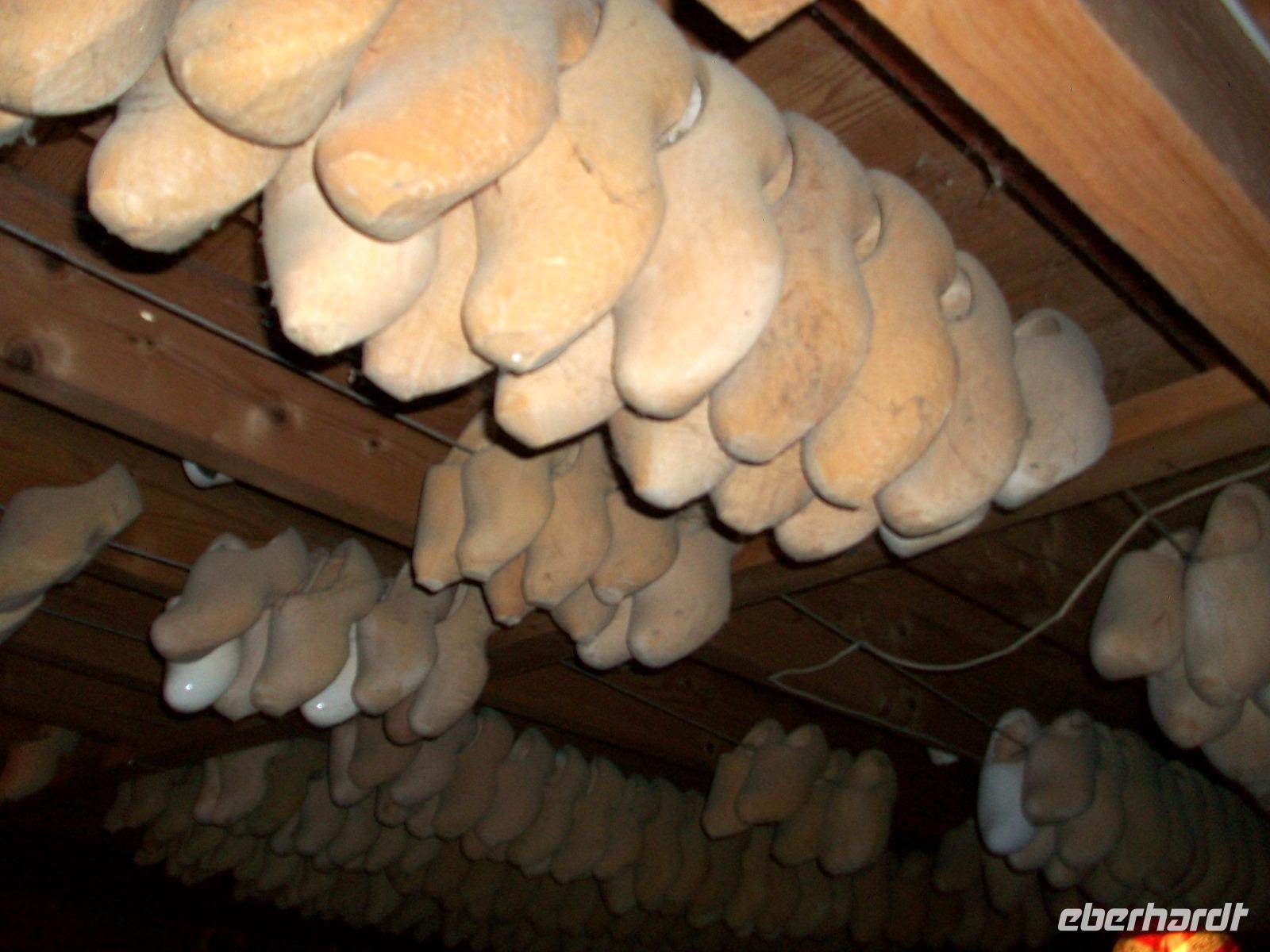 In einem anderen Teil des Gehöfts steht die Maschine mit welcher die Holzschuhe, die hier Klompen heißen, gefertigt werden. So humorvoll wie wissenswert werden wir nun in die Geheimnisse der Schuhe aus Pappelholz eingeführt. Dann dürfen wir selbstverständlich auch noch vom leckeren Käse kosten, so dass wir am Ende sagen können: es war ein interessanter Ausflug auf das Land!
