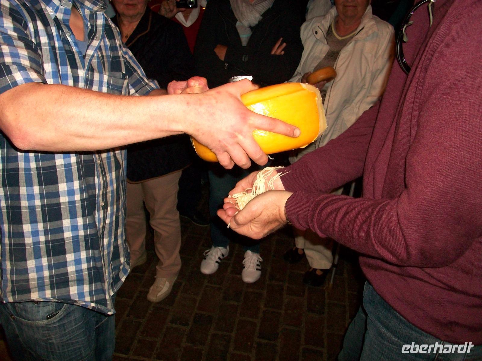 Bald haben wir die quirlige Großstadt verlassen und auf dem Weg nach Amstelveen, einem Vorort, sind wir schnell im ländlichen Bereich angelangt. Auf dem Weg zum Bauernhof fahren wir entlang des Wassers an dessen Ufern die Radfahrer unterwegs sind. Dann schwenken wir in einen schmalen Weg ein und sind schon im Hof des Käsebauern angekommen. Würzige Landluft empfängt uns beim Aussteigen und bevor wir uns mit dem Käse genauer beschäftigen werden, sehen wir die Kühe im Stall und drehen eine Runde auf dem Bauernhof. Dann begrüßt uns Max von der Familie und von ihm erfahren wir Wissenswertes vom berühmten holländischen Käse. Auch lernen wir den Unterschied zwischen Industrieware und dem typischen Käse der bäuerlichen Tradition kennen, den es nur hier auf diesen Höfen gibt.