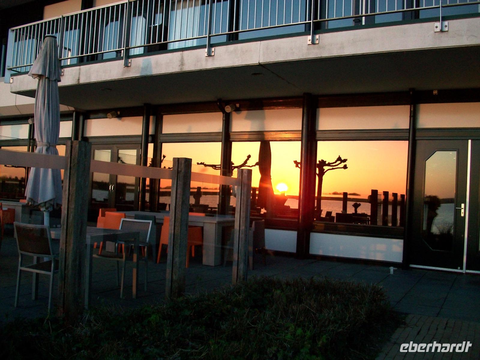 Dann wird das Land flach; an den fruchtbaren Feldern des Niederrheins vorbei, gelangen wir hinter Emmerich über die Grenze in die Niederlande. Freundlich scheint die nachmittägliche Sonne herab als wir dann kurz vor halb sechs an unserem Hotel, das direkt am Wasser liegt, anlangen. Diese reizvolle Lage lädt zu einem ersten Spaziergang ein und als sich unsere Reisegruppe zum Abendessen wiedersieht, genießen wir das leckere Diner und freuen uns auf die Ereignisse der nächsten Tage; morgen schon werden wir Holland so zu sehen bekommen wie wir es uns immer vorgestellt haben.