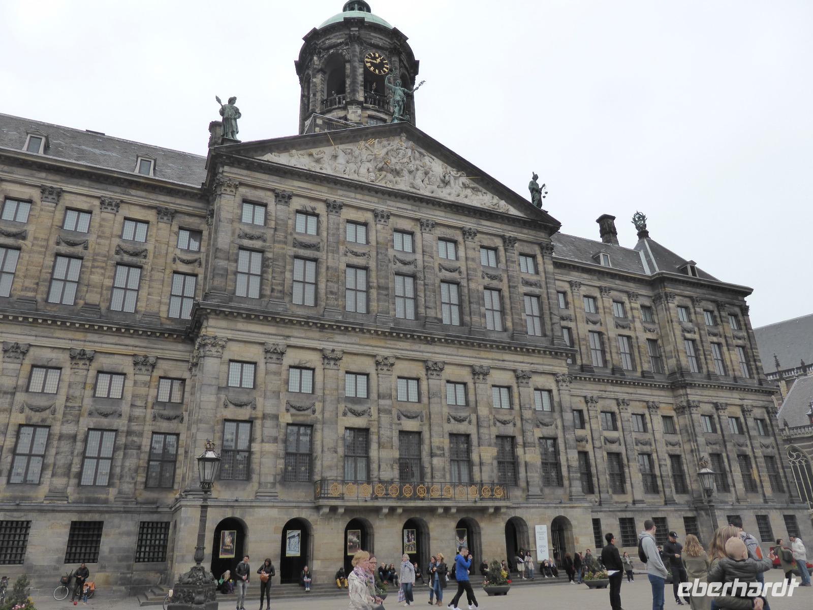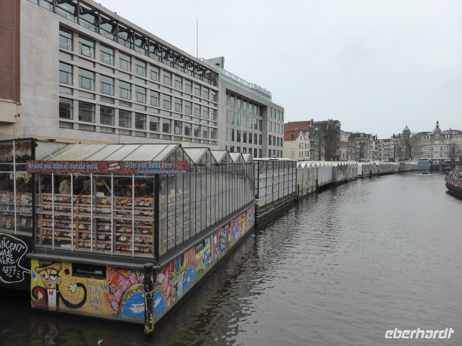 Über den Platz Spui erreichten wir unser Ziel den schwimmenden Blumenmarkt. Hier stand uns die Zeit zur freien Verfügung für einen kleinen Imbiss (leckere Kippeling oder Hering) und den Bummel entlang der schwimmenden Verkaufsstände. Auf dem Rückweg passierten wir noch das monumentale Gebäude der Börse des Architekten Berlange.