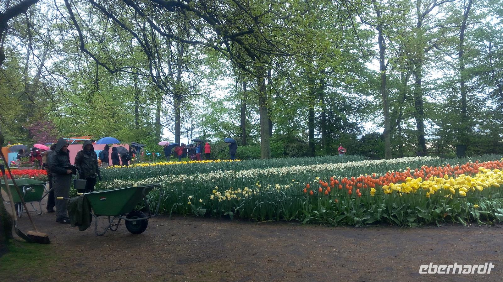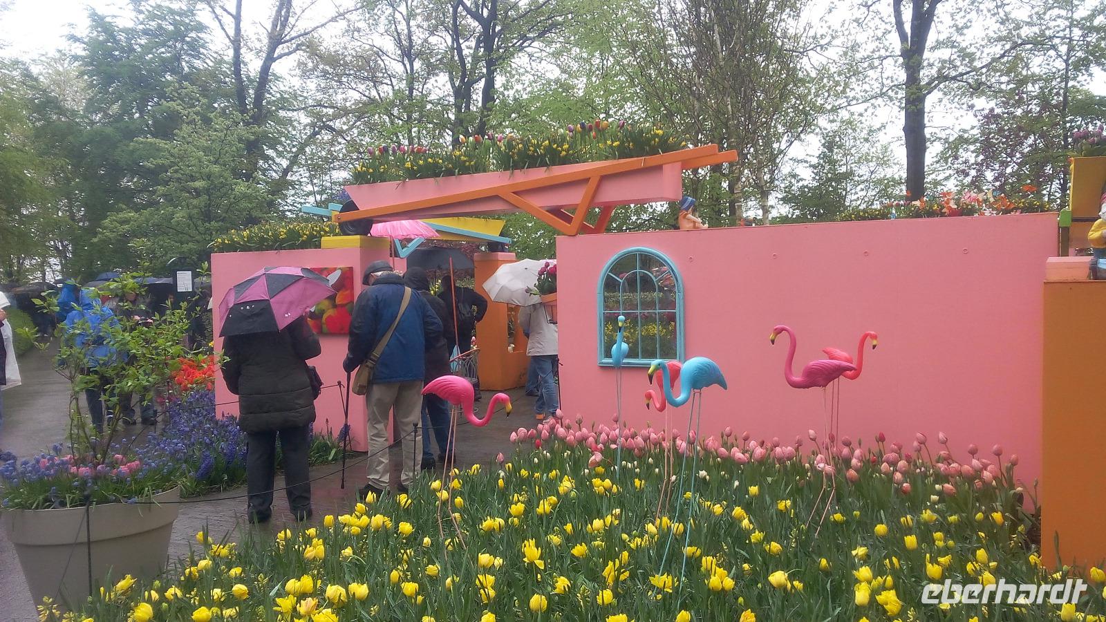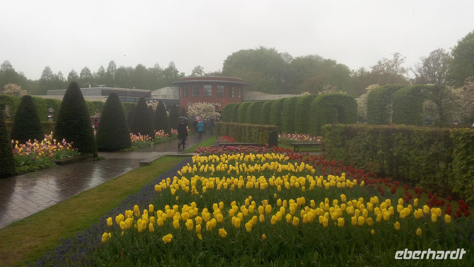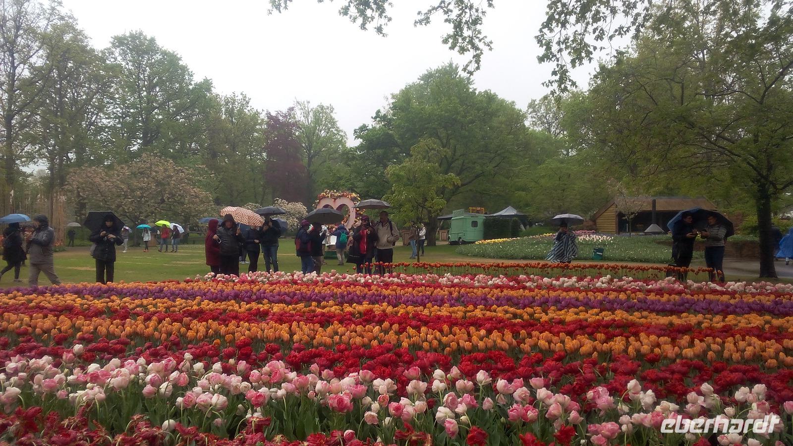 Hier blühen Meere von Tulpen, Narzissen, Traubenhyazinthen. In diesem Jahr steht die Blumenausstellung ganz im Zeichen der Blumenromantik dafür wurde ein romantisches Tulpenmosaik mit 50.000 Blumenzwiebeln gestaltet. Da es immer noch regnet, bieten sich die unterschiedlichen Blumenshows in den Pavillons an.