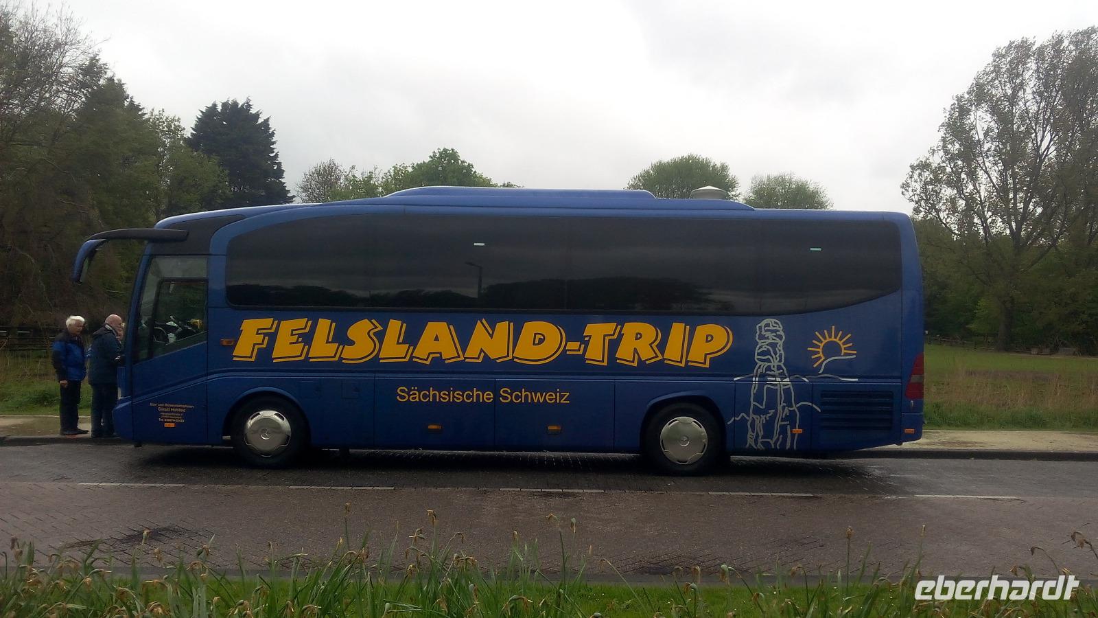 Am Sonntag beginnen wir unsere Fahrt in Dresden am Flughafen. Weitere Gäste steigen noch bis Ichtershausen ein und weiter 2 Gäste werden heute Abend im Hotel schon auf uns warten. Wir sind mit dem Busunternehmen Hohlfeld unterwegs und unser Fahrer/in sind Gerald und Gisela Hohlfeld. Unsere Fahrt führt uns entlang der A4 bis zum Kirchheimer Kreuz. Dann wechseln wir auf die A9 und später auf die A44. In Dortmund angekommen entscheiden wir uns für die Fahrt mitten durch den Ruhrpott. Spannend ist es schon, wenn man an der Westfalenhalle Dortmund vorbei fährt.