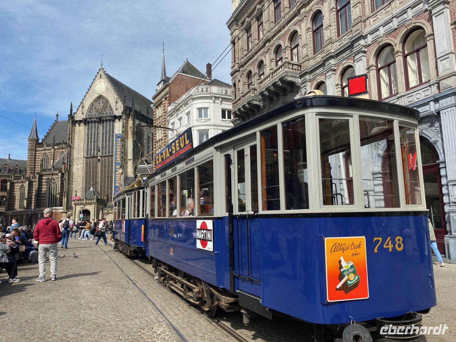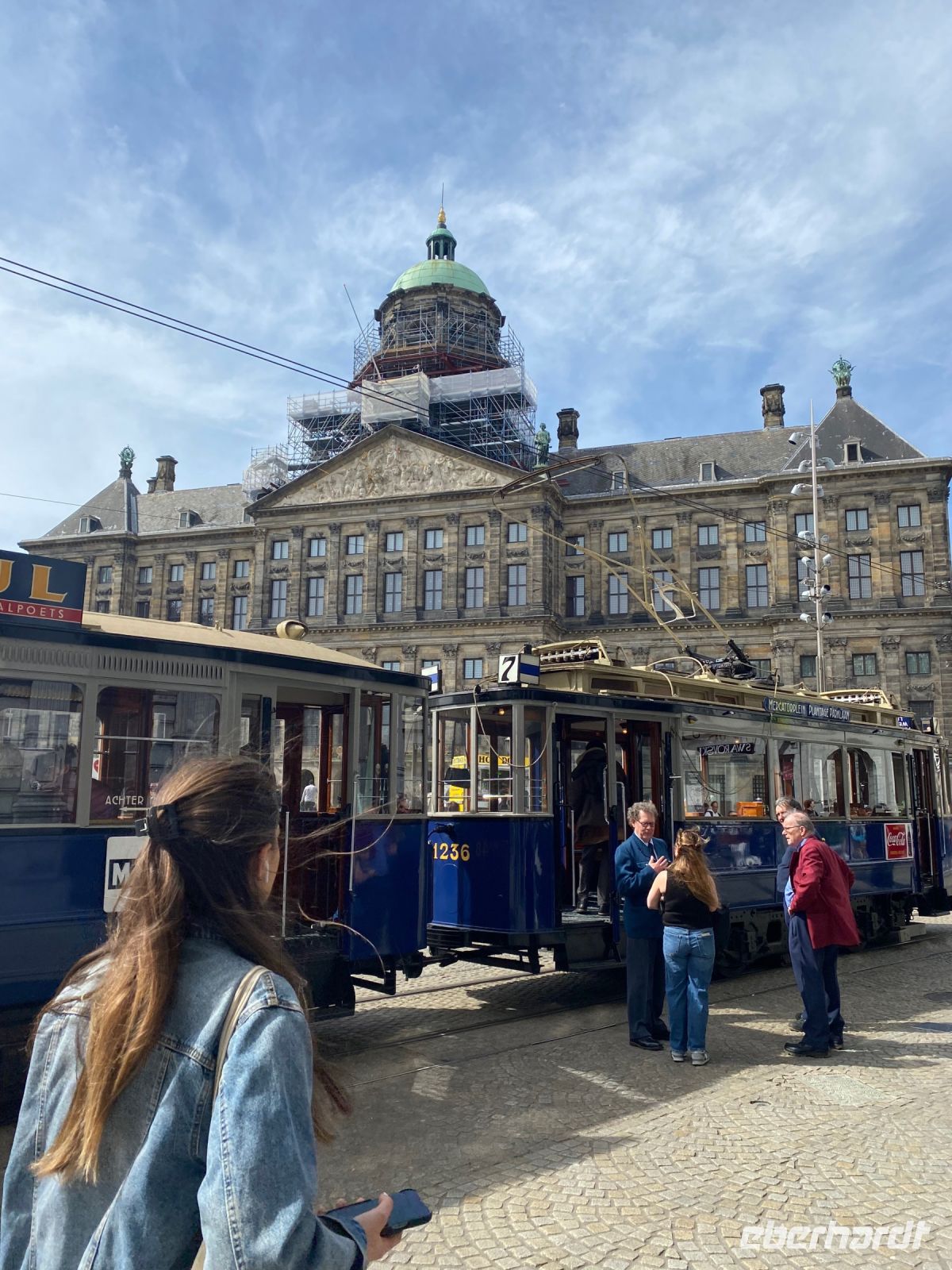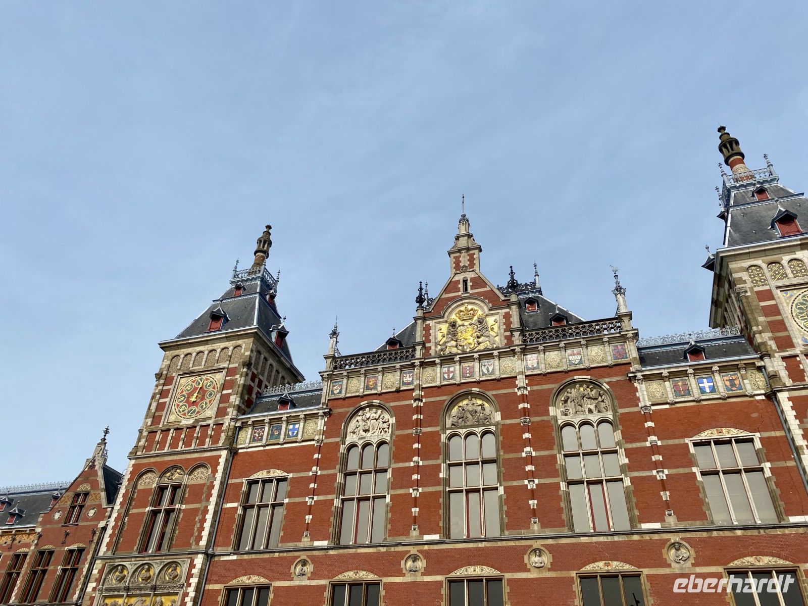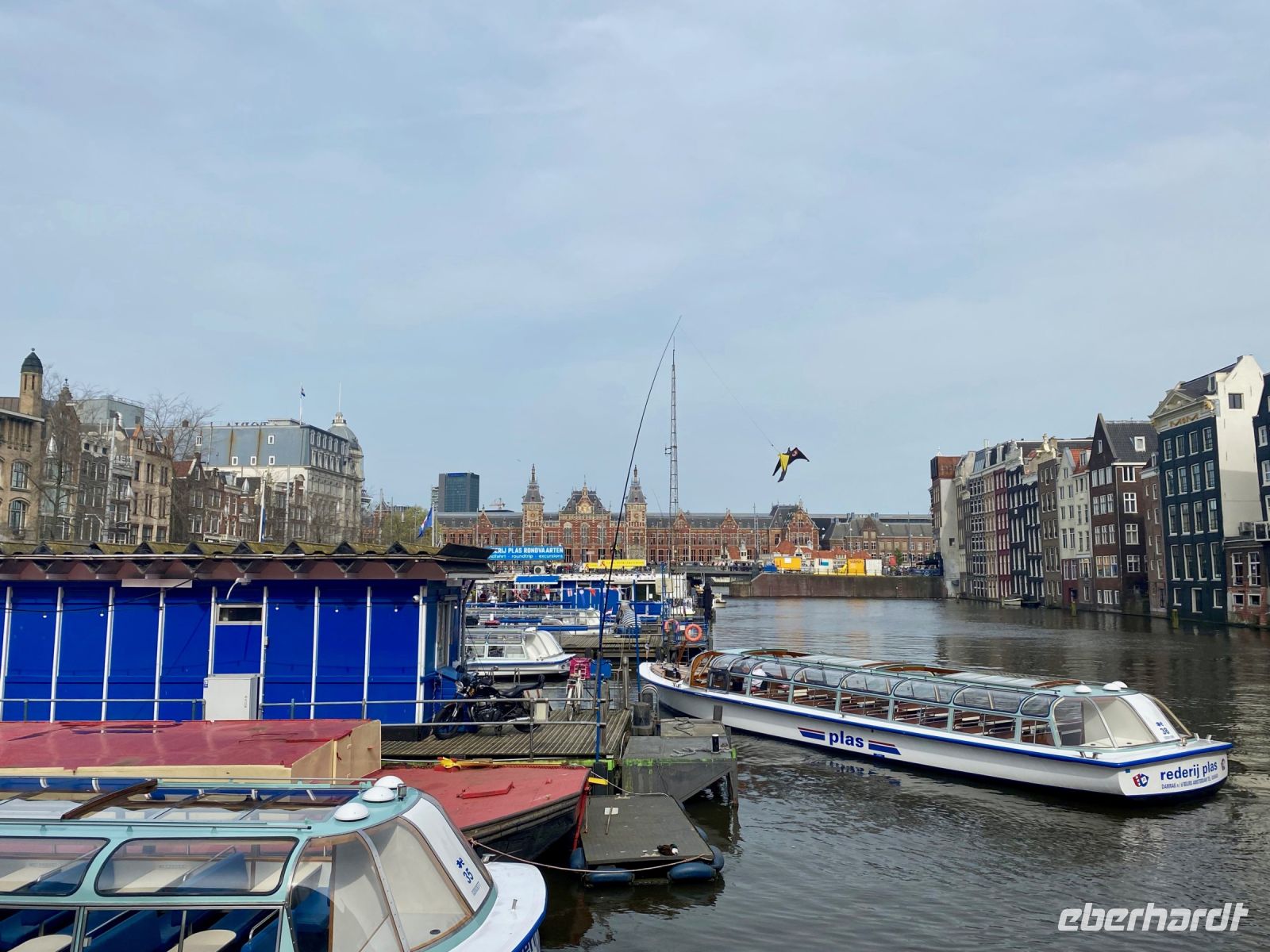 Die Fahrt endet nach einer kurzweiligen Stunde voller Eindrücke vor dem gewaltigen Hauptbahnhof Amsterdam Centraal, der gleich mehrere Anlegestellen hat. Das Gewirr von Straßenbaustellen hier erinnert etwas an einige deutsche Städte. Zu Fuß geht es nun noch die wichtigste Achse der Stadt, den Damrak entlang, bis zum königlichen Palais ins Herz der Innenstadt wo jeder den Nachmittag nach eigenem Interesse verbringen kann. Die zahlreichen großen und kleinen Cafés mit holländischen Pfannkuchen, Imbisse mit Pommes Frites in allen Varianten und Restaurants aller Art laden zum Verweilen ein. So mancher besucht einen der Flohmärkte oder ein Museum oder genießt ganz einfach das wundervolle schon sommerlich wirkende Wetter, das wir uns ja wohlverdient haben (siehe Keukenhof).
