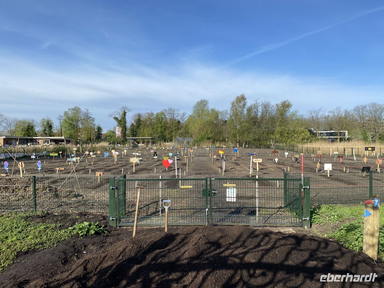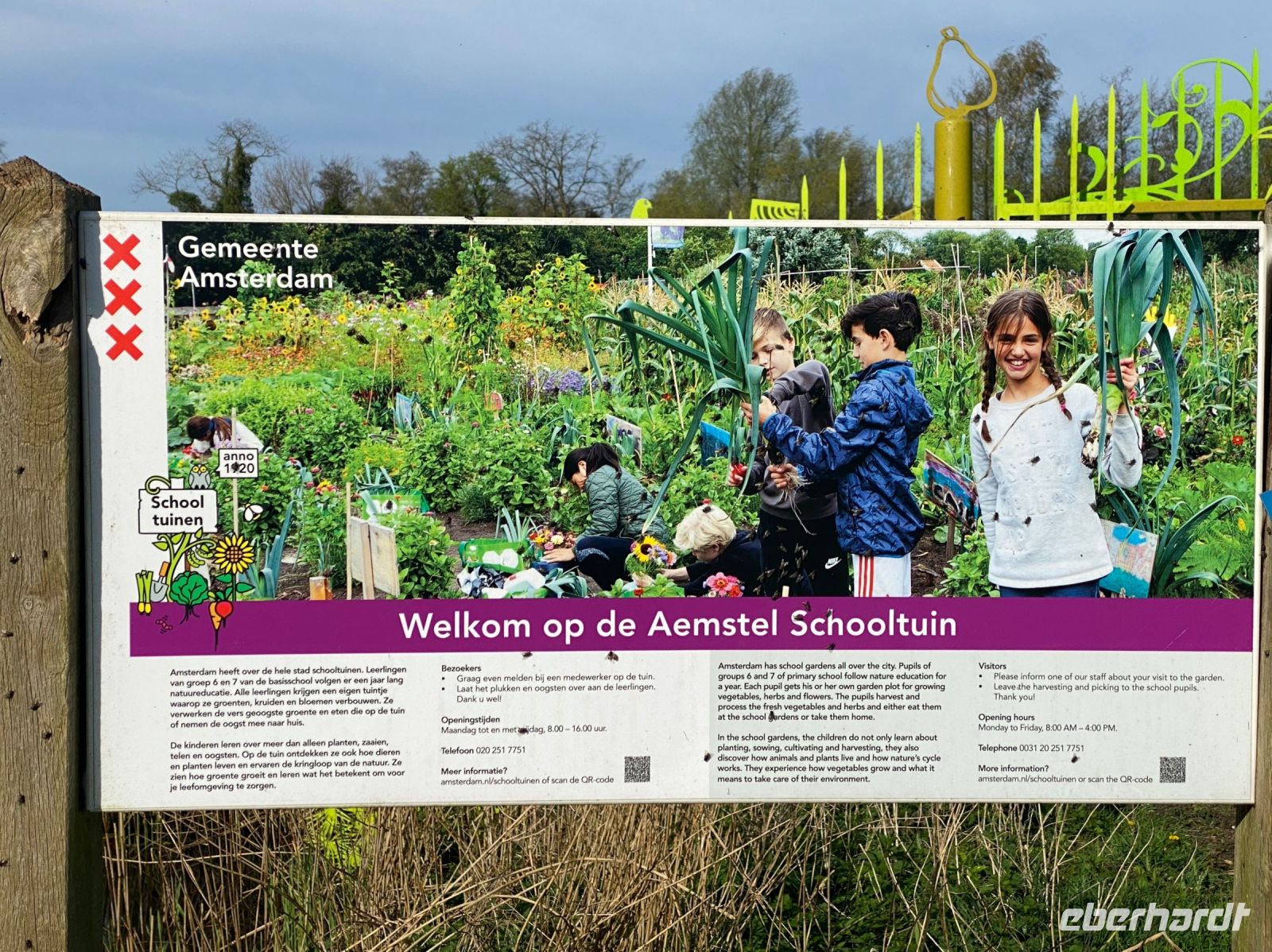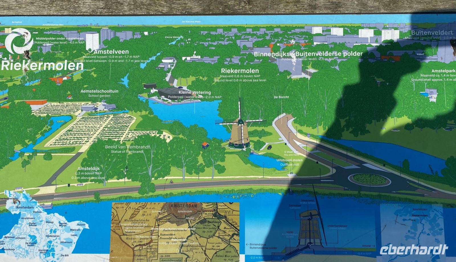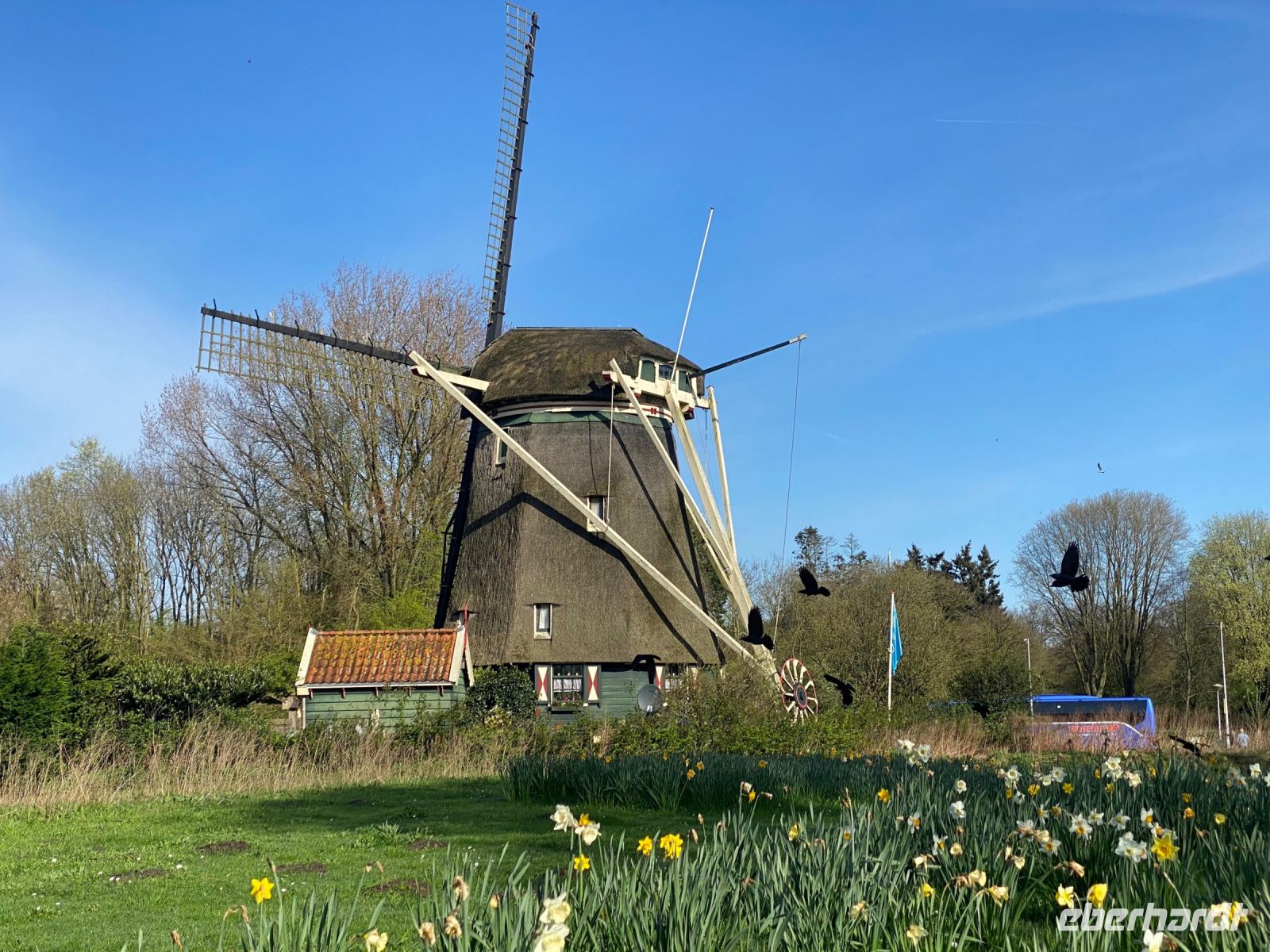 Unweit des Bauernhofes haben Amsterdamer Kinder einen Schulgarten angelegt, den wir passieren. Wir besuchen noch die Riekermühle, eine der vielen Windmühlen, die in den Niederlanden als Wasserpumpen dienten. Nun wird diese wichtige Aufgabe schon lange mit moderner Technik bewältigt, die Mühle ist nun ein Baudenkmal und der perfekte Fotohintergrund für uns bei strahlendem Frühlingswetter, bevor wir ins Zentrum Amsterdams weiterfahren