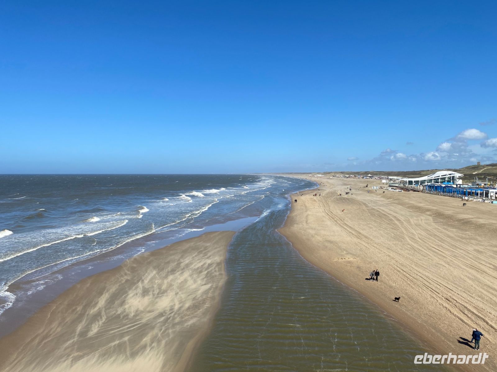 Hier hat der Wind ganze Arbeit geleistet, die Regenwolken sind verjagt, den Rest unserer Reise herrscht Sonnenschein und herrliches Wetter, wohlverdient von uns wetterfesten Reisenden. Weit im Süden des riesigen Strandes sieht man unzählige Kitesurfer, die sich über den nun sonnigen und immer noch ziemlich starken Wind freuen.